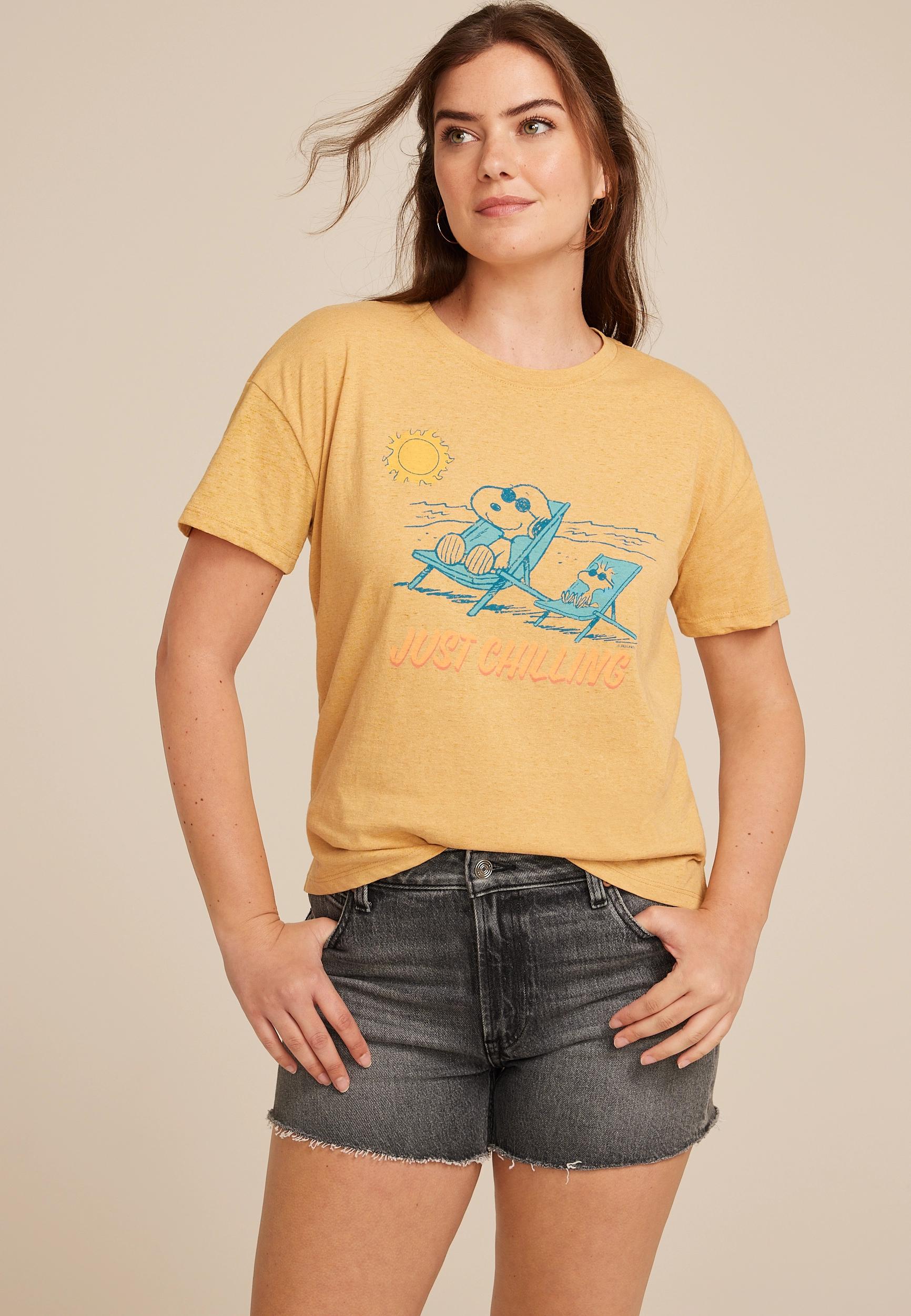 Extra relaxed and trend-right for cool gals and comfort lovers alike. .mar-pdp-section .mar-product-description {color: #000;}.mar-pdp-section .mar-product-description ul, .mar-pdp-section .mar-product-description ul>li {margin-left: 10px;padding-left: 10px;}.mar-pdp-section .mar-product-description .mar-product-description-content ul li{list-style-type: disc;margin: 0 0 5px;padding-left: 5px;}.mar-pdp-section .mar-product-description p {color: #000;padding: 5px 0;}@media only screen and (max-width: 1023px){.mar-pdp-section .mar-product-description .mar-product-description-content ul li{list-style-type: disc !important;} .mar-pdp-section .mar-product-description .mar-product-description-content .mar-tab-content ul{padding-left: 10px;}.mar-pdp-section .mar-product-description .mar-product-description-content .mar-tab-content {font-weight: 300;}} Features: comfortable fabric easy stretch solid versatile color licensed Peanuts inchJust Chilling inch Snoopy and Woodstock beach graphic crew neck short sleeves straight hem