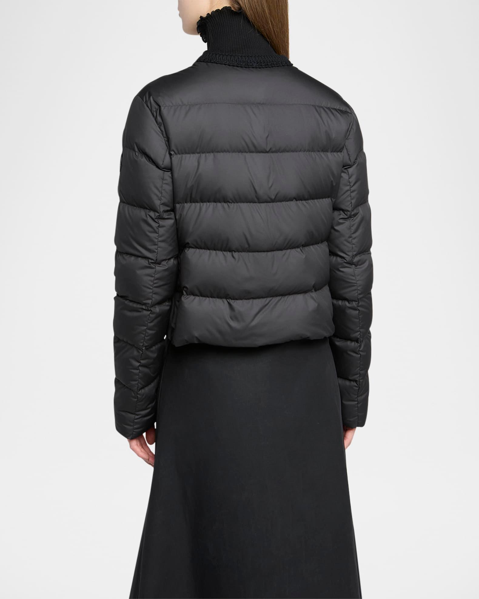 Moncler "Mauvezin" quilted puffer jacket embellished with a heavy knit collar and gold-tone hardware Round neckline Long sleeves Tonal leather logo patch at left sleeve Side zip pockets Classic fit Hem sits at the hip Two-way zip-front Polyester/leather Fill: Down/feather Lining: Polyester Hand wash Imported