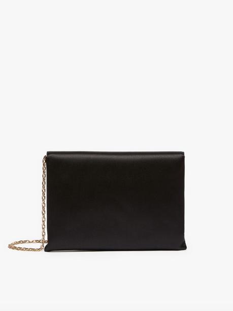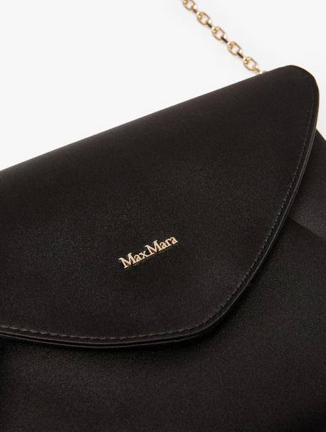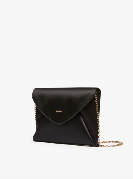 Flat, envelope-shaped clutch made of viscose and silk satin. The design is enriched by a detachable, light gold-coloured chain shoulder strap, for wearing on the shoulder or carrying by hand. Lined in camel-coloured microfibre with a soft texture. Finished with the Max Mara logo on the front flap. Magnetic closure. Measurements: 24 x 20 x 17.5 cm.