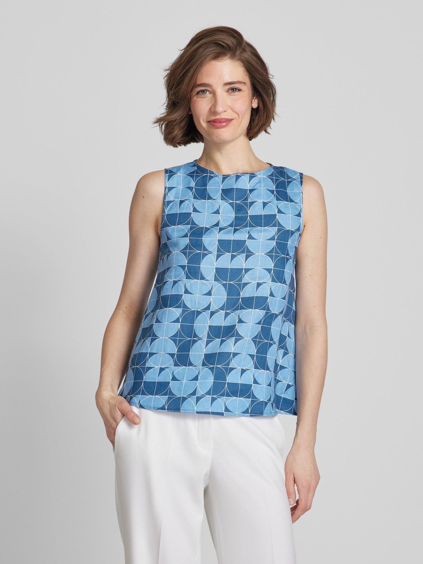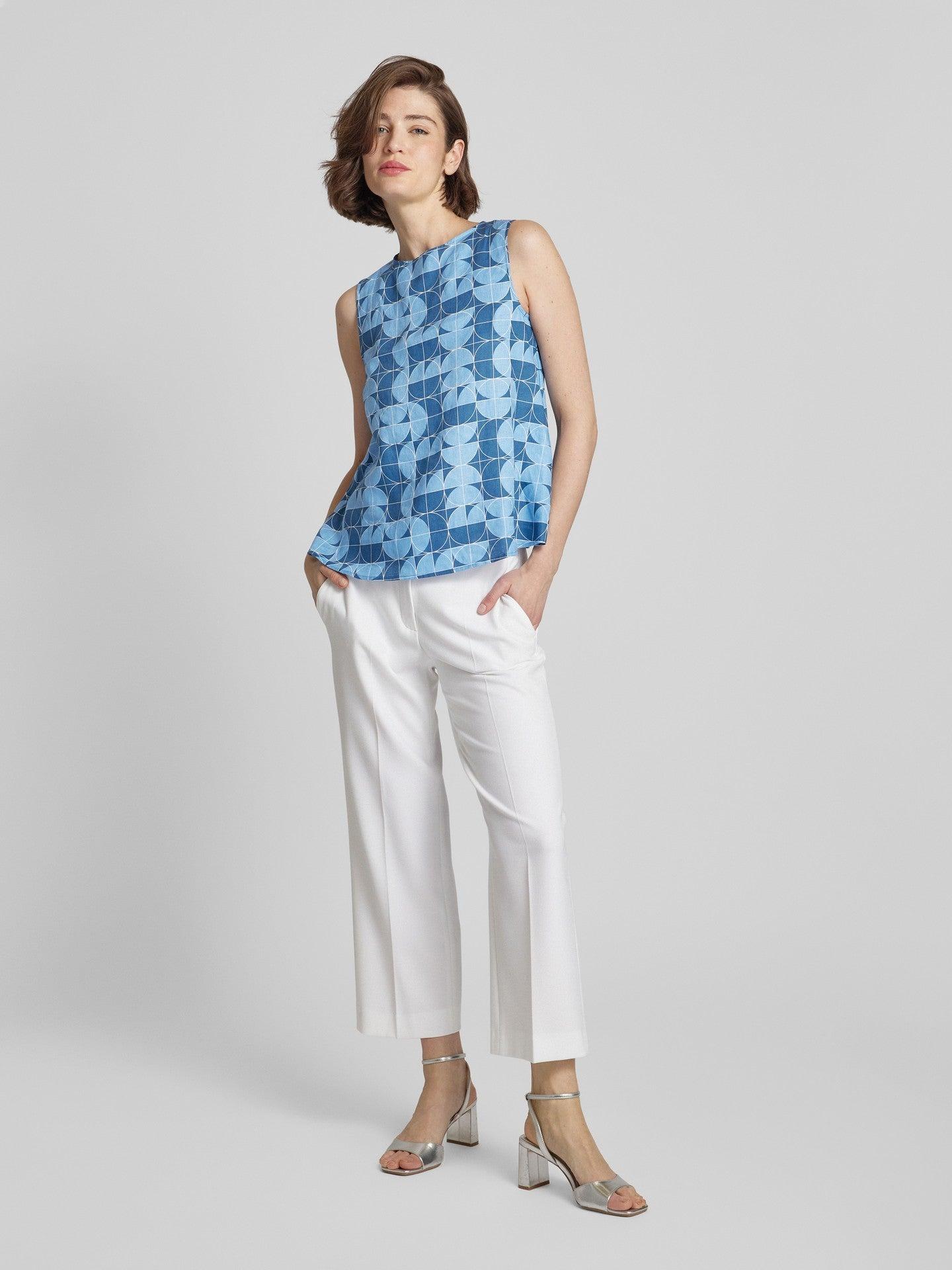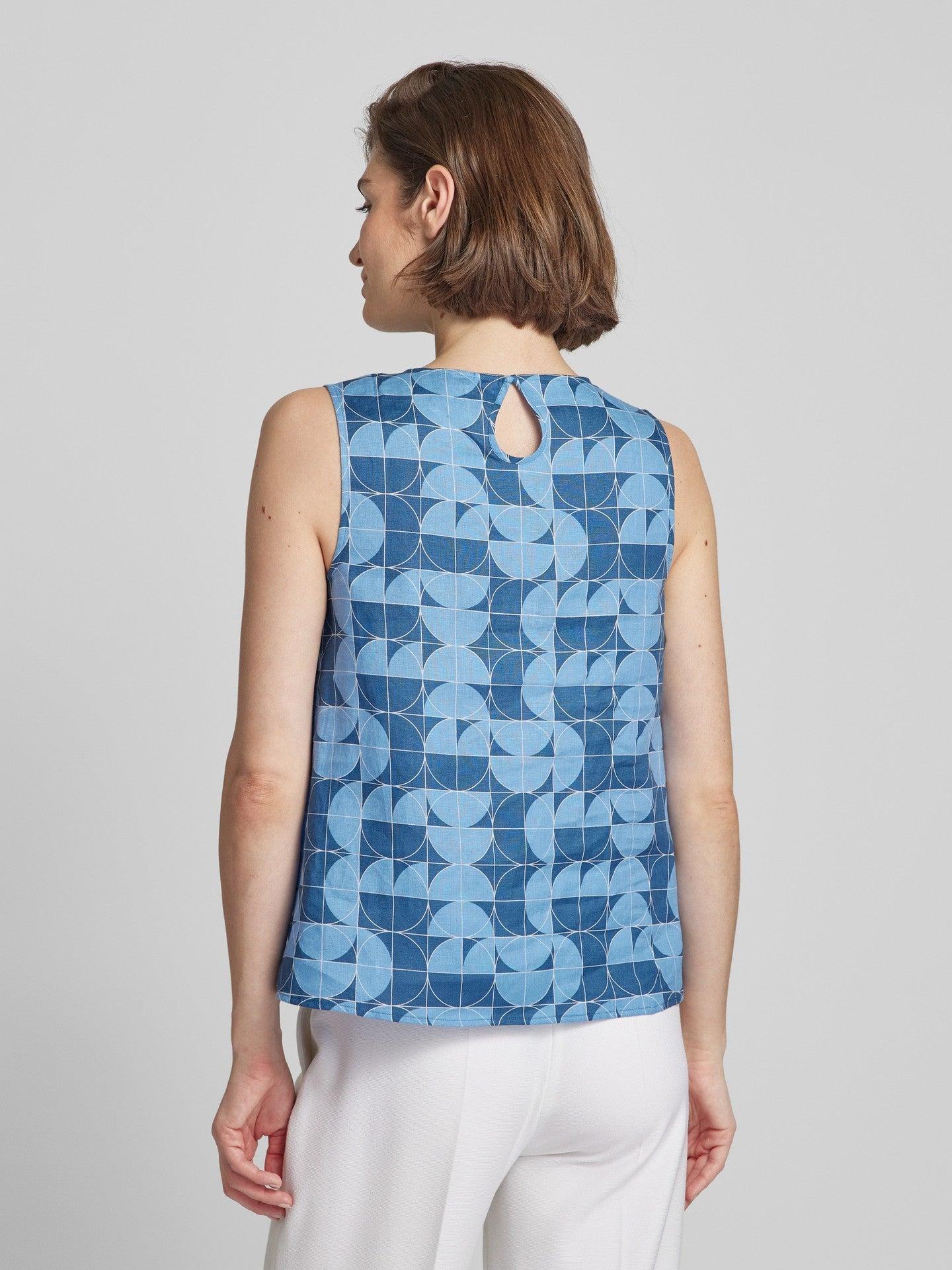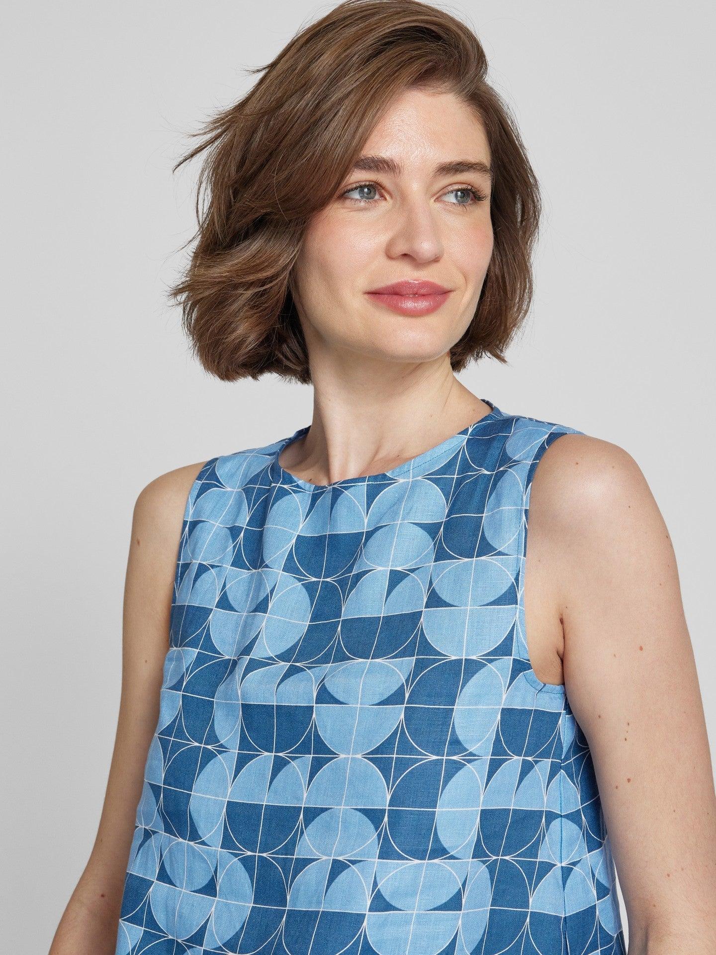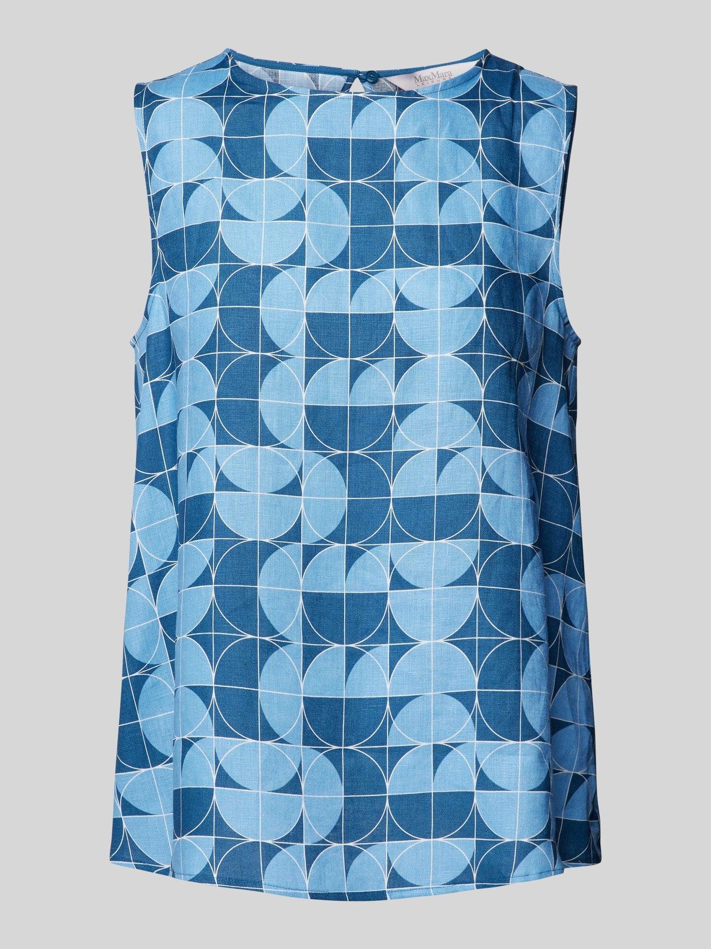 This Max Mara Guisy Printed linen top is perfect for warm weather with its lightweight linen fabric. The flared A-line cut and small button fastening keyhole detail add a touch of elegance. Stay cool and stylish in this sleeveless top.