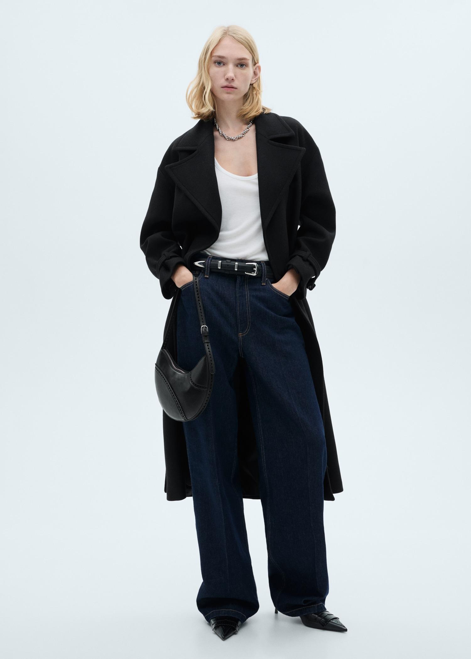 Italian Manteco wool fabric. Heavy structure. Long design. Oversize design. Lapel-collar. Long sleeve. Decorative buckles on the cuffs. The ecru color has a total look. Adjustable belt. Inner lining. Side length 38.43 in. Back length 48.82 in