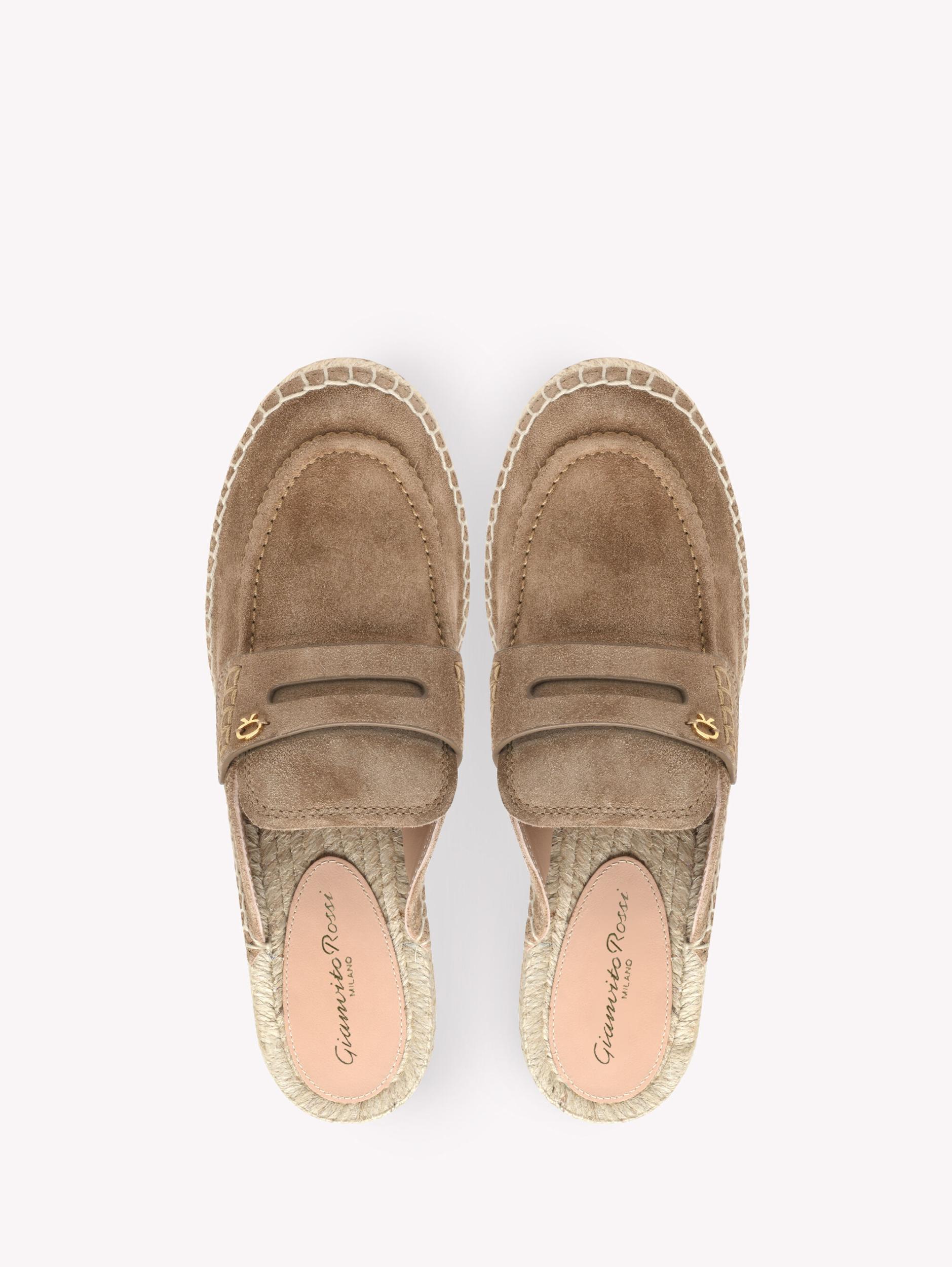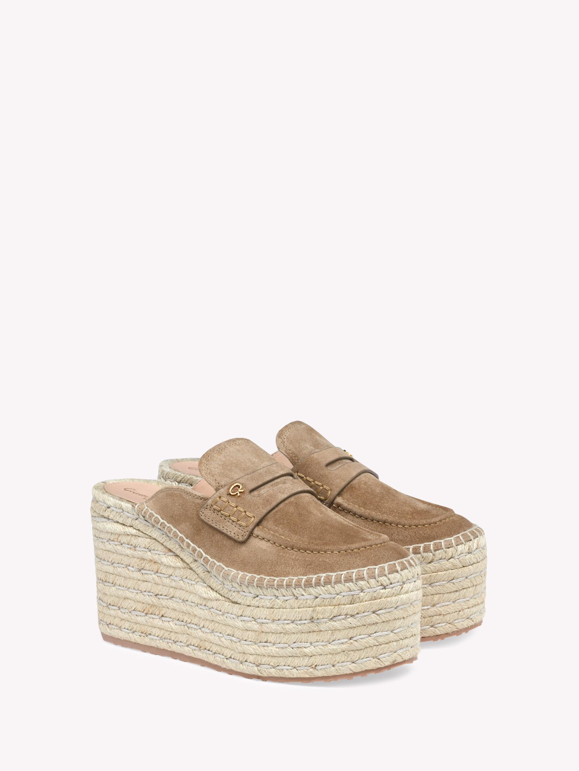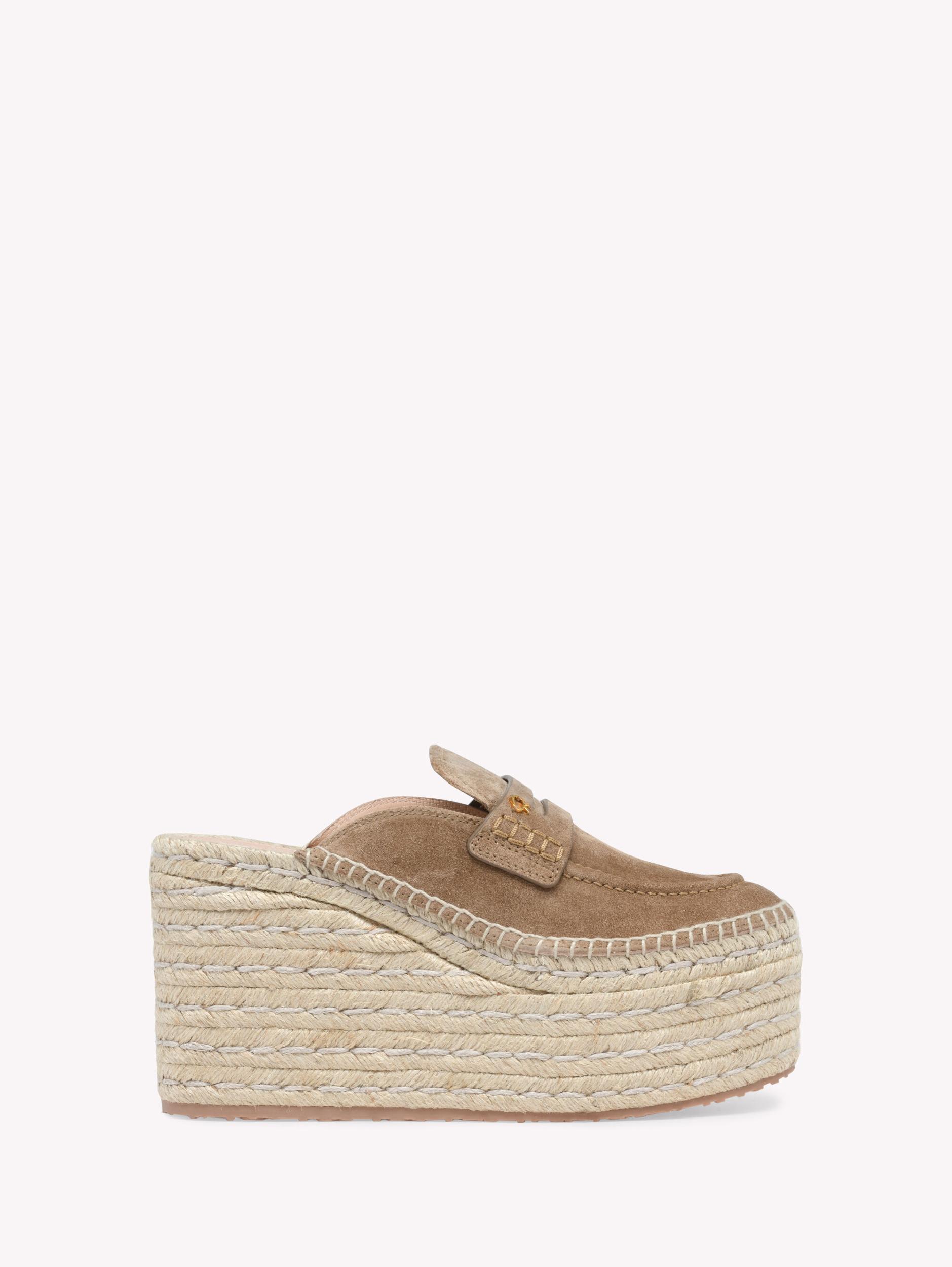 Crafted from soft suede, Maxilla is a round toe slip-on moccasin with a penny bar and mini Ribbon detail. The braided jute wedge is completed with a rubber sole and measures 100mm at the back of the heel. Handmade in Spain.