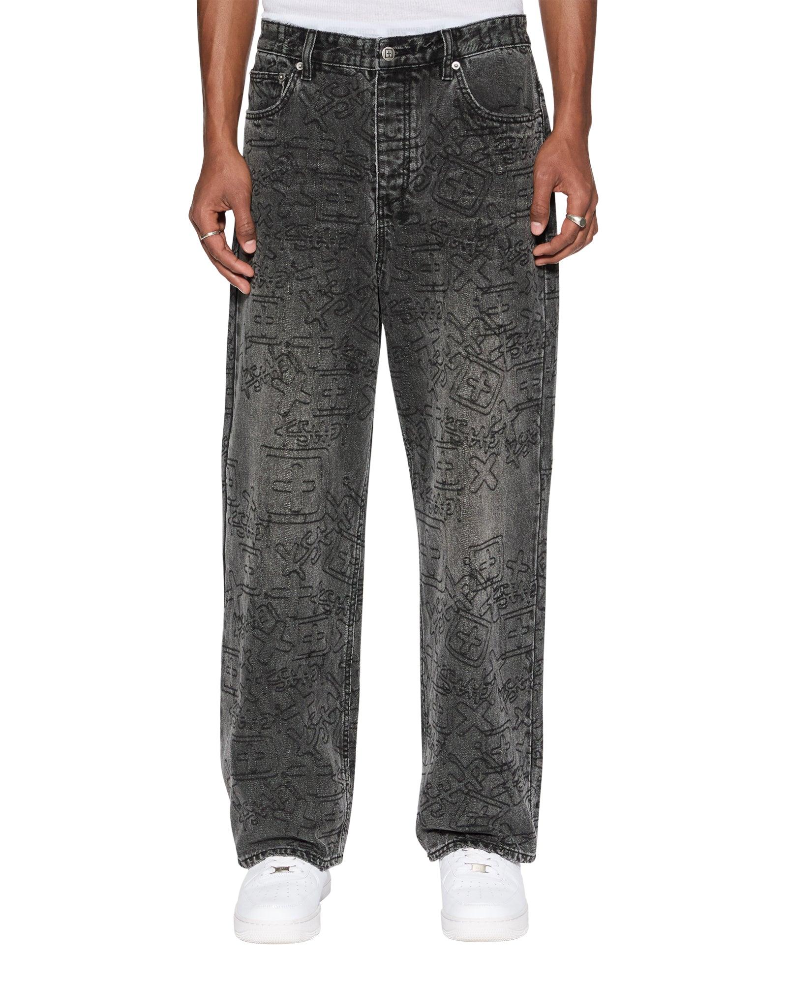 The Maxx Stencil Stitch is an exaggerated straight leg jean with a long rise, crafted from rigid black denim with a heavy stone wash. It features full garment embroidered artwork and is finished with signature t-box and 4x4 embroidery and Ksubi branded hardware.