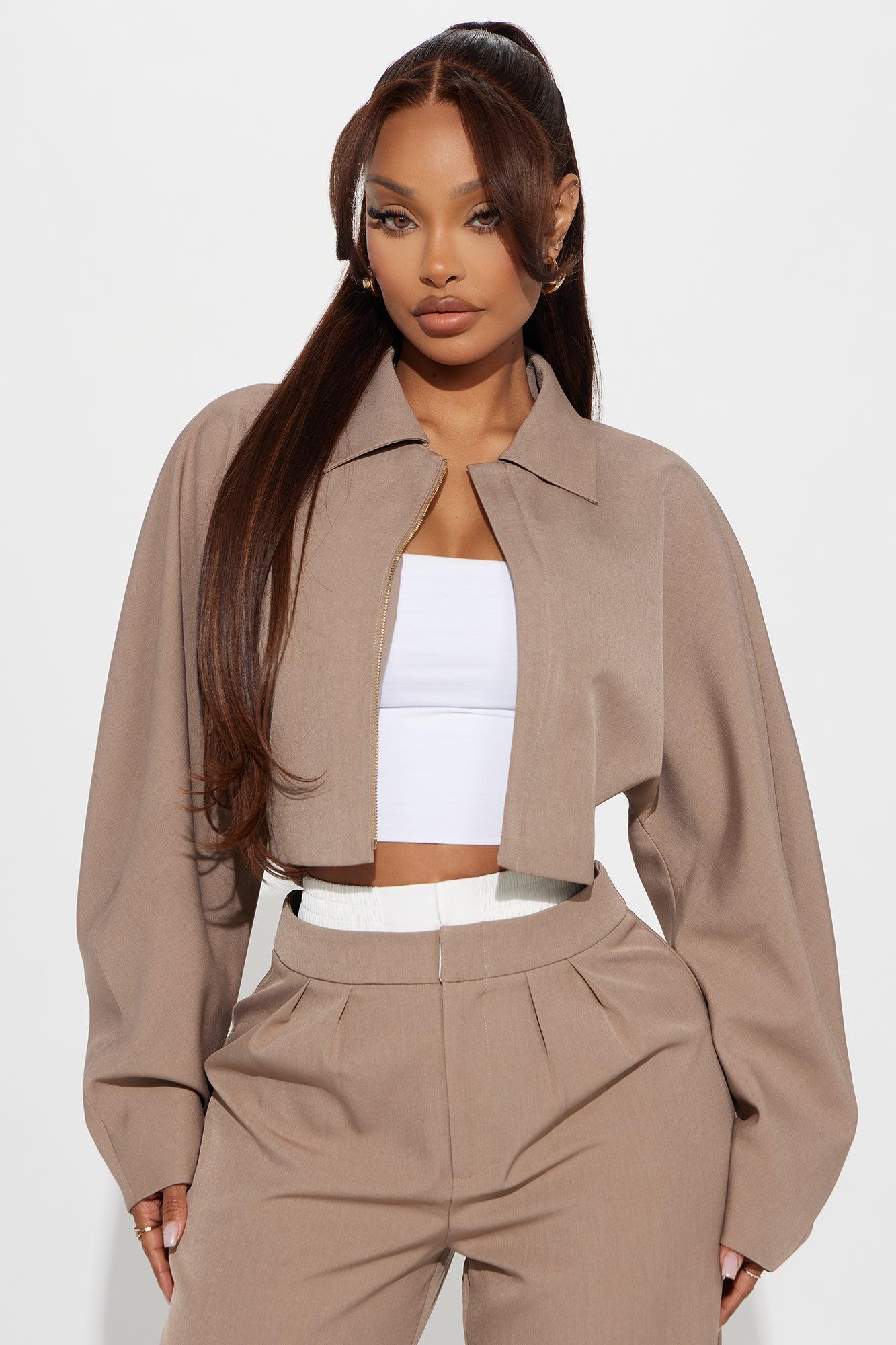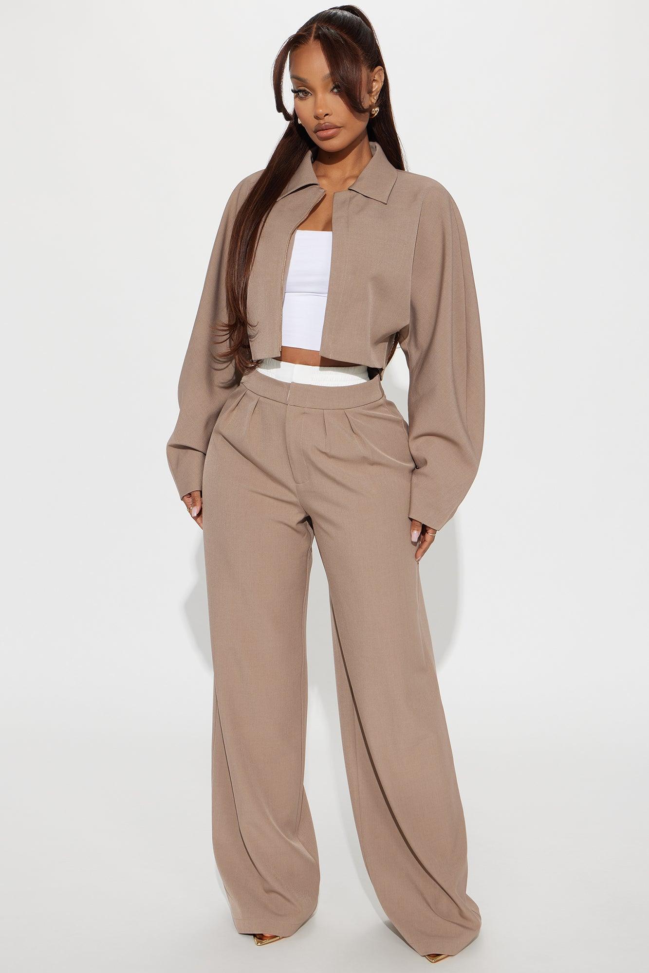 Available In Taupe And Black. Pant Set Long Sleeve Shirt Collar Hidden Zip Front Wide Leg Pant Contrast Waistband Clasp And Zipper Closure Non Stretch 33" Inseam Self: 95% Polyester 5% Spandex Lining: 100% Polyester Imported