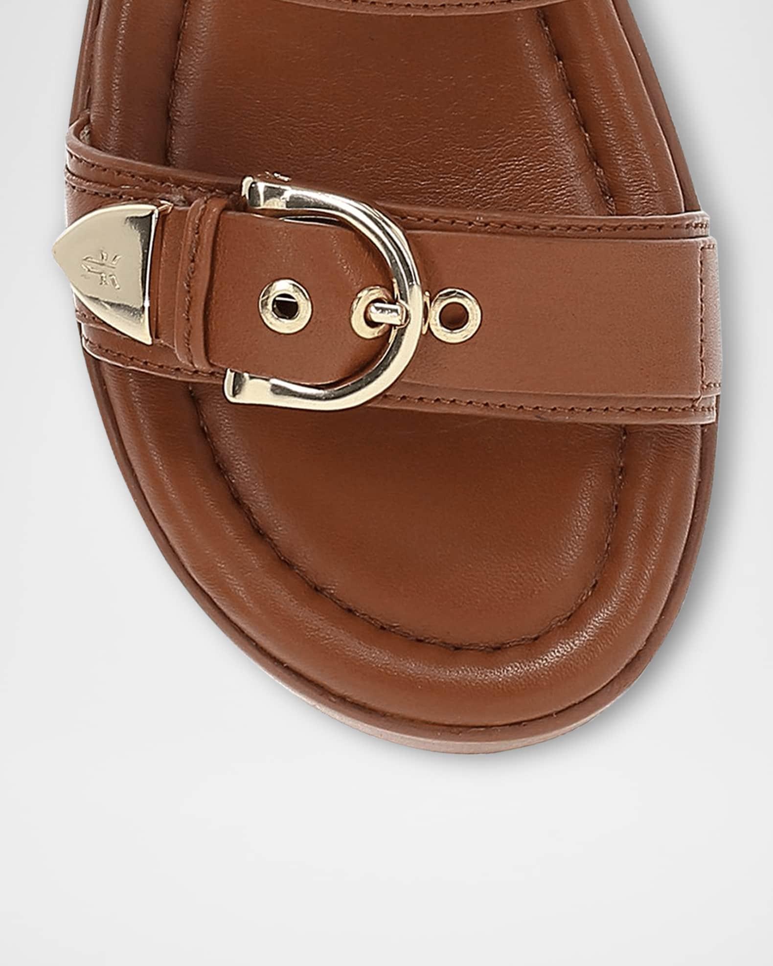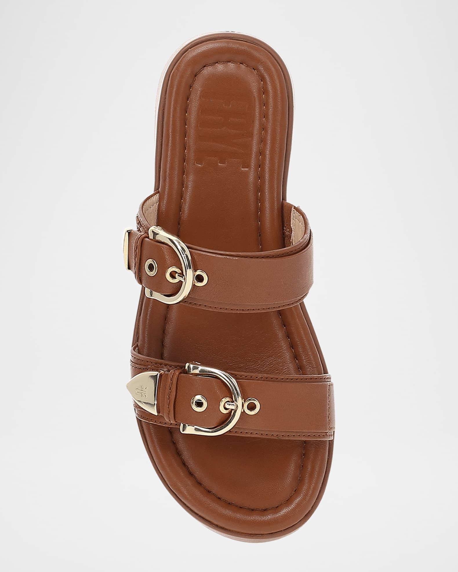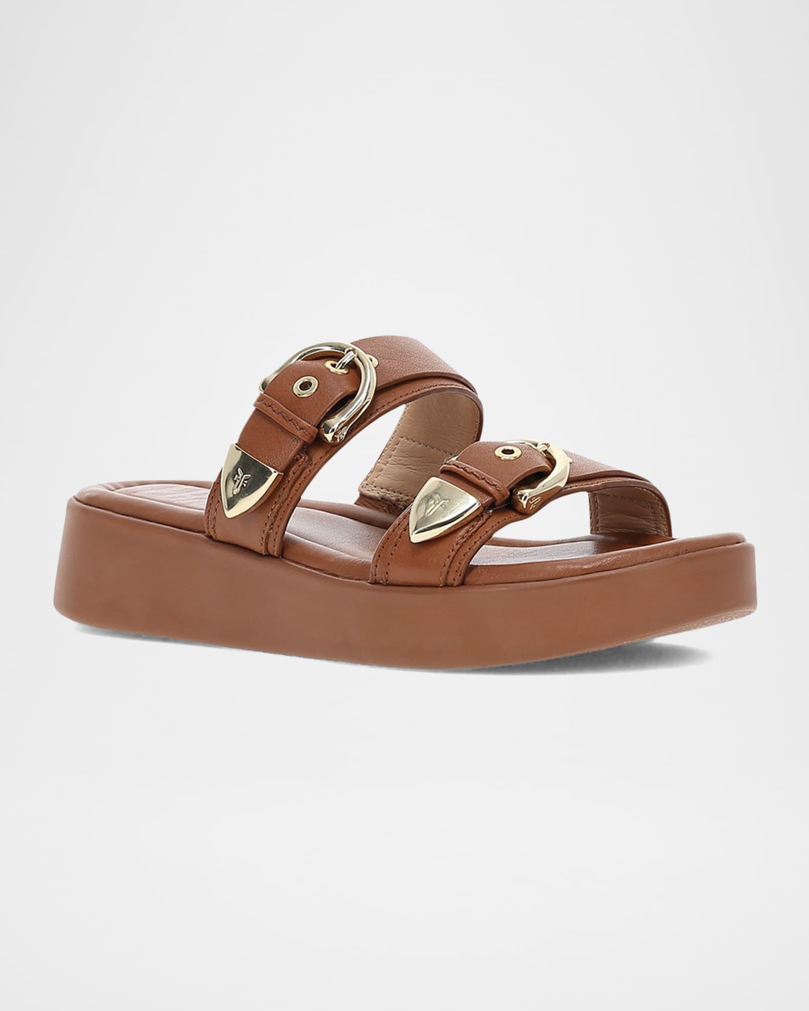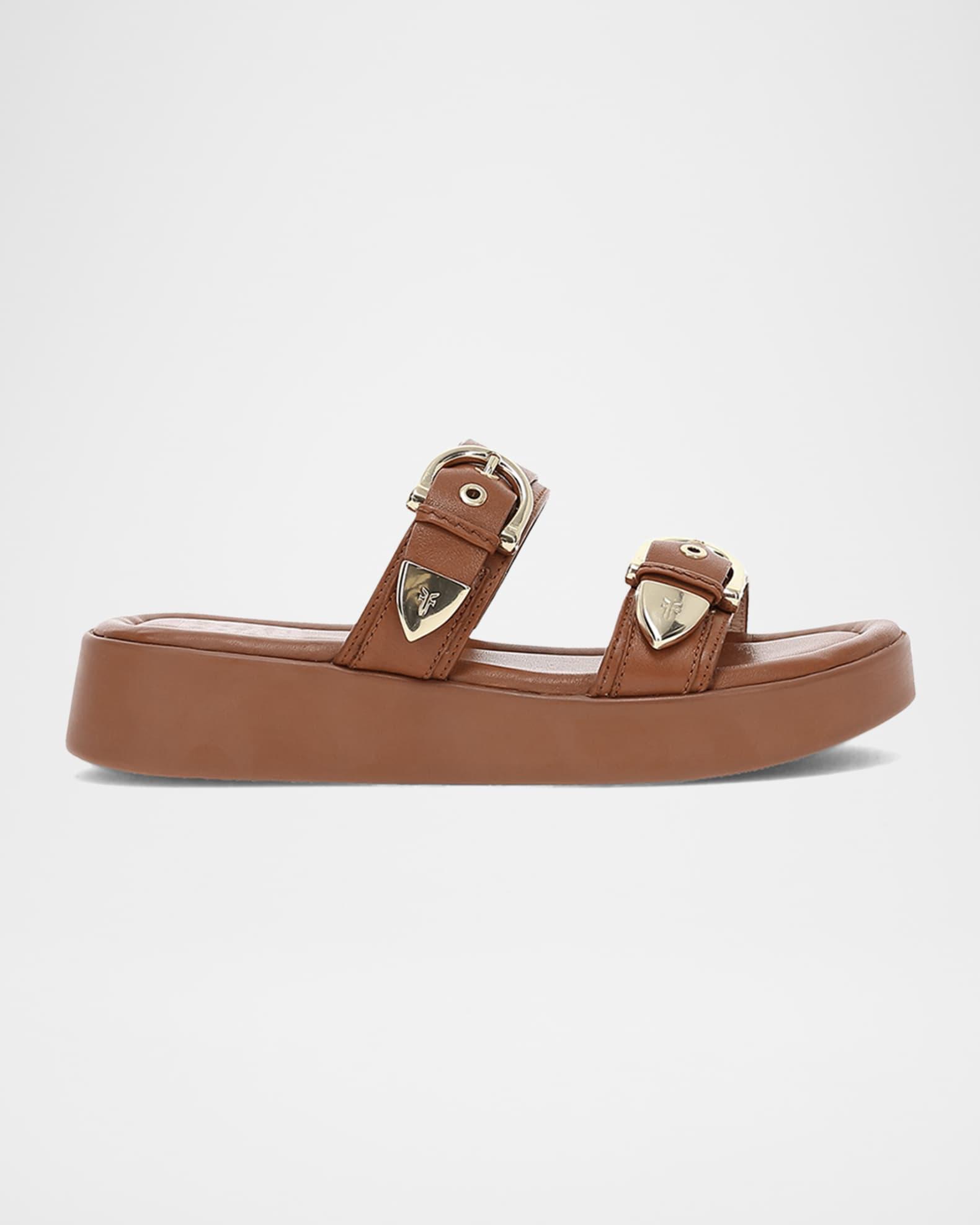 Frye "Maya" sporty sandals, a stylish twist on a classic design with elegant buckle and strap detailing. Handcrafted from soft leather, ensuring both durability and a luxurious feel, while the EVA outsole and platform heel provide lightweight support and all-day comfort. Versatile and chic, pair them with linen pants and an off-the-shoulder top for warm weather or wear with a flowy skirt, a lightweight sweater, and a blazer for a layered look. 1.50 in / 40 mm platform heel; 1.00 in / 25 mm platform Open toe Dual buckle upper Slide style Lightweight, flexible EVA outsole Lining: Leather Spot clean Imported