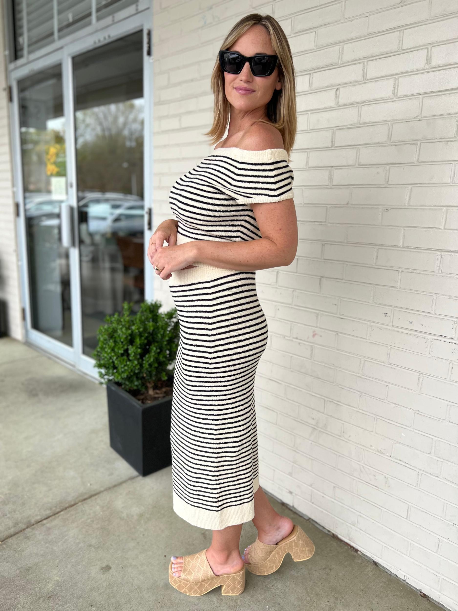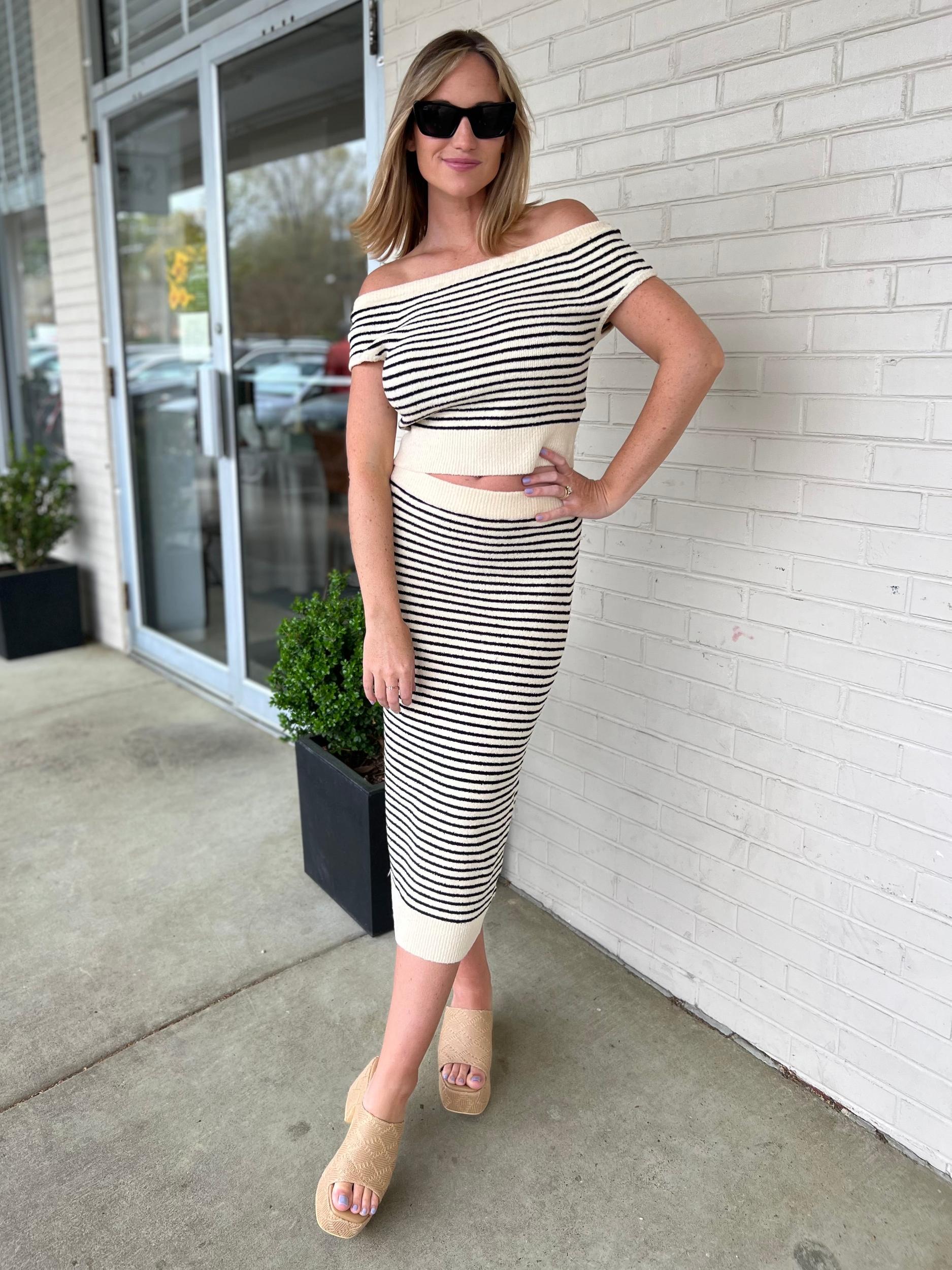 Get ready to strut your stuff in the Maya Knit Skirt! This cozy beige and black pencil skirt features flattering horizontal stripes and a stretchy elastic waistband for all-day comfort. Perfect for pairing with the Maya Knit Top for a stylish and comfortable look. Bring on the compliments!