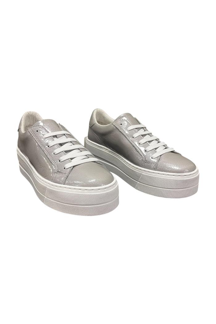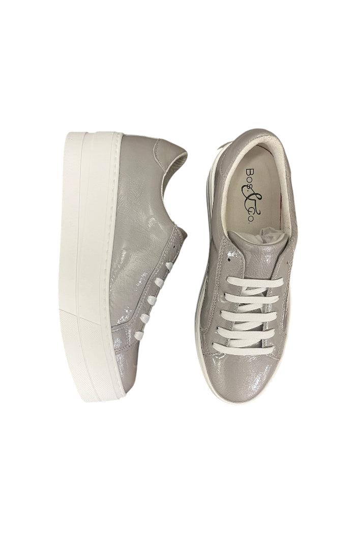 Sleek and sophisticated, these platform sneakers bring effortless style to any outfit. Grafted glossy leather in a chic neutral hue, they offer a polished yet modern look. The crisp white laces and cushioned collar provide a secure, comfortable fit, while the elevated sole adds a trendy boost of height. Perfect for pairing with everything from casual to dressy ensembles.