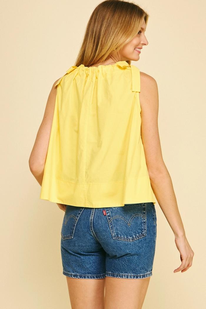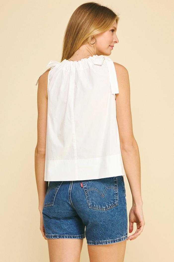 These stylish sleeveless tops feature the same gathered neckline design with shoulder tie details, shown in two color options. The first image displays a crisp white version paired with denim shorts, while the second showcases a cheerful sunshine yellow variation with the same classic denim pairing. Both tops have a relaxed, slightly boxy silhouette with a gathered elastic neckline that creates soft volume, and decorative ribbon ties at the shoulders add a feminine touch. The lightweight fabric and airy design make these versatile pieces perfect for warm weather styling.