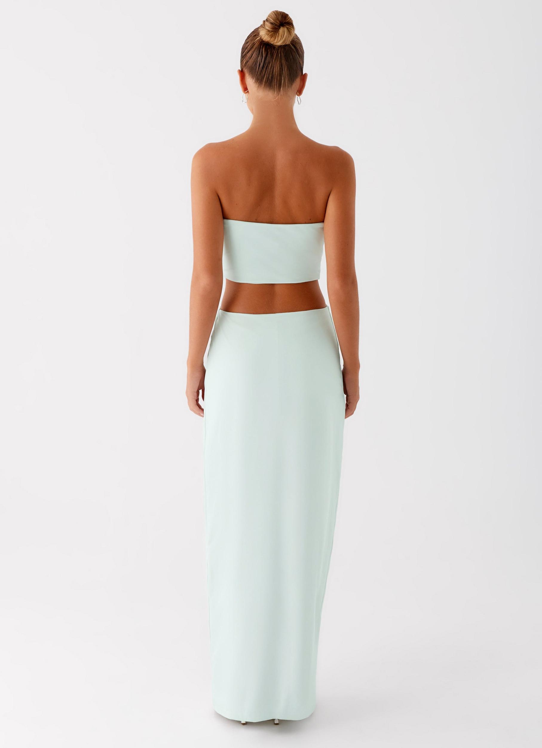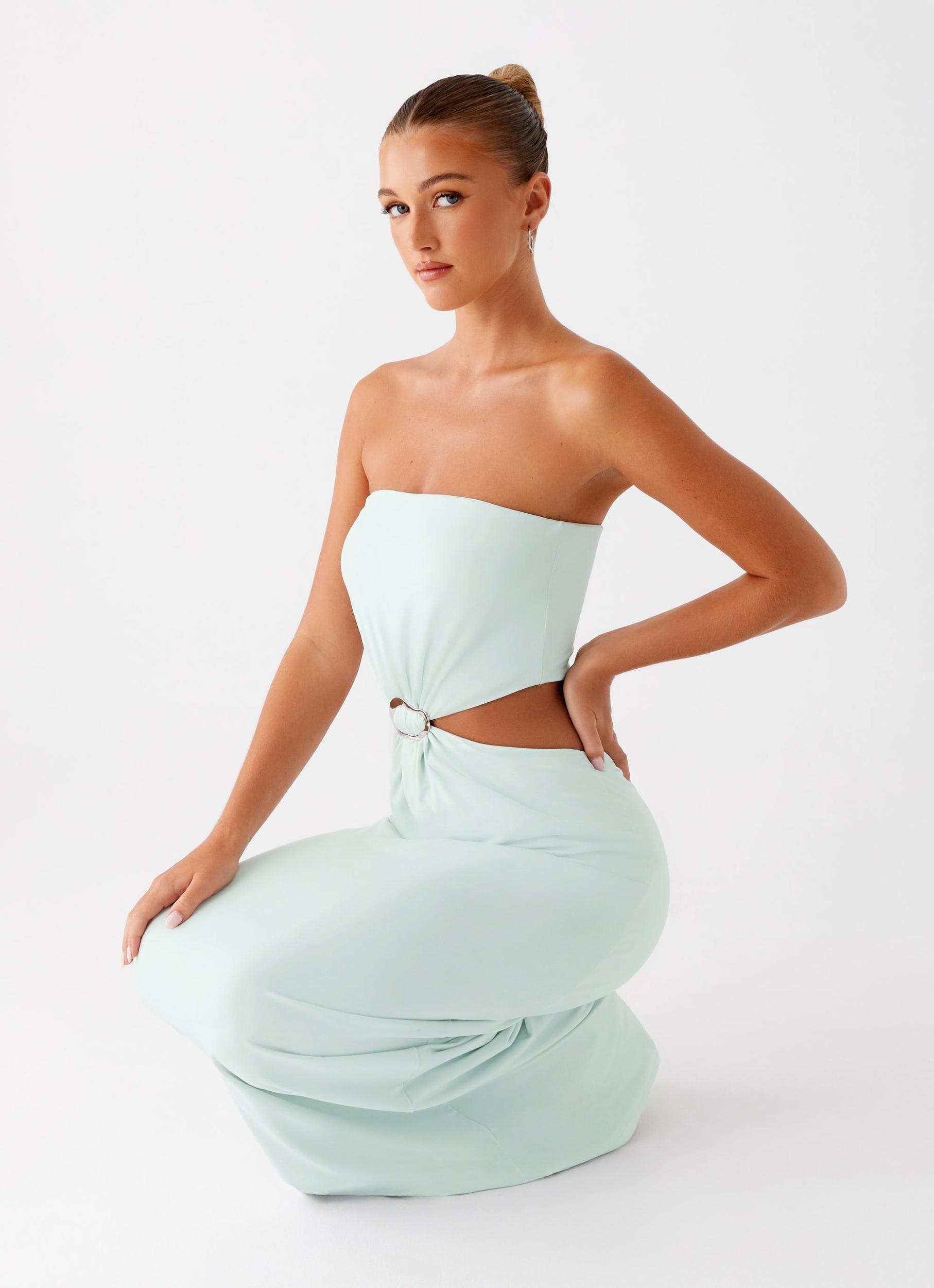 Peppermayo Exclusive The Mayfair Maxi Dress exudes effortless elegance with its strapless neckline, front ruching detailing, and bold front metal embellishment. Featuring side cut-outs and a back cut-out for a touch of sultriness, this maxi-length dress is a statement of chic sophistication. Size AU 8 / US 4 garment measurements: Length: 133 cm / 52.36 inBust: 72 cm / 28.35 inWaist: 64 cm / 25.20 inHem: 104 cm / 40.94 in Yasmin is 174cm and wearing a size AU 6 / and US 2