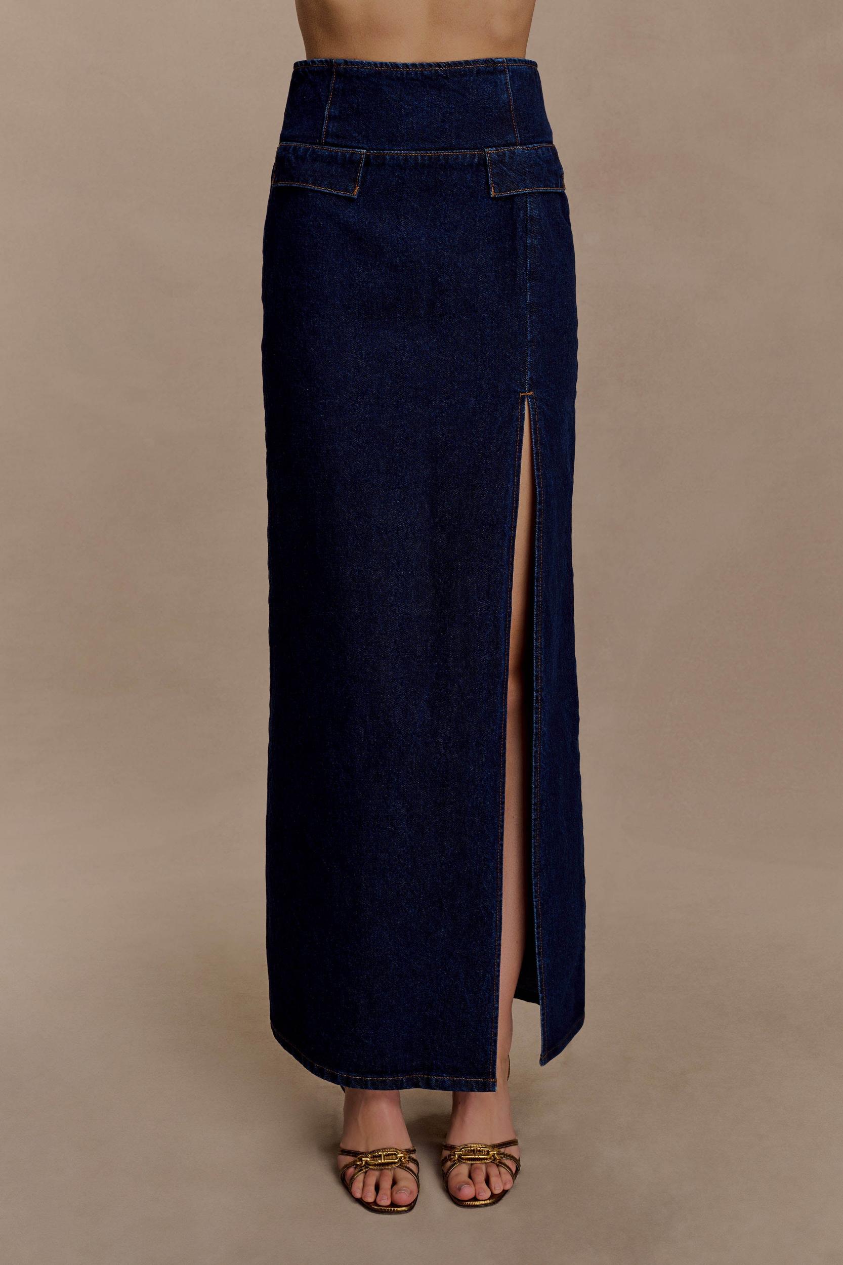 Elevated denim, modern silhouette. The MAYLENA High Rise Denim Maxi Skirt is cut to flatter with its super high-rise waistline and wide waistband panel. Designed with front pocket flaps for subtle structure, it features a sleek maxi length with a side leg split that adds movement and allure. A clean back zip closure completes the look, making this skirt a versatile piece that transitions seamlessly from casual daytime styling to refined evening edits.