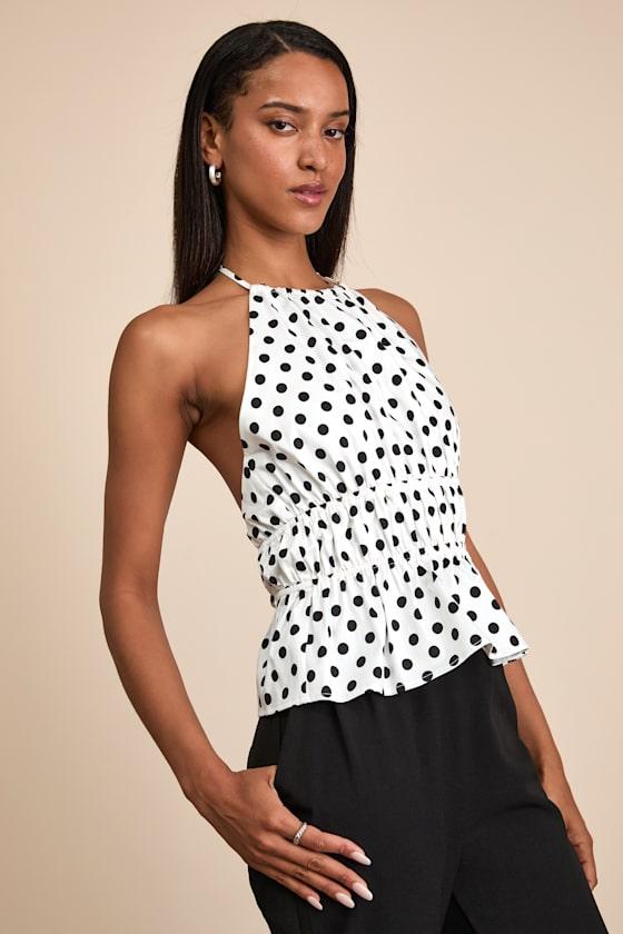 A chic spin on your summer aesthetic, this polka dot-adorned top serves effortless style with a lightweight cotton composition. The tying halter neckline supports a blousy bodice with elastic tiers that create a flirty peplum hem. Turn around to reveal an open back design that secures with cute twin ties.