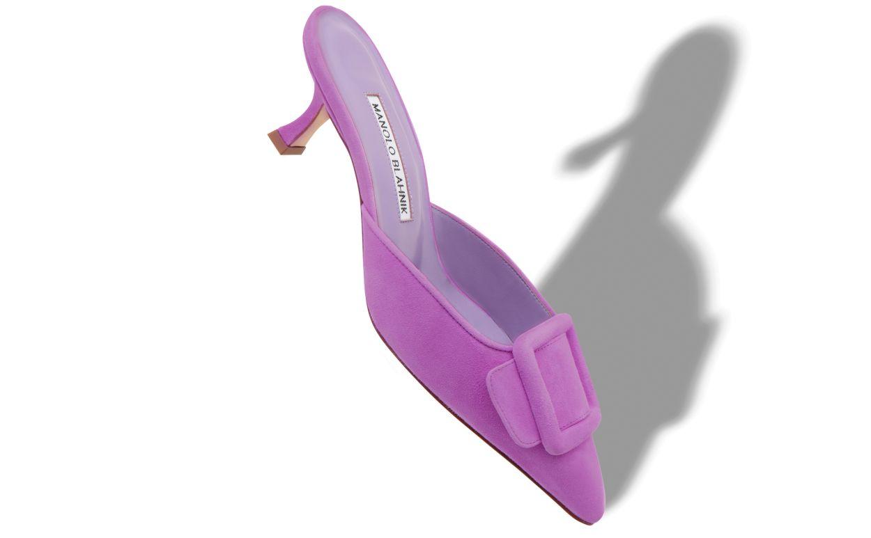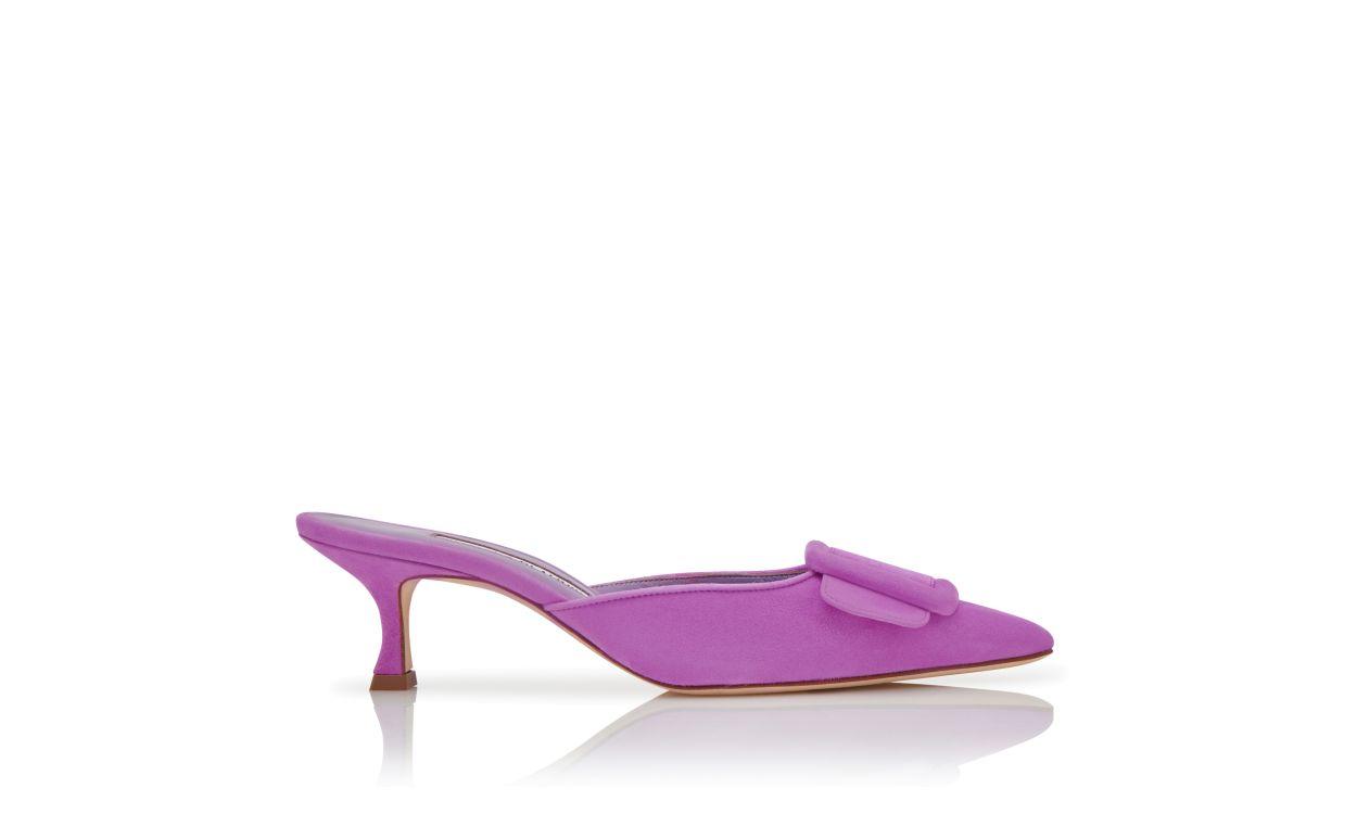 Purple suede pointed toe mules featuring decorative buckle and stiletto low heel.