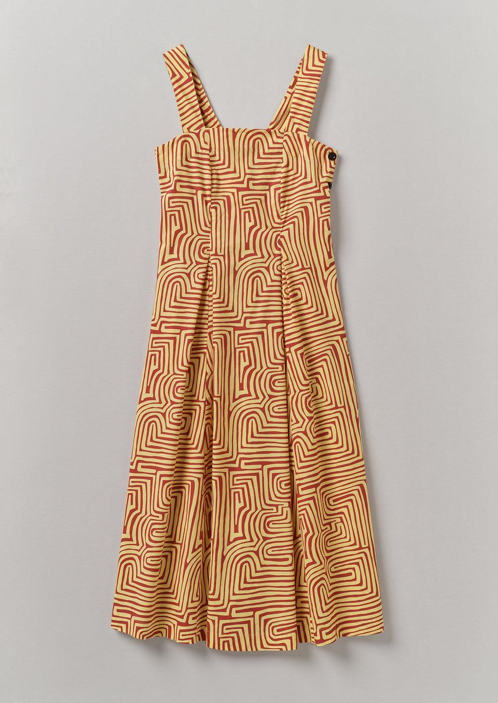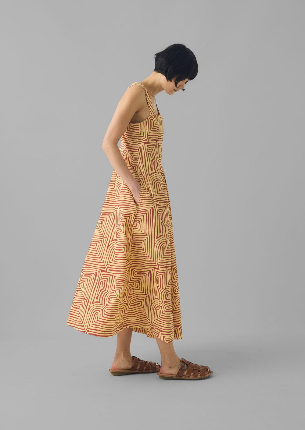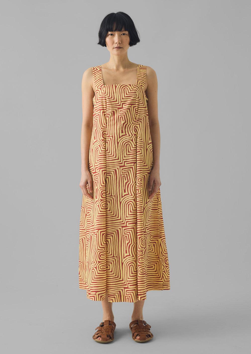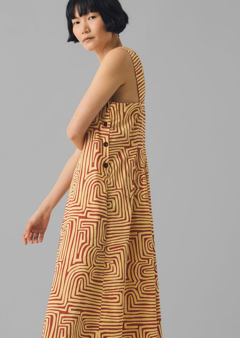 An abstract maze print patterns our dress, evoking memories of summers past. Made from cotton poplin with inverted pleats at the front and back. Featuring wide straps, hidden seam pockets and a button opening on the side.