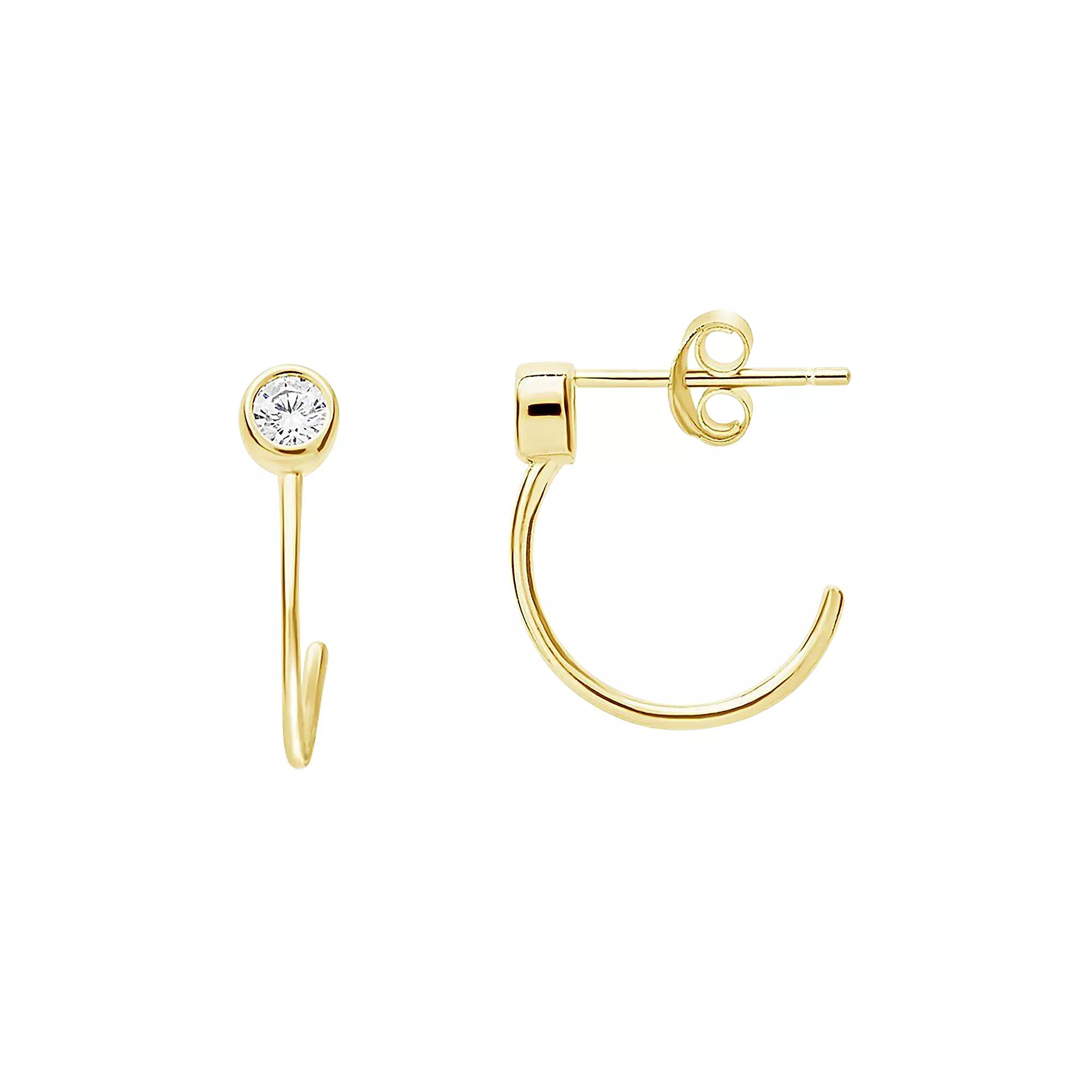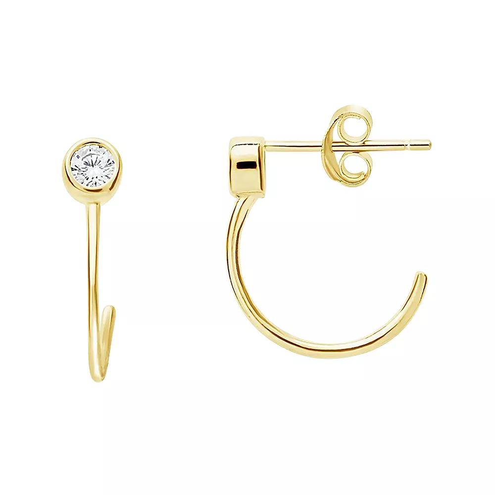These on-trend huggie hoop earrings feature a glitzy CZ stud stone that will keep everyone giving you a second glance. . 14K yellow gold plated sterling silver bezel set CZ open huggie hoop earrings. Post back. Imported 14K yellow gold plated sterling silver, cubic zirconia