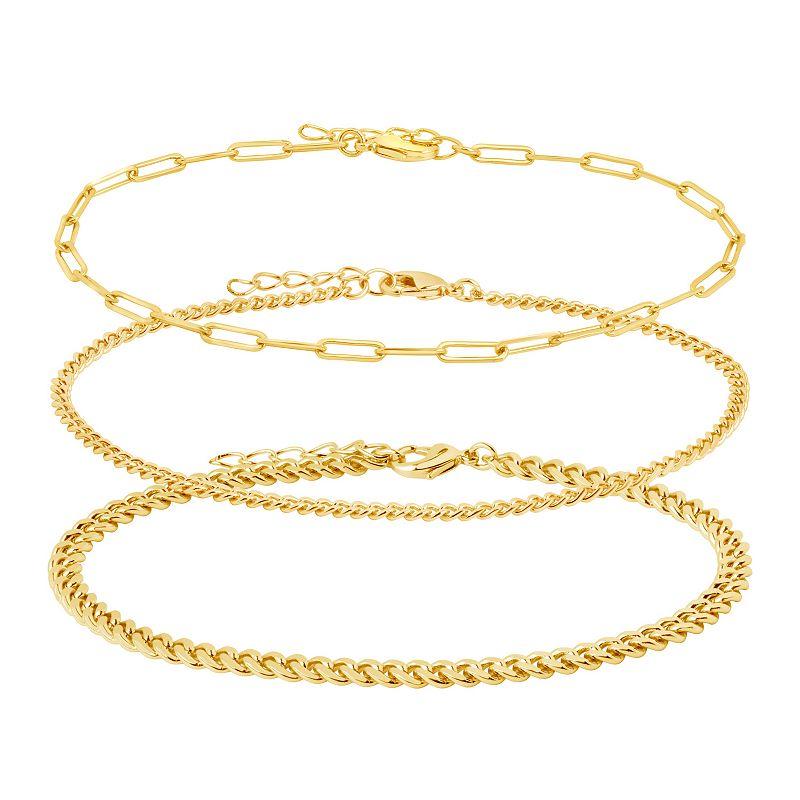 These three anklets are sure to add something special to your look! No matter how you stack or wear them, you'll shine bright wherever you go. The set features three different chain types | Sterling Forever Three Row Chain Anklet Set, Gold