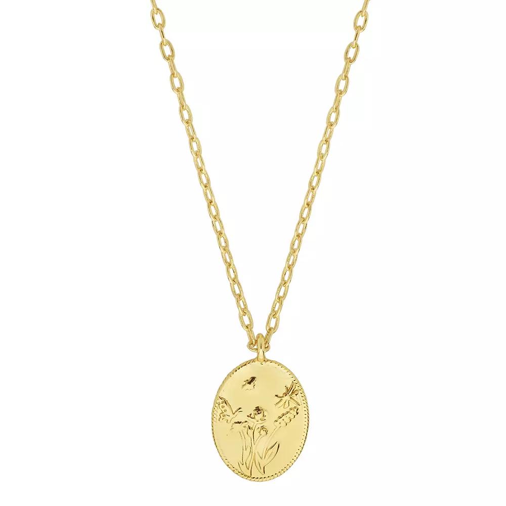 A beautiful garden scene brings whimsical charm to the pendant suspended from this chain necklace plated in 14-karat gold. 16 length; 2 extender; 3/4 pendant width Lobster clasp closure 14k-gold plate Imported