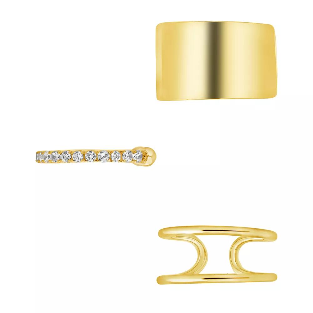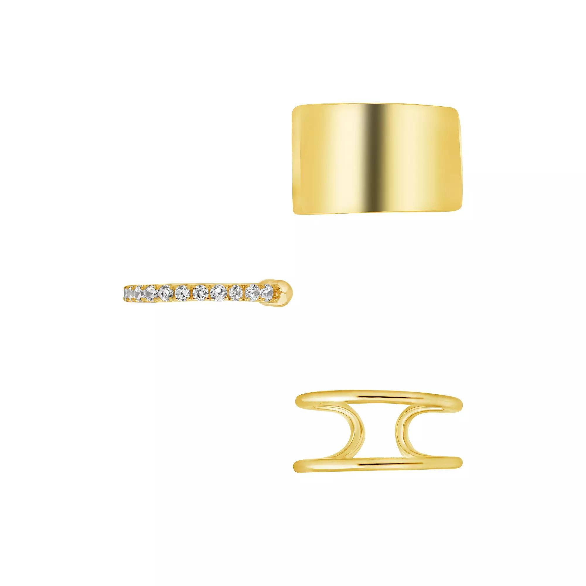 Love having an assortment of ear cuffs to add to that super-cute outfit of the day? This set of three, which includes a CZ-studded cuff, a solid cuff and an open cuff, is the perfect way to add a little visual interest to any look. | Sterling Forever Sterling Silver Simple Ear Cuff Set Of 3, Gold