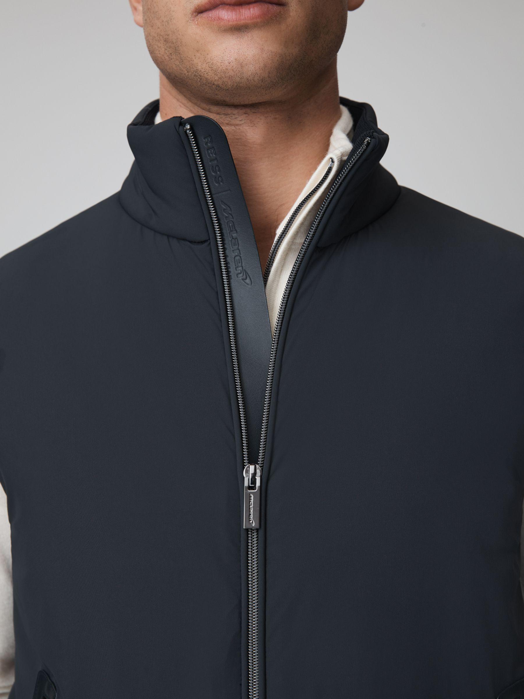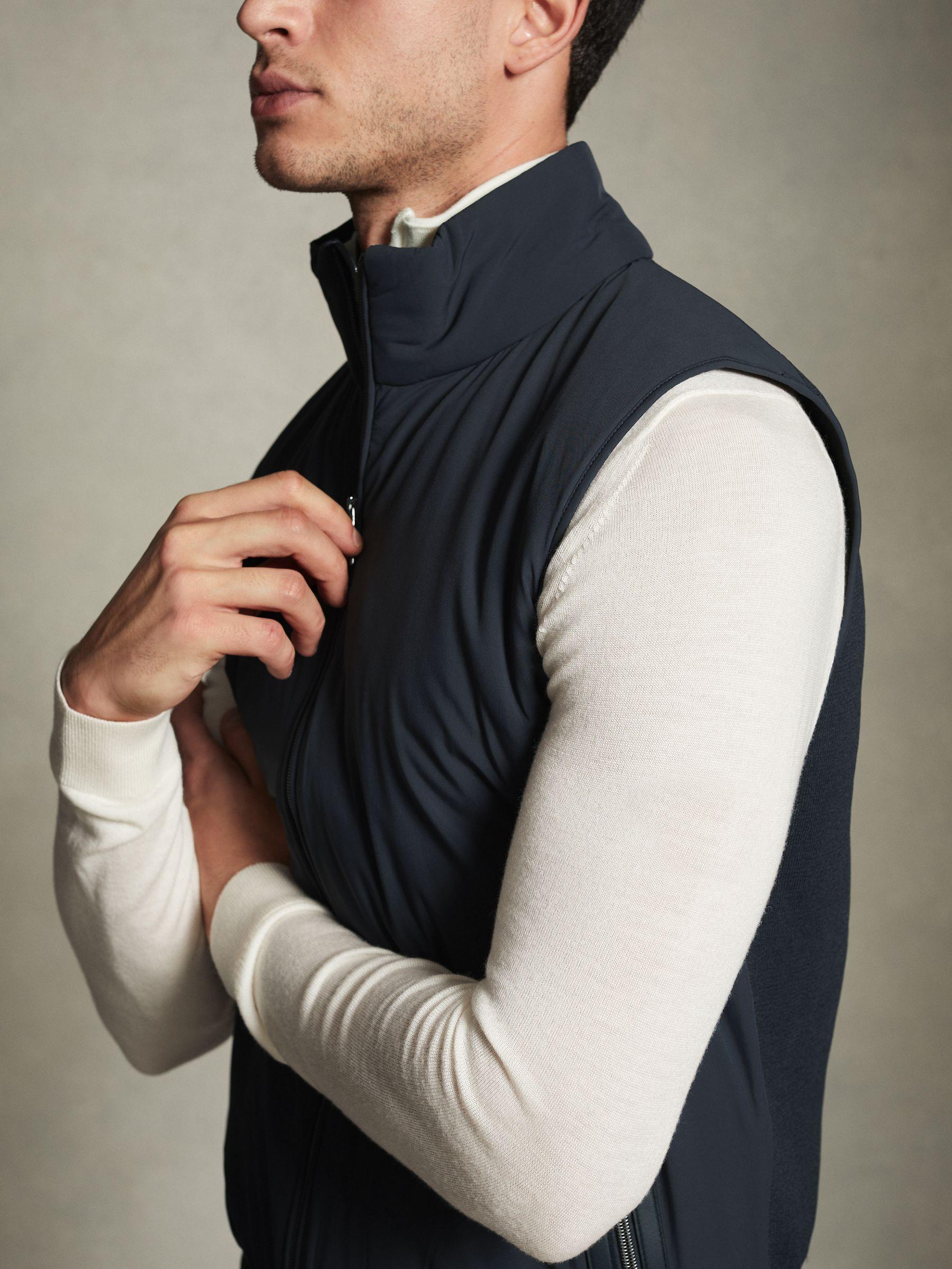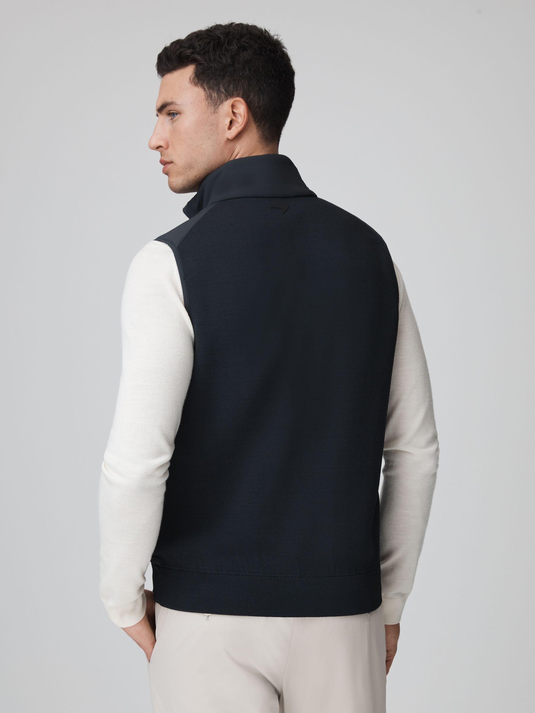 The Castlefield funnel-neck gilet features a soft, quilted front lining and a stretch-enhanced knitted back. The McLaren F1 branded zip closure is finished with a premium leather trim. Hybrid knit construction. Quilted front lining. Zip-front closure. McLaren F1 Speedmark logo. Leather trim. Side pockets. Introducing Reiss x McLaren Formula 1 Team Collection, our exclusive collaboration with McLaren Formula 1 Team. The model is wearing a size M Measurements of model: 6ft 2" / 188cm.