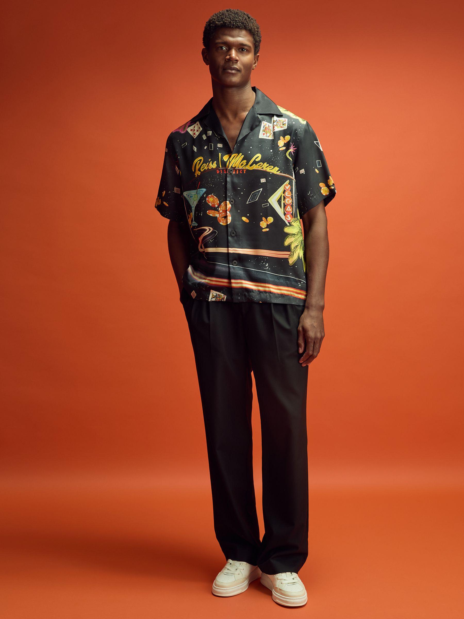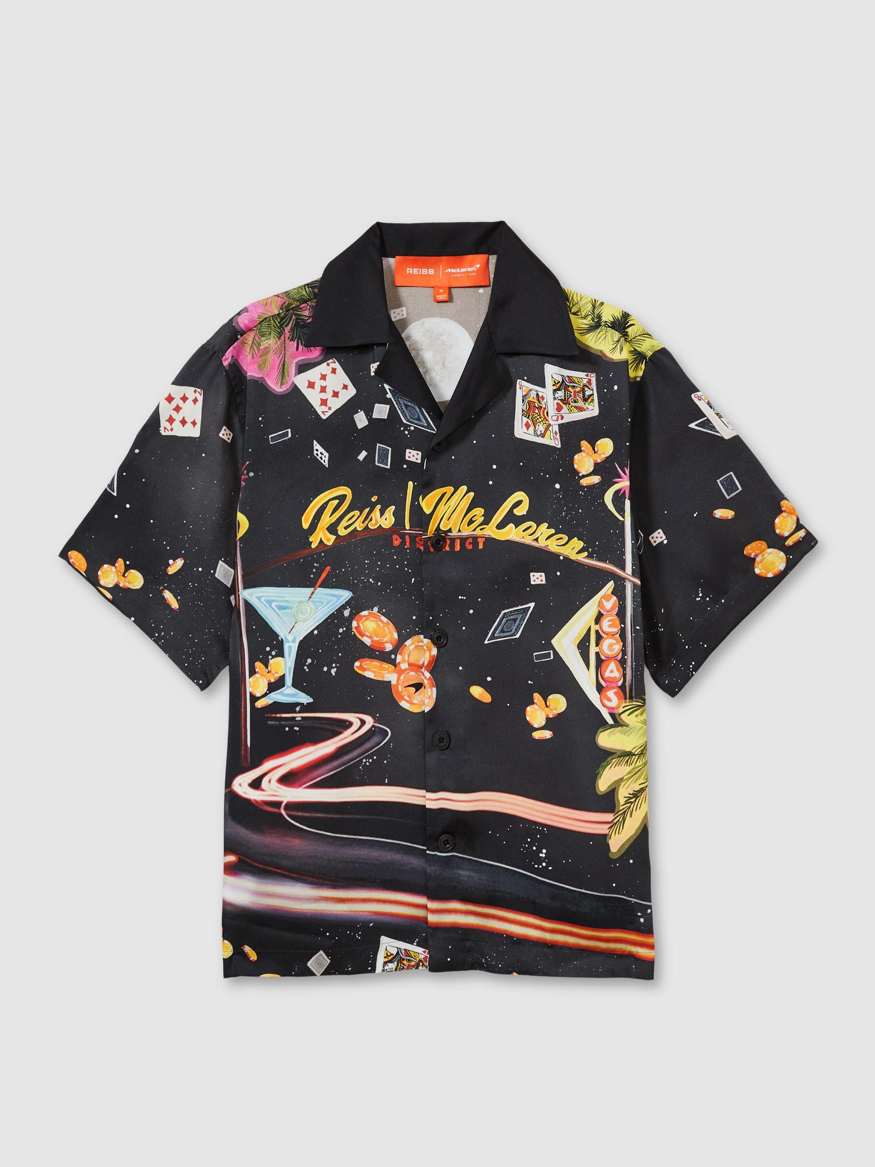Introducing Reiss x McLaren Formula 1 Team Collection, our exclusive collaboration with the McLaren Formula 1 Team. The Las Vegas Cuban collar shirt is cut from a cool, lightweight fabric designed in-house with our new hand-drawn print inspired by the city, dropping exclusively for the Formula 1 Las Vegas race. Formula 1 Las Vegas race exclusive Cuban collar Button-front closure. Measurements of model: Height 6ft 2.5 / 189cm . The model is wearing a size M.