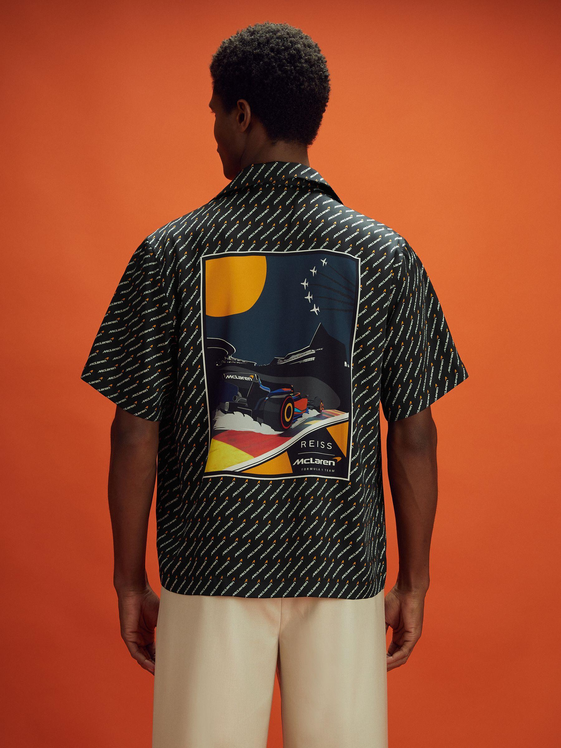 Introducing Reiss x McLaren Formula 1 Team Collection, our exclusive collaboration with the McLaren Formula 1 Team. The Vale Cuban collar shirt is cut from a cool, lightweight monogrammed fabric designed in-house with our new Silverstone print to the reverse, dropping exclusively for the Formula 1 Silverstone race. Formula 1 Silverstone race exclusive. Monogrammed print. Cuban collar. Button-front closure. The model is wearing a size M. Measurements of the model: 6ft 2'' / 188cm.