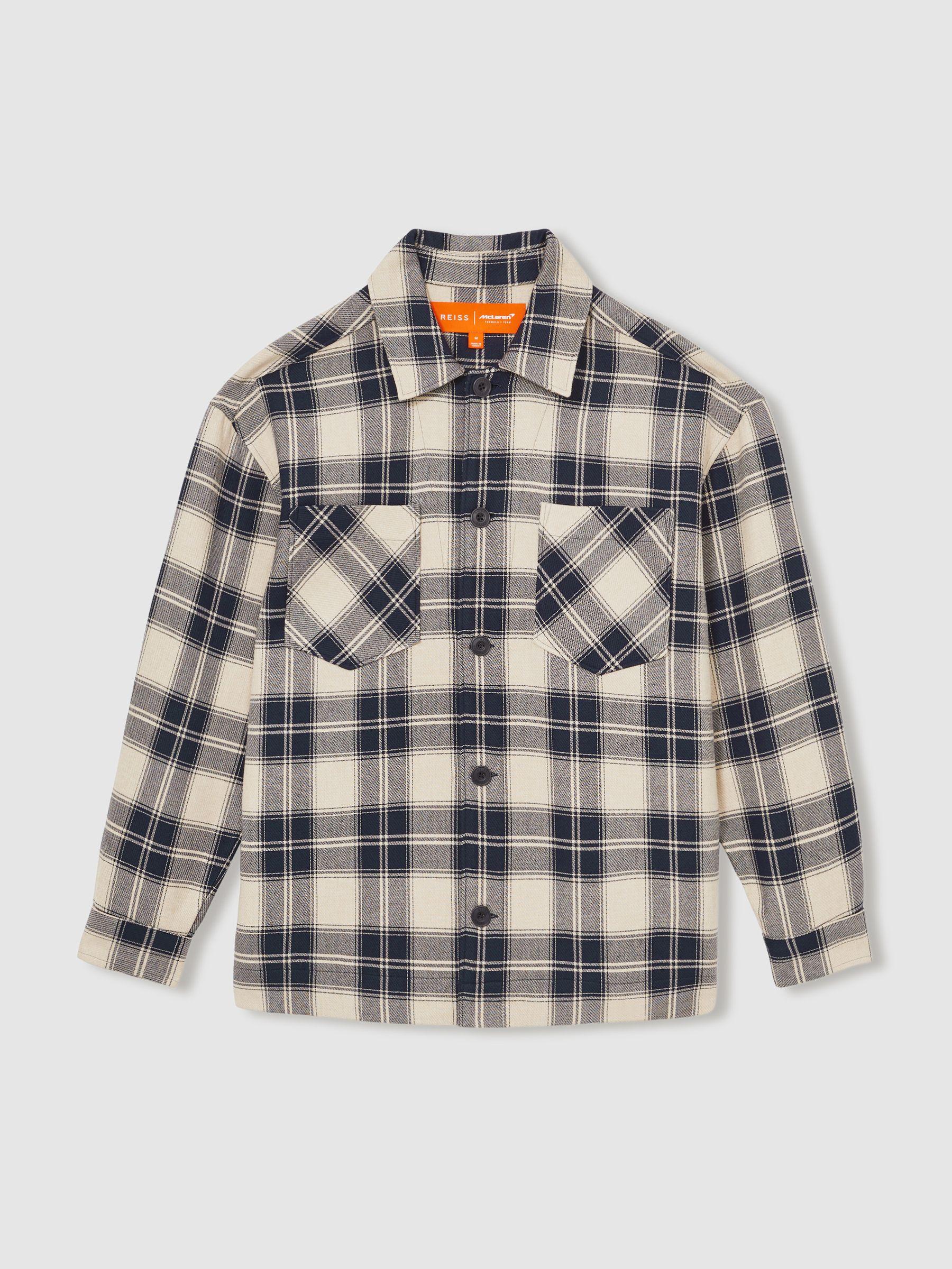 The Endurance overshirt is crafted from a wool blend with a bold check pattern and a rubberised McLaren Formula 1 Team Speedmark on the reverse. Drop shoulders create a relaxed silhouette, while patch pockets add a functional touch. Crafted with wool. Check pattern. Rubberised McLaren F1 Team Speedmark to reverse. Two patch pockets. Drop shoulders. Button cuffs. Front button closure. Presenting the Reiss - McLaren Formula 1 Team Collection Season 02, our exclusive collaboration with the McLaren Formula 1 Team.