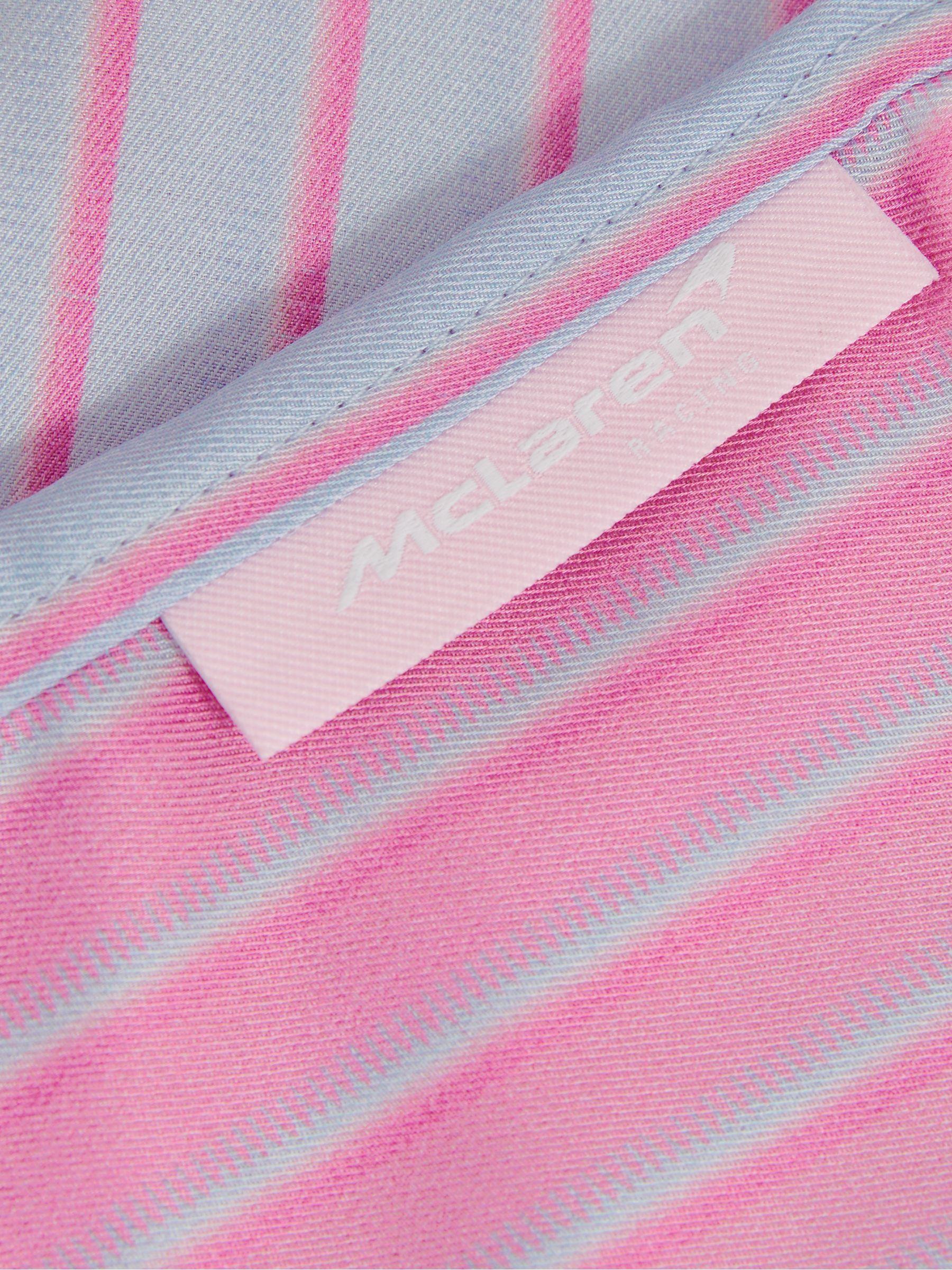 The Miami shirt, a race-exclusive for the Miami GP, is crafted from a soft, fluid fabric with gradient stripes. It’s defined by a bold graffiti-inspired Miami print on the front and a vibrant, distorted palm tree print on the reverse, capturing the city’s dynamic energy. The year of McLaren Formula 1 Team’s inception, 1963, details the back. Miami GP race exclusive Graffiti Miami print at front. Palm tree print to reverse. McLaren F1 Team branding to reverse. Stripes Cuban collar. Front buttons. Presenting the Reiss x McLaren Formula 1. Team Collection Season 02, our exclusive collaboration with the McLaren Formula 1 Team.