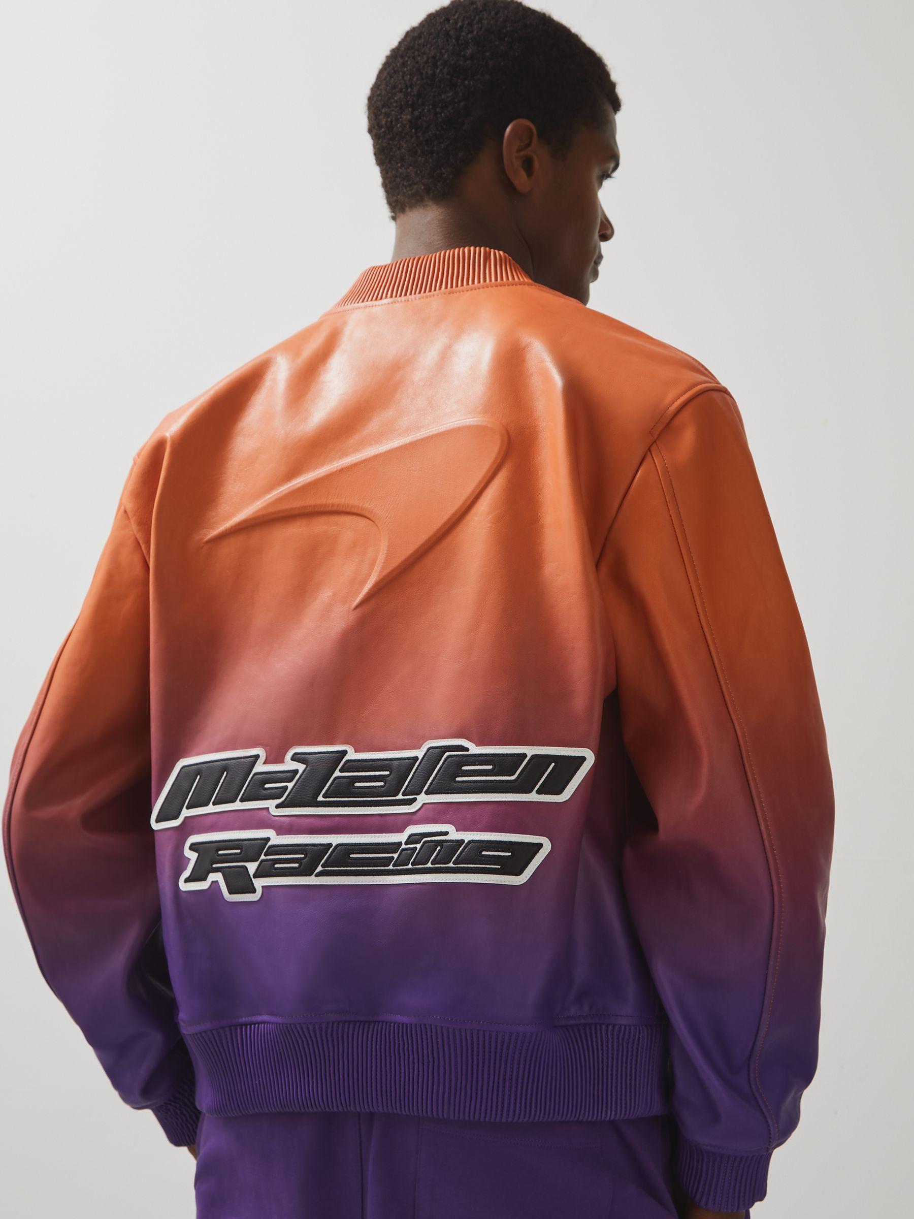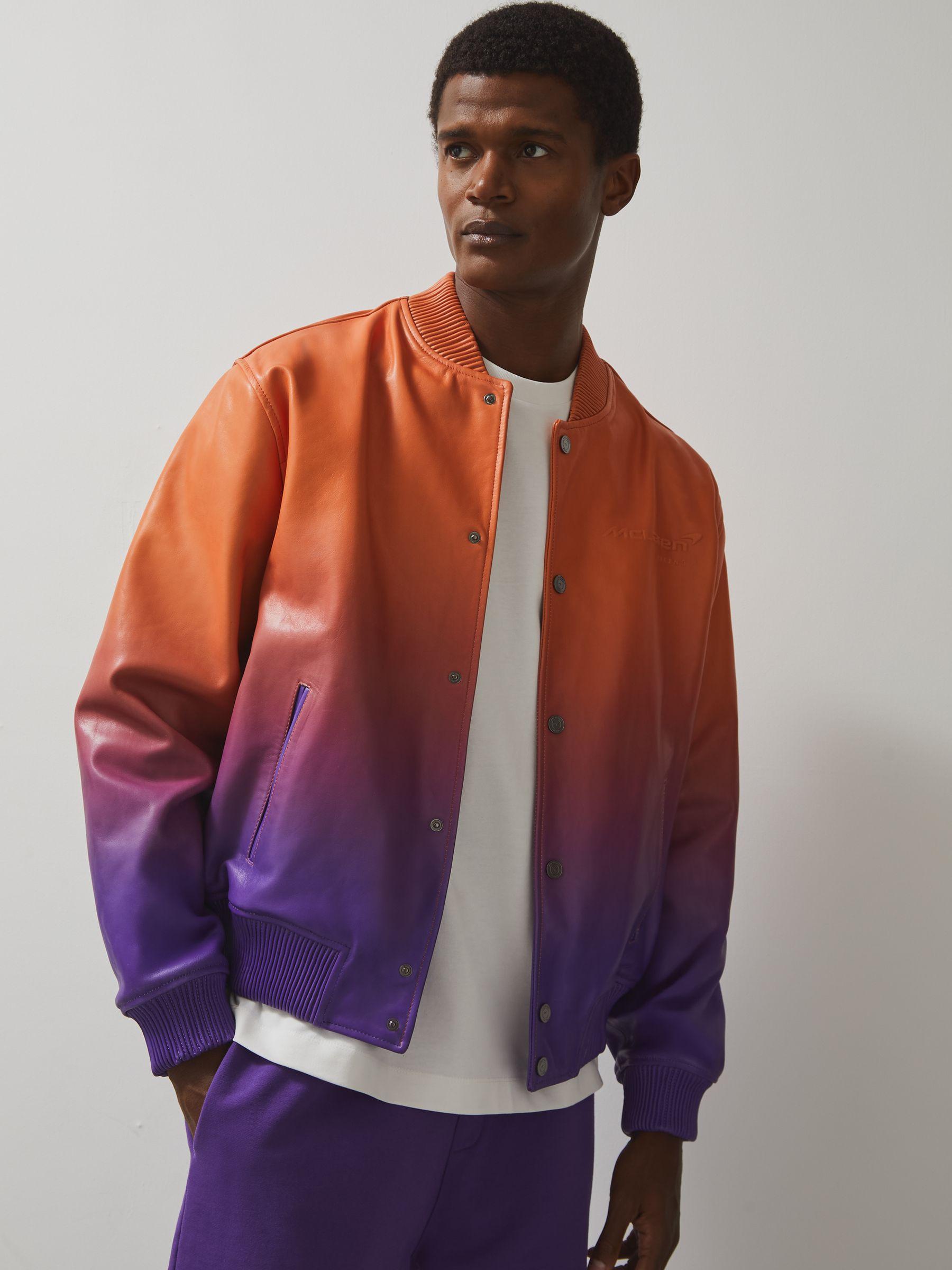 The Icon bomber jacket is crafted from premium leather, showcasing a bold ombré effect for a striking, modern look. Embossed branding on the chest and an embossed Speedmark on the back add subtle yet iconic detail, while the McLaren Formula 1 Team patch adds a signature touch. Chunky ribbed trims complete the design. 100% leather Ombré effect McLaren F1 Team brand patch to reverse McLaren F1. Speedmark to reverse. Embossed branding at chest. Ribbed trims. Front press-stud closure. Presenting the Reiss x McLaren Formula 1. Team Collection Season 02, our exclusive collaboration with the McLaren Formula 1 Team. The model is wearing a size M. Measurements of model: Height 6ft 2.5 / 189cm.