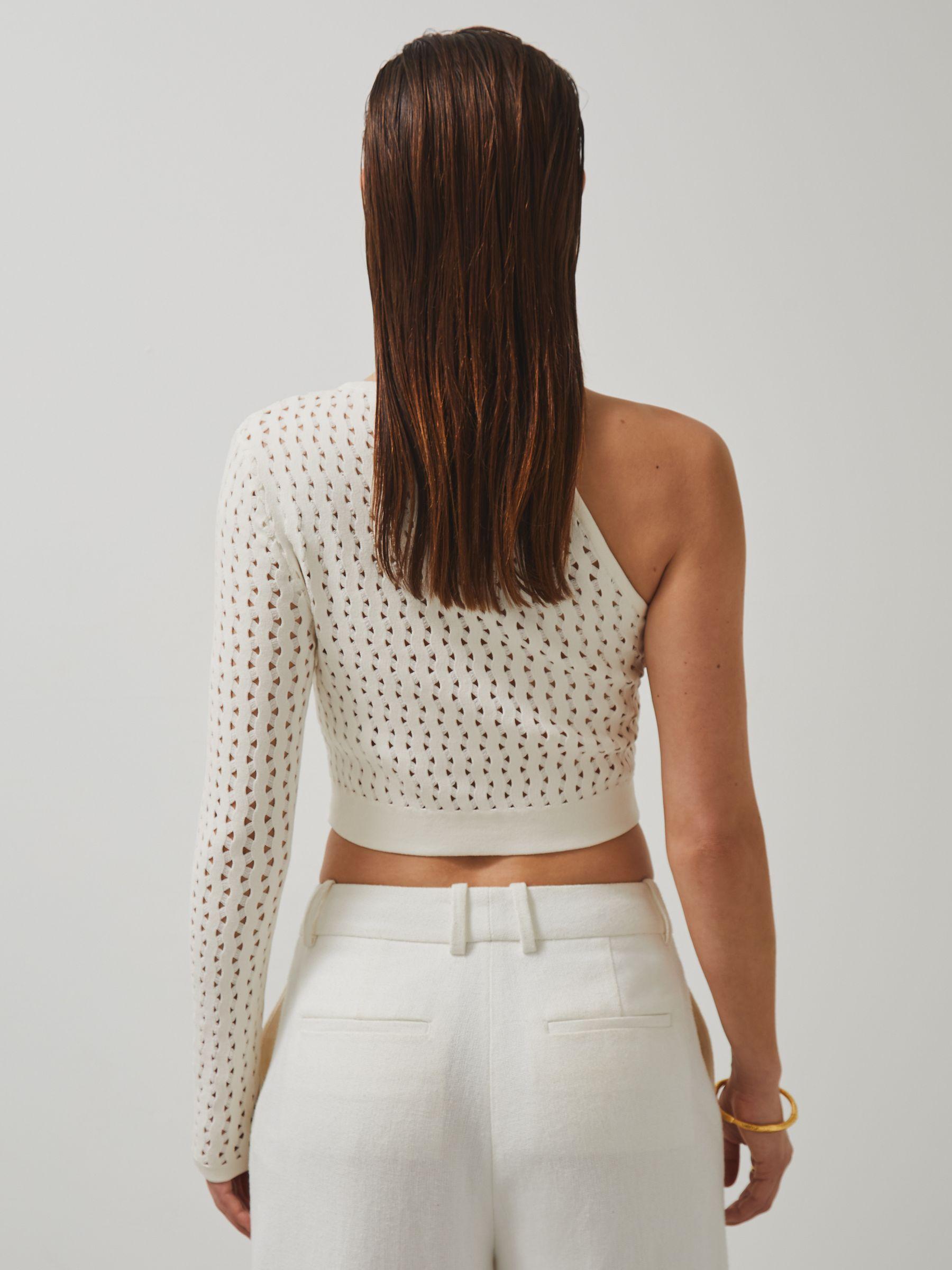 The Flow crop top is crafted from an open-knit fabric, offering a contemporary, textured feel. A statement McLaren F1 Team hardware detail adorns the neckline, while the asymmetric one-sleeve design adds a bold edge. Open knit McLaren F1 Team hardware One sleeve Cropped Presenting the Reiss x McLaren Formula 1 Team Collection Season 02, our exclusive collaboration with the McLaren Formula 1 Team.