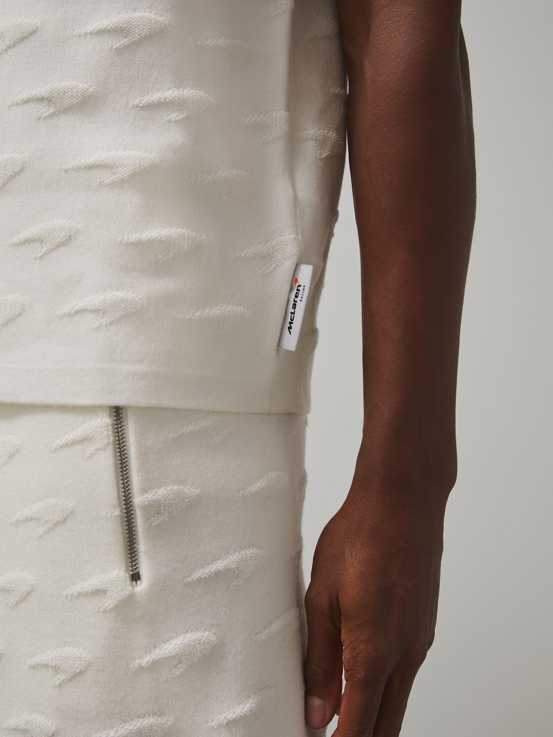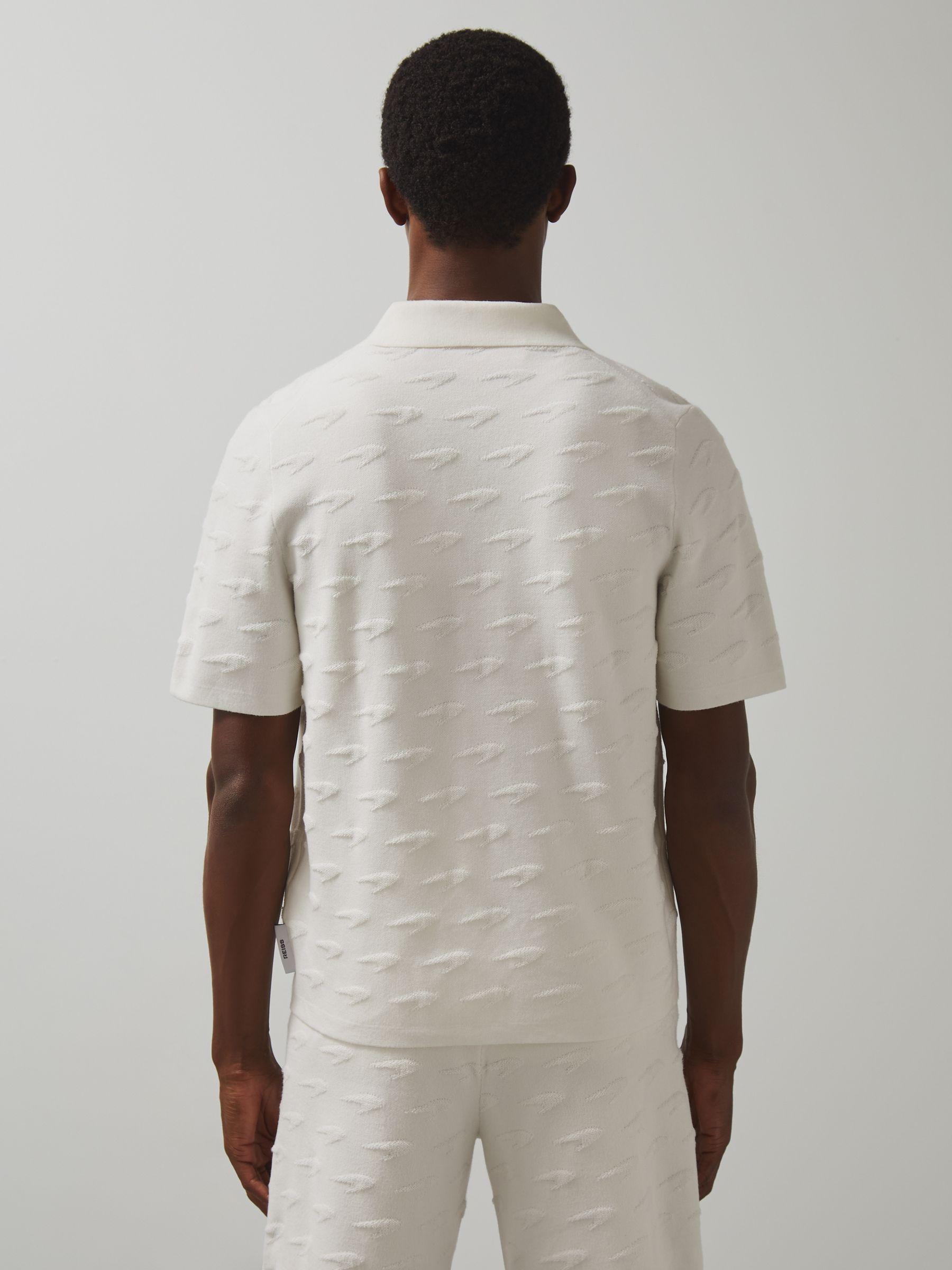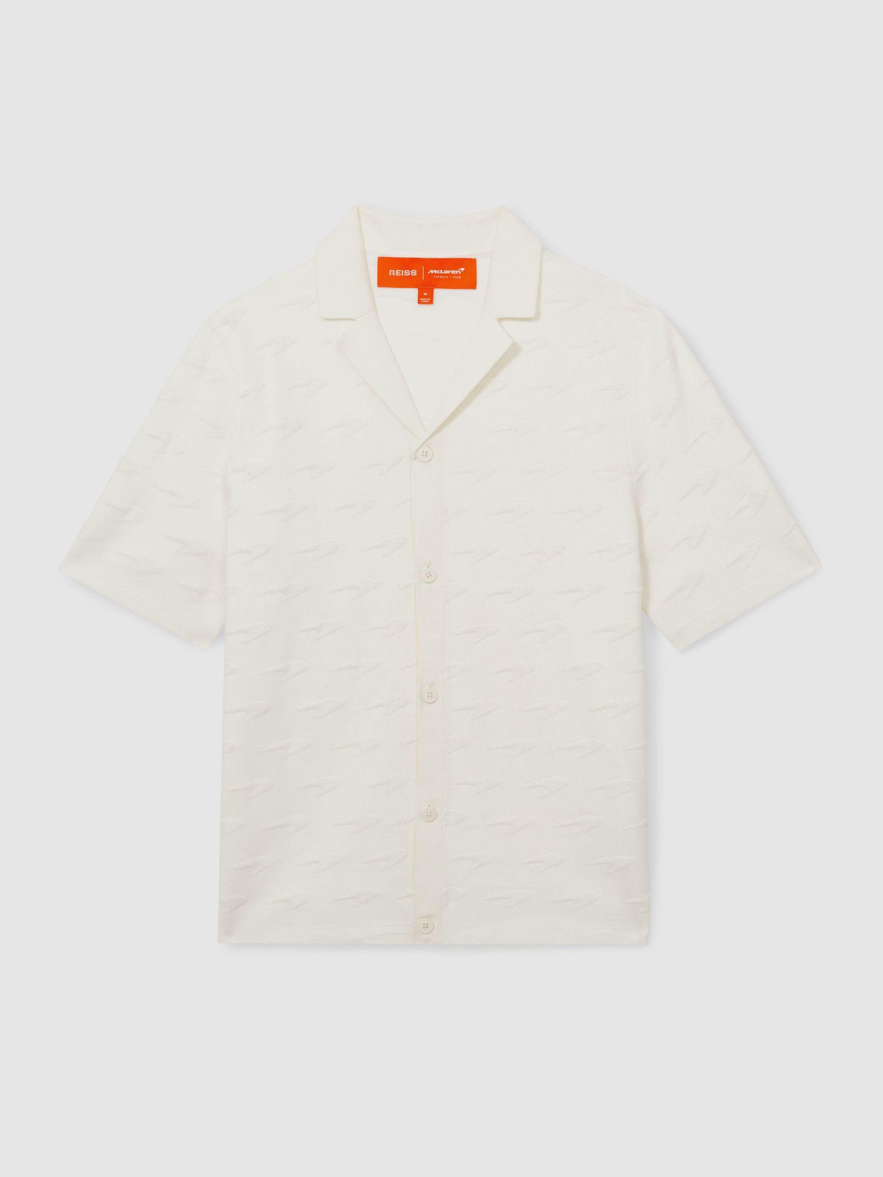 The Bounty shirt is crafted from a tactile knit, subtly featuring the iconic McLaren Formula 1 Team Speedmark logo for a signature touch. A Cuban collar enhances it's relaxed, laid-back appeal. Knitted McLaren F1. Team Speedmark pattern McLaren F1. Team brand tag at side. Cuban collar. Front buttons. Presenting the Reiss x McLaren Formula 1 Team Collection Season 02, our exclusive collaboration with the McLaren Formula 1 Team. The model is wearing a size M. Measurements of model: Height 6ft 2.5 / 189cm.