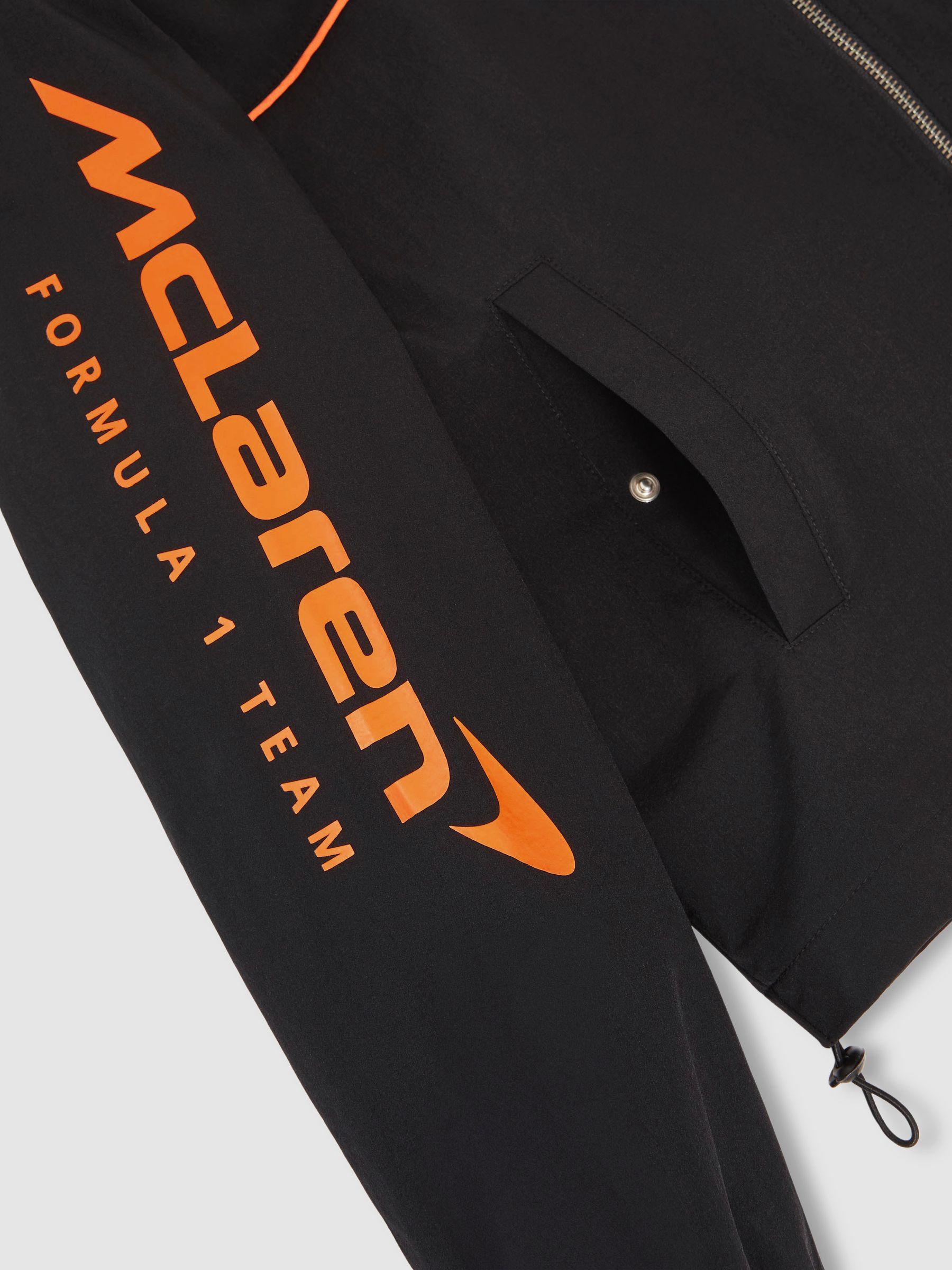 Crafted from lightweight technical fabric, the Wanden jacket features rubberised McLaren Formula 1 Team logos for a signature finish. Papaya-hued contrast piping adds a dynamic touch, while a front zip closure completes the sleek, functional design. Technical fabrication. Rubberised McLaren F1 Team logos. Contrast piping. Side pockets. Presenting the Reiss - McLaren Formula 1 Team Collection Season 02, our exclusive collaboration with the McLaren Formula 1 Team.