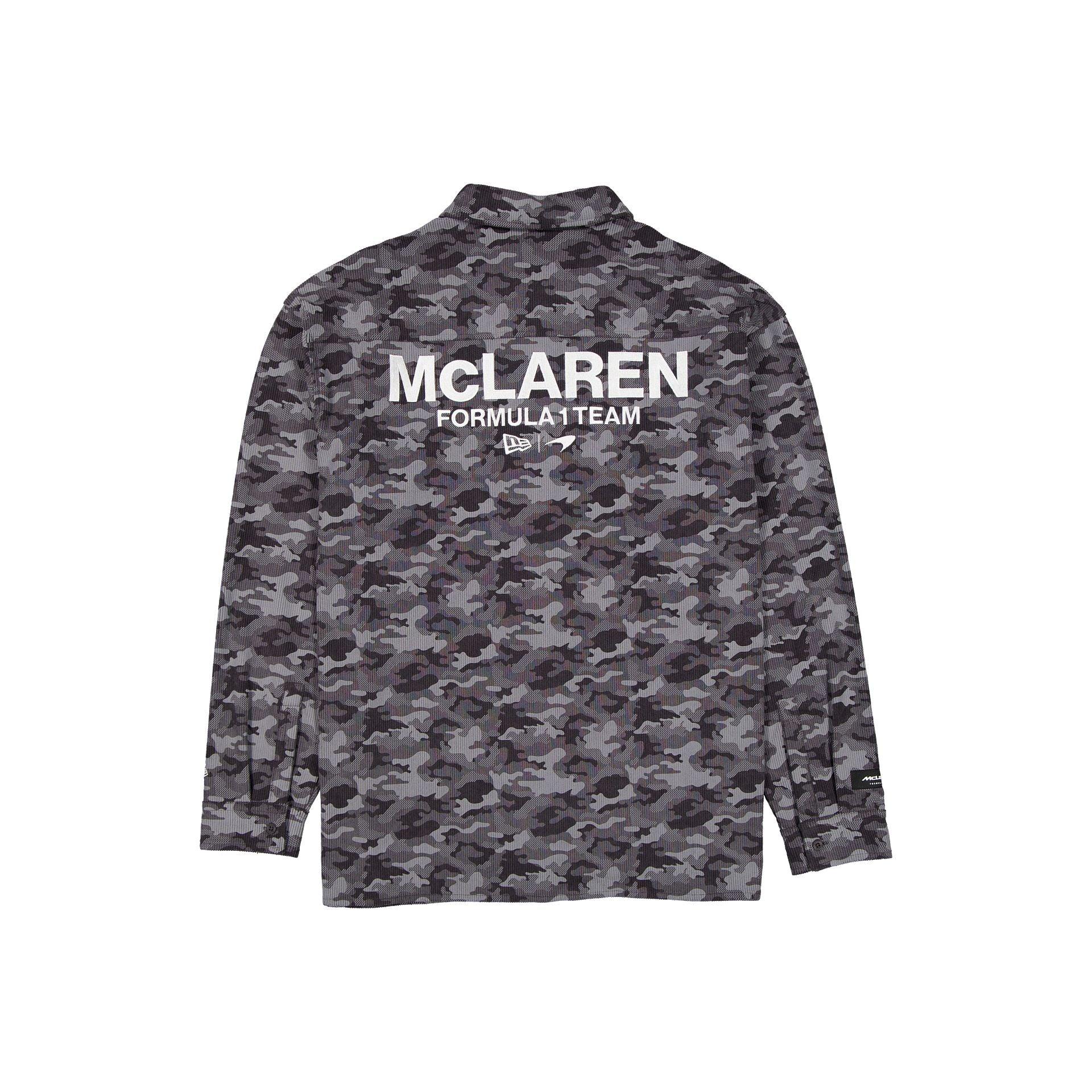 The McLaren Formula 1 Team Gray Camo Long Sleeve Shirt features an embroidered McLaren logo at the pocket with an embroidered satin stitch wordmark at the rear. Additional details include a button closure and a woven tag at the right arm.Fabric: 100% Polyester
