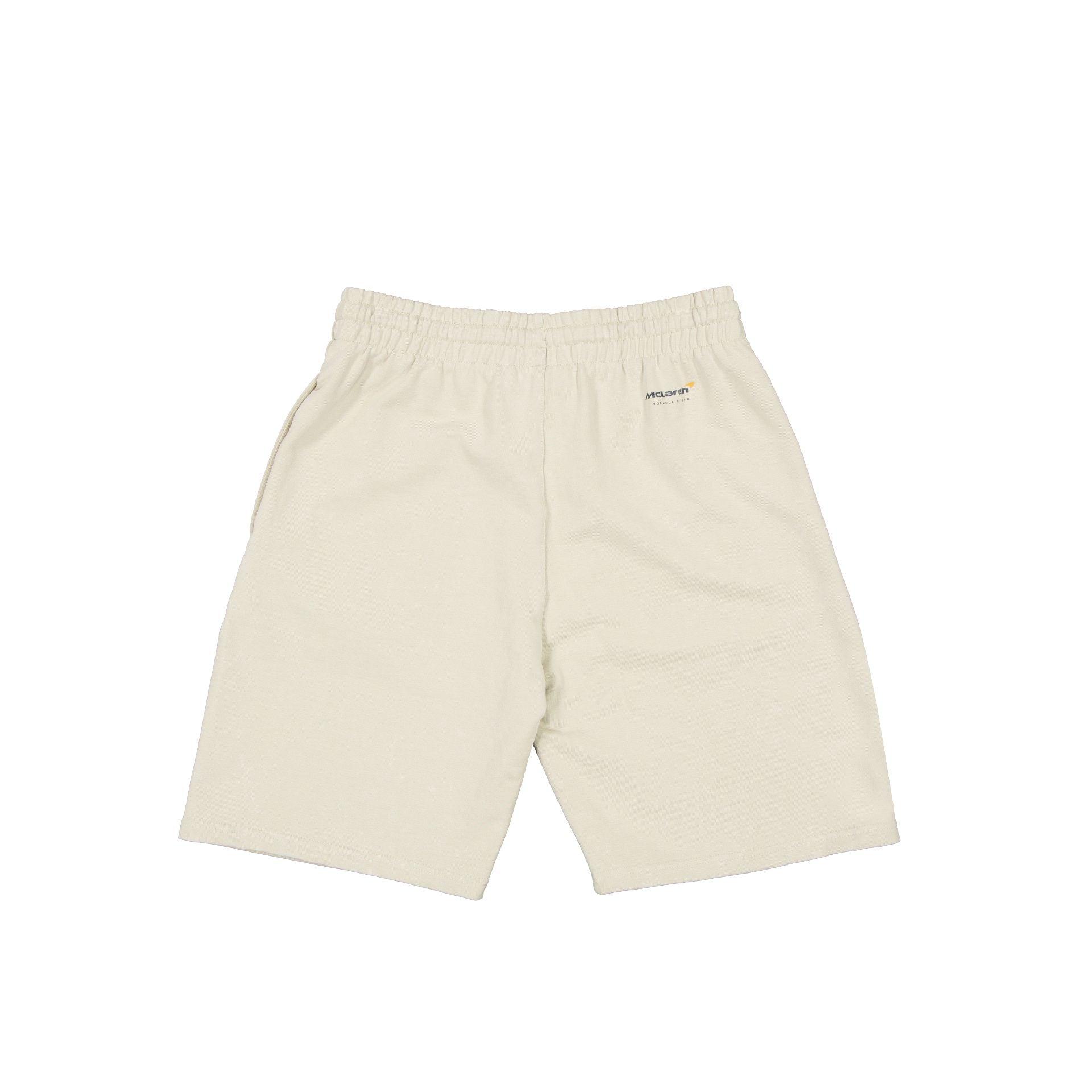 The McLaren Formula 1 Team Pigment Wash Stone Shorts feature a screen-printed McLaren wordmark at the right leg with pockets and adjustable drawstrings at the waist. Fabric: 100% Cotton