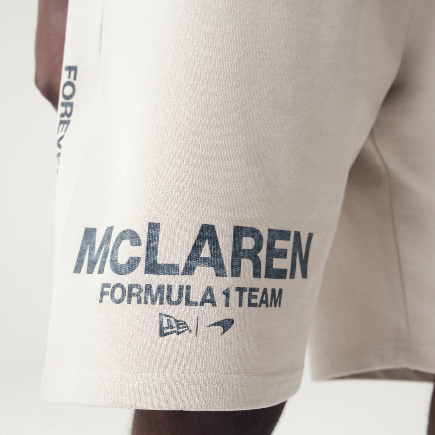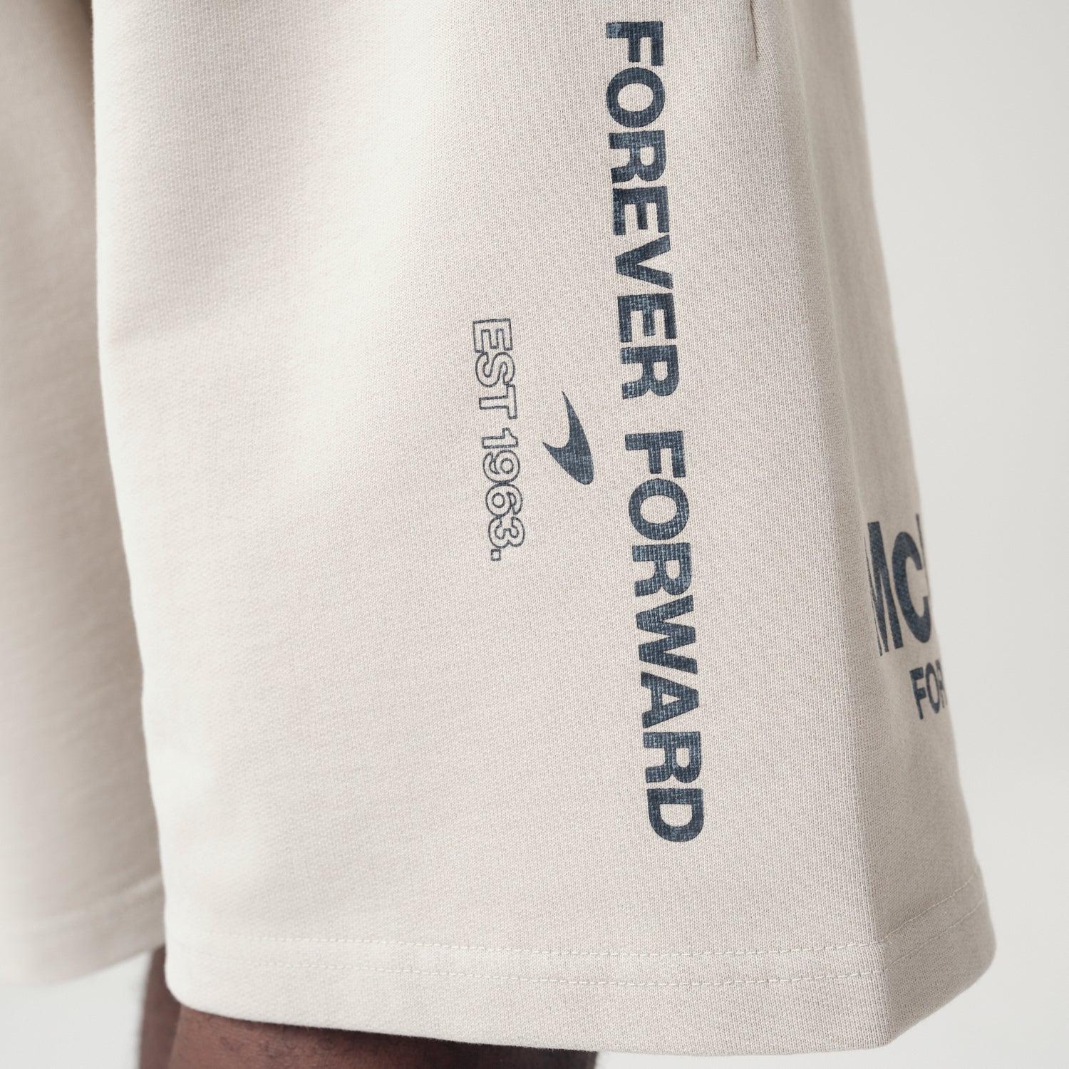 The McLaren Formula 1 Team Washed Stone Shorts feature a screen-printed McLaren wordmark at the front right leg, a vertical Forever Forward print at the rear, and adjustable drawstrings.Fabric: 100% Cotton