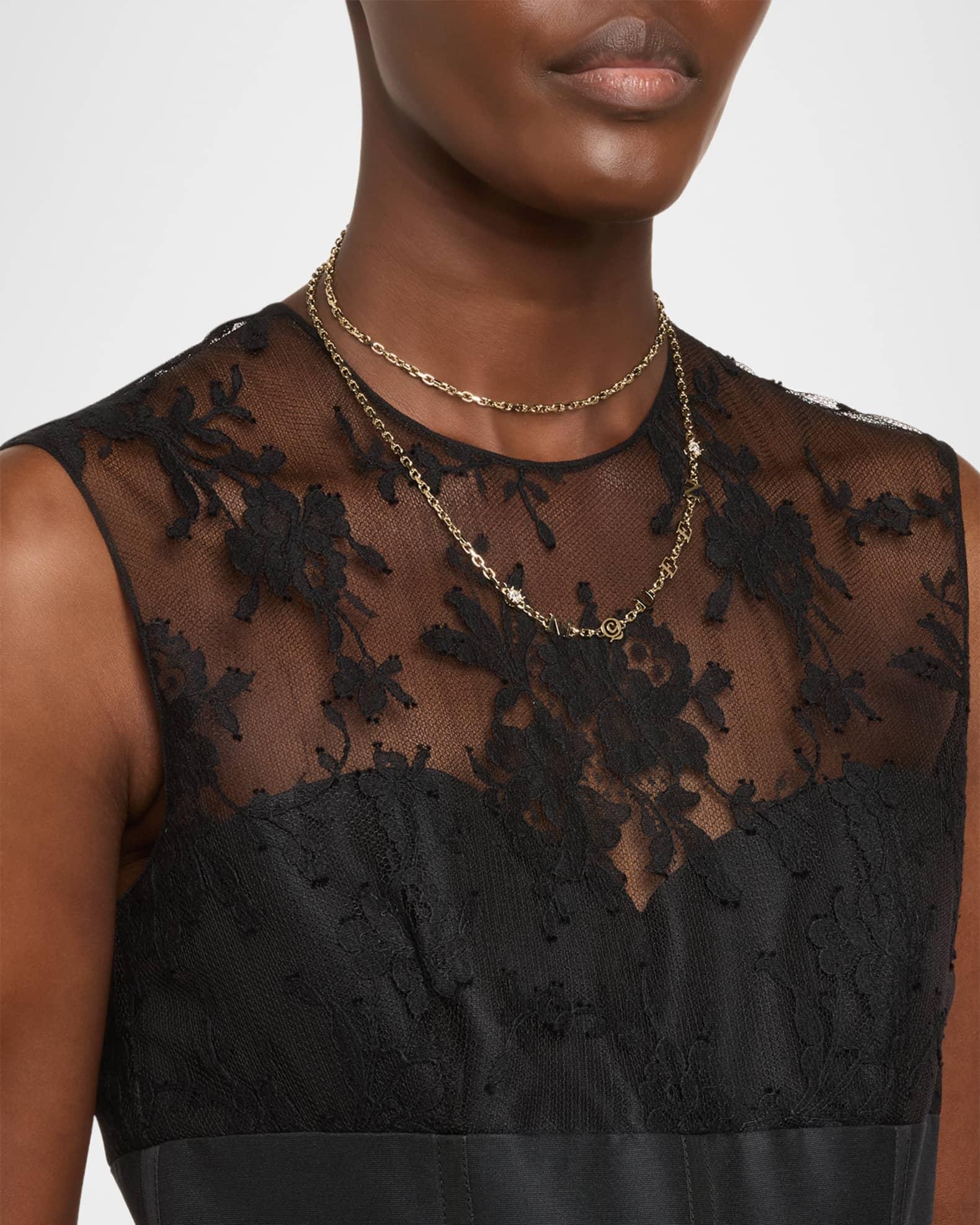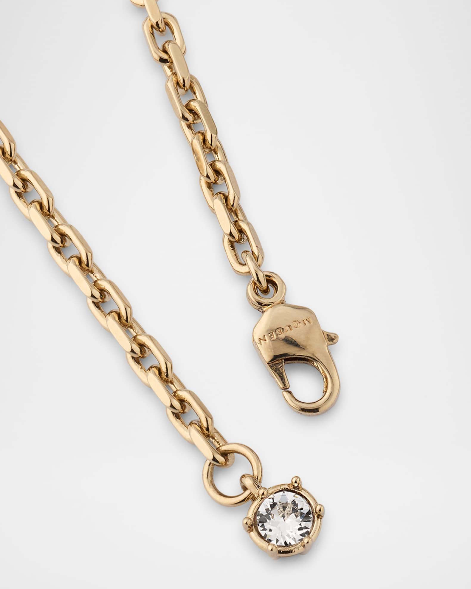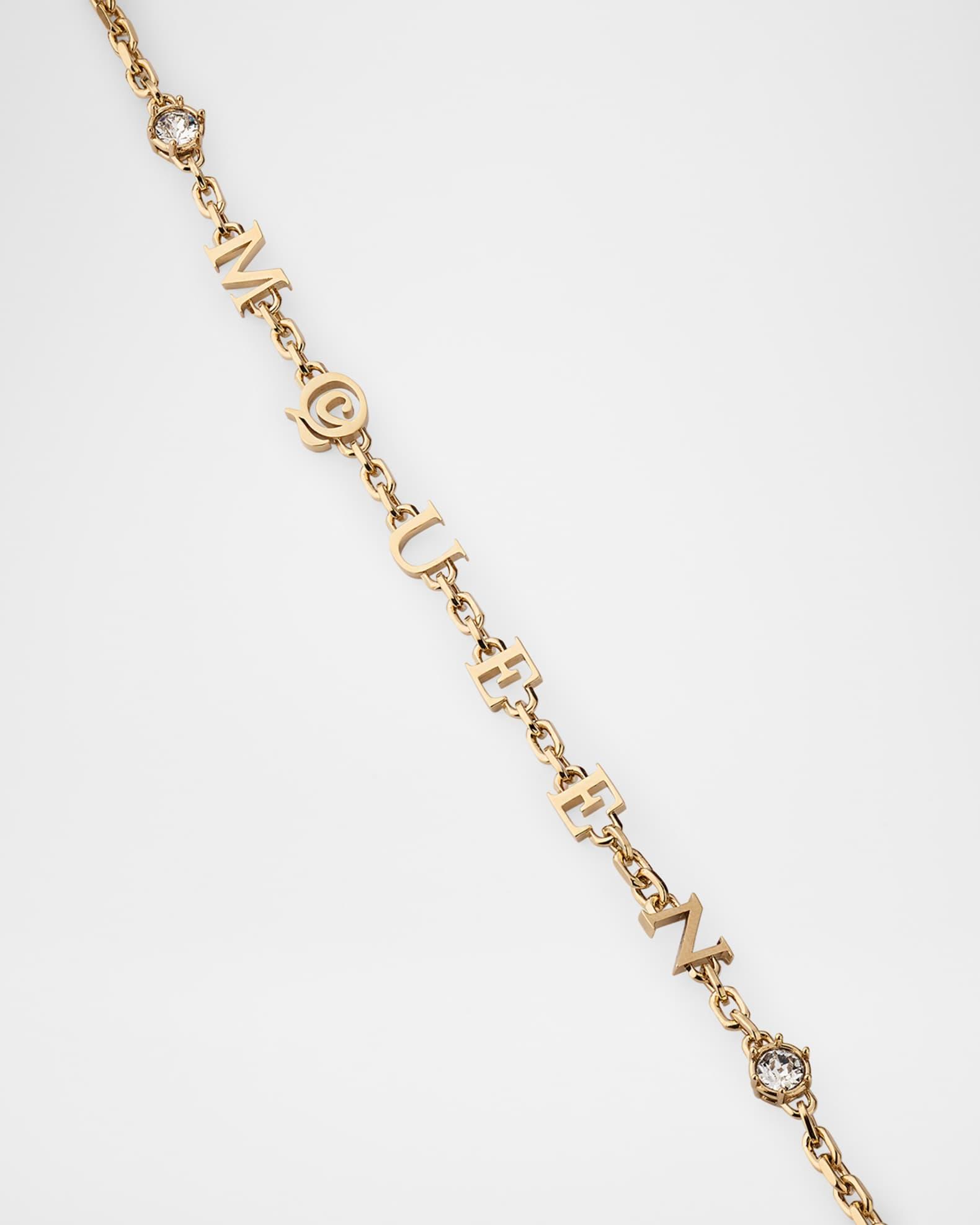 The uppercase letters of the McQueen logo are integrated with this necklace. Glass crystals accent the brand's logo and the extension chain. Necklace length: approx. 16-18 inches Shiny gold-tone brass Adjustable length Lobster clasp Made in Italy