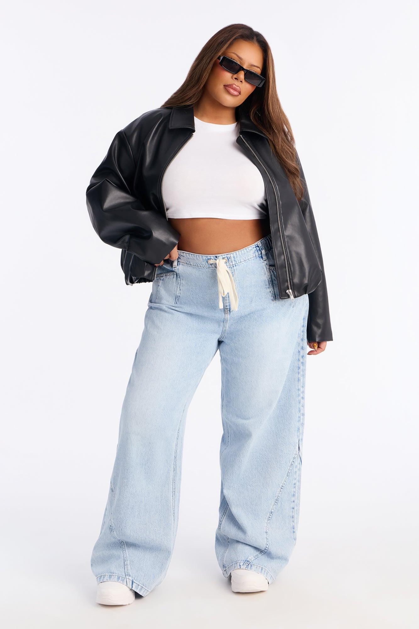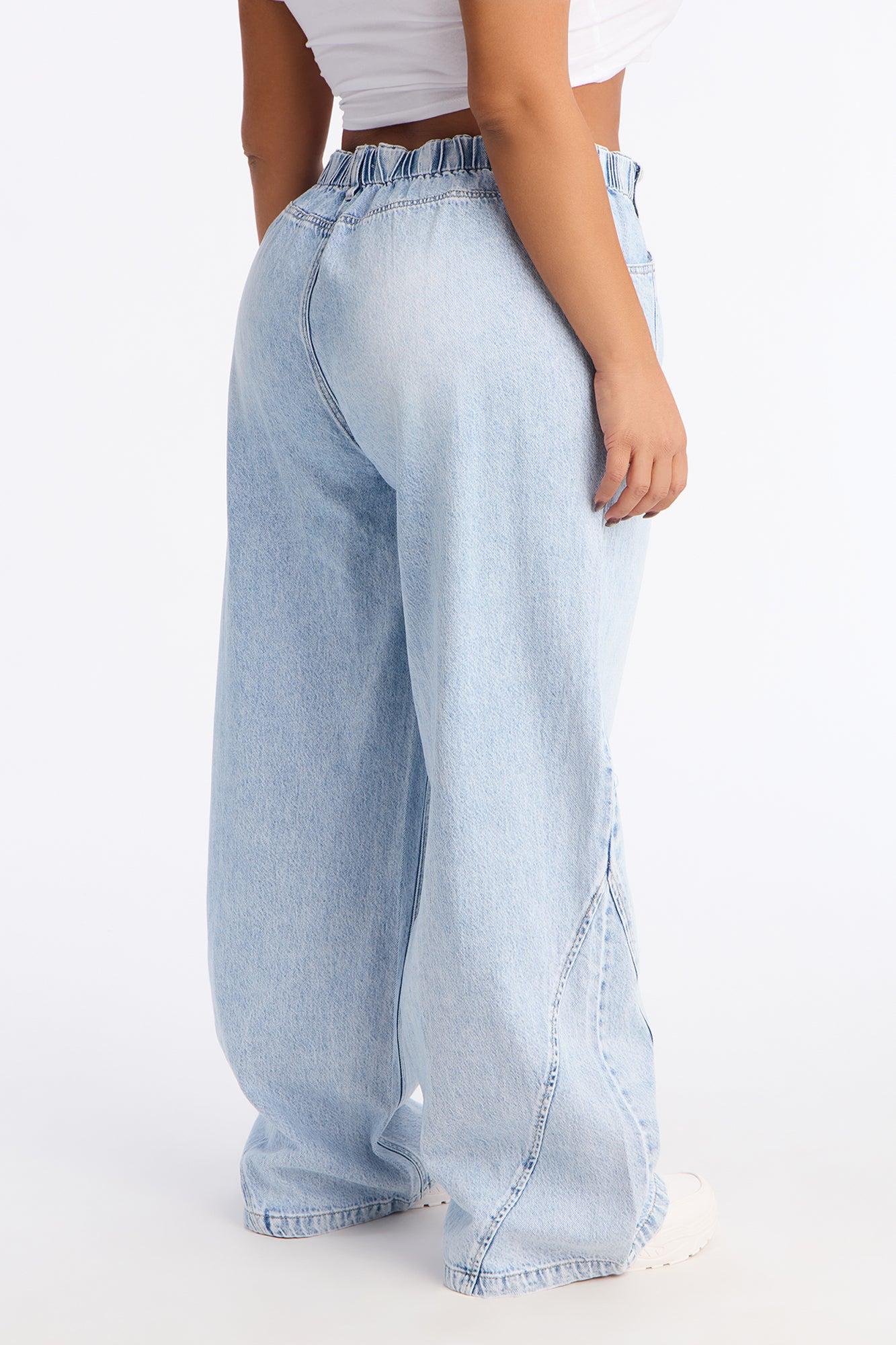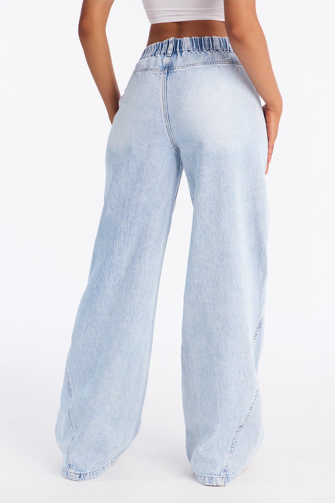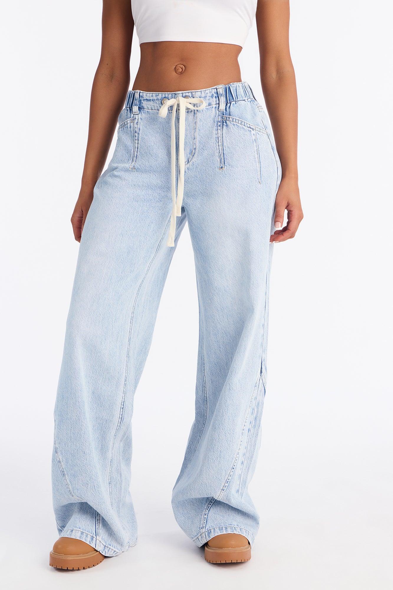 Available In Light Wash. Wide Leg Jean Authentic Lightweight Denim Drawstring Elasticized Waistband Pockets 9.75" Rise 32.5" Inseam Non-Stretch Disclaimer: Due To The Specialized Wash Process, Each Garment Is Unique. Self : 82% Cotton 18% Lyocell Imported California Proposition 65WARNING: Cancer and Reproductive Harm - www.P65Warnings.ca.gov.