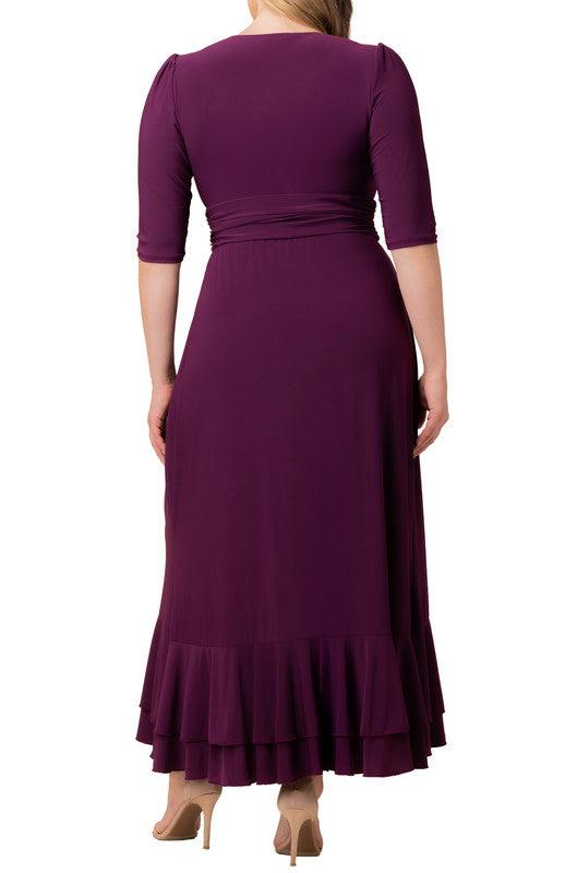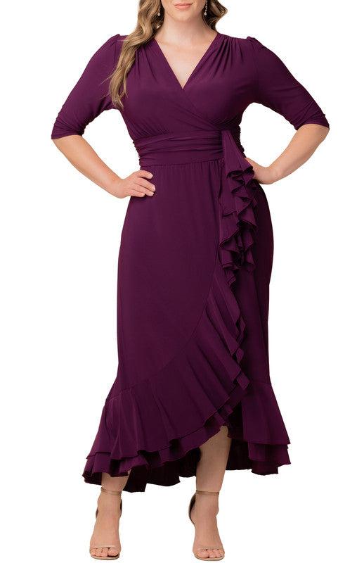 The Flirty Flounce Midi Wrap Dress features cascading flounces on the skirt and bottom hem. This functional wrap provides adjustable coverage and flattering 3/4 length sleeves. Perfect for cocktail and special occasions, work, and as a wedding guest dress.