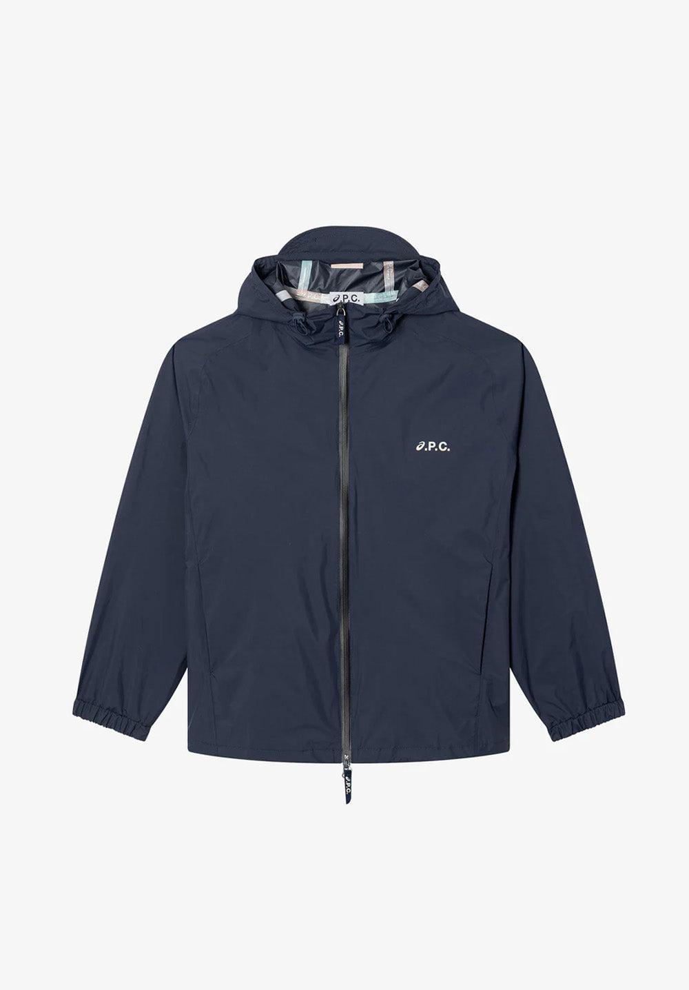 A.P.C. x Asics jacket.- Straight cut. - Crew neck adjusts with two tone-on-tone stoppers and a visor hood. - Waterproof two-way zip closure. - Multicolored A.P.C. and Asics logo over the heart. - Two side pockets. - Sleeve elasticated at wrist. - Wear with the Haze pants.