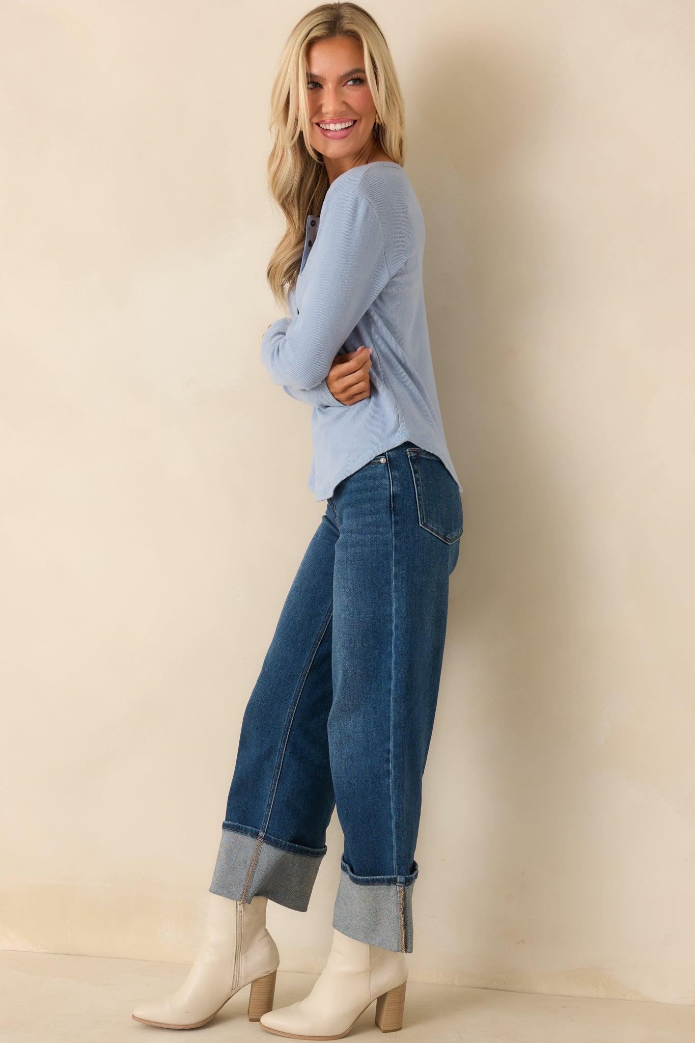 The Meant For Today Sky Blue Ribbed Knit Long Sleeve Henley Top is one of those pieces that quietly becomes part of your everyday rotation. The soft ribbed knit and easy henley neckline give it that relaxed, lived-in feel, while the clean silhouette keeps it looking intentional. Whether you’re layering it under jackets or wearing it on its own, it’s the kind of top that always feels right for the moment. This sky blue long sleeve henley top is made from a soft ribbed knit fabric and features a round neckline with a functional button-front placket. Designed with long sleeves, a chest pocket, and a straight hem for easy wear, it offers a comfortable, relaxed fit that works well for layering or wearing on its own.93% Rayon & 7% Spandex Unlined Machine Wash Cold Manufactured in ChinaDesigned in The USA Model is Wearing a Size Small, Clipped, Model is a True X-Small