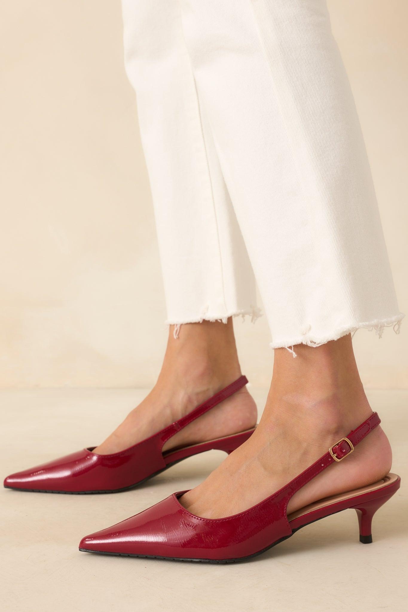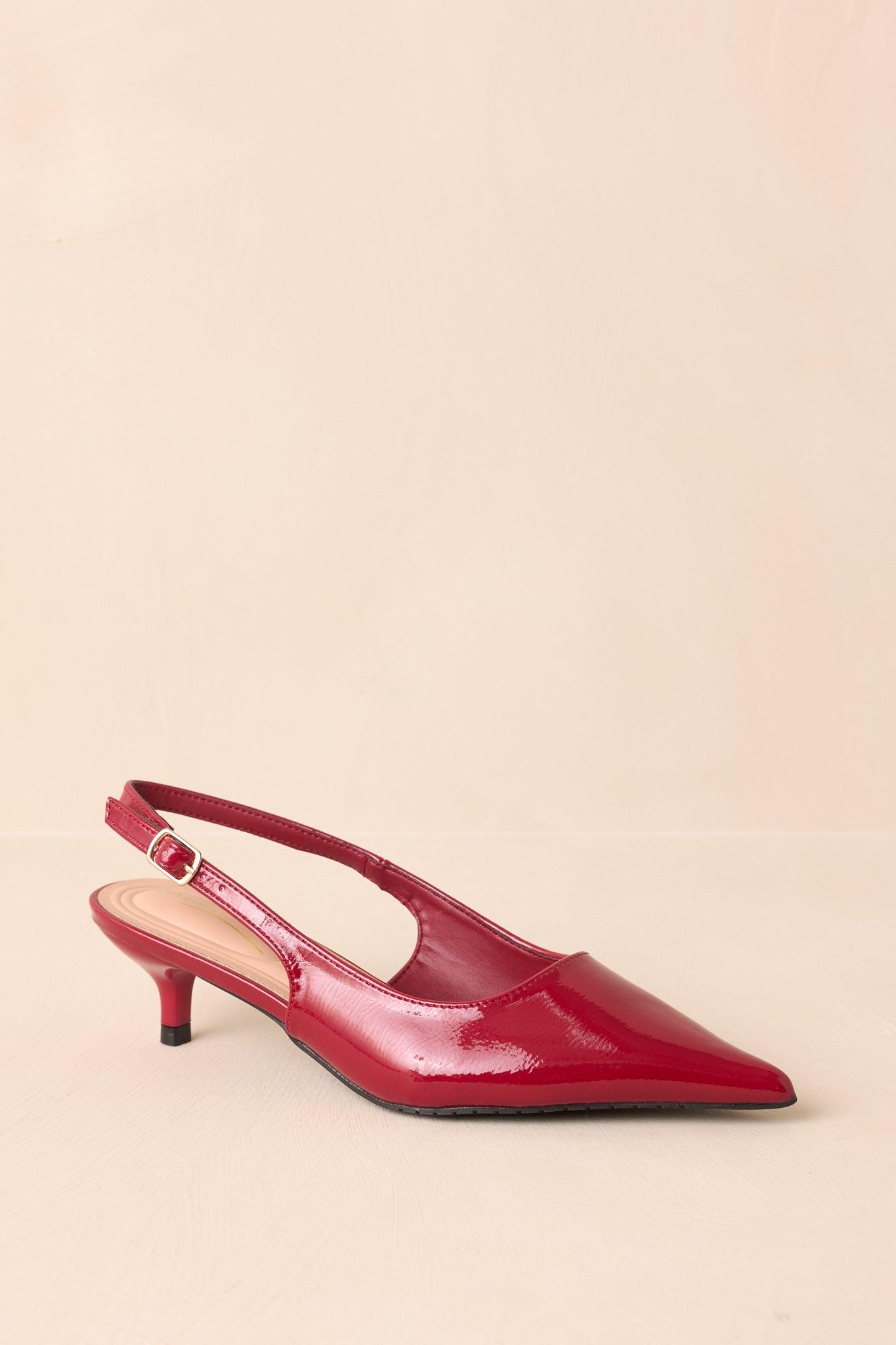 Meant To Be Me Red Patent Pointed-Toe Slingback Kitten Heels make every step feel bold and confident. Striking yet timeless, they’re the perfect pop of color that elevates any look. These red heels feature a shiny patent finish, a pointed closed-toe, adjustable slingback strap, and short kitten heel. Heel measures 1.75" Man made materials Manufactured in China Designed in The USA True to Size