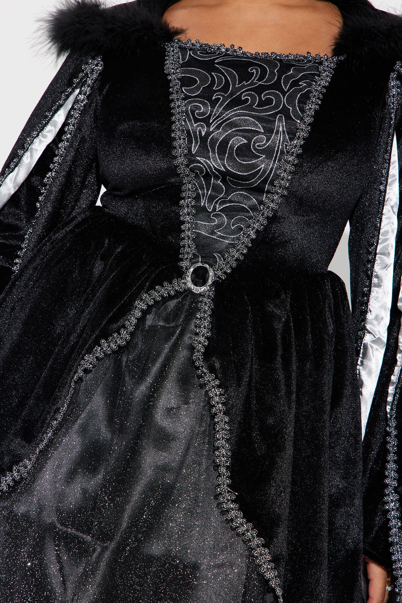 Available In Black. 1 Piece Halloween Costume Medieval Queen Costume Style With Black Boots And A Dark Lip For The Perfect Look! Full Length Velvet Dress With Metallic Trim Satin Lined Sleeves Attached Fur Trimmed Collar Final Sale 100% Polyester Imported California Proposition 65 WARNING: Cancer and Reproductive Harm - www.P65Warnings.ca.gov.
