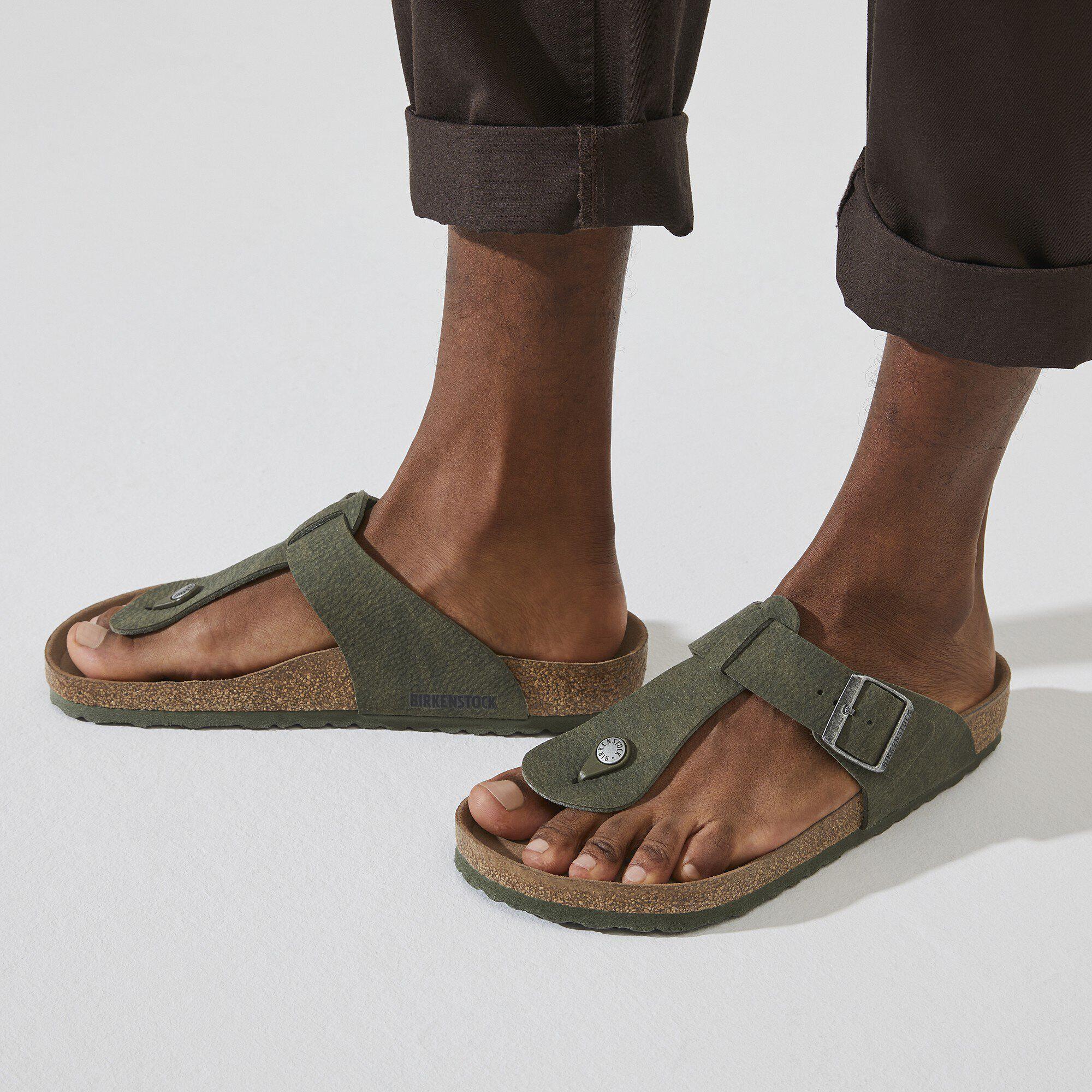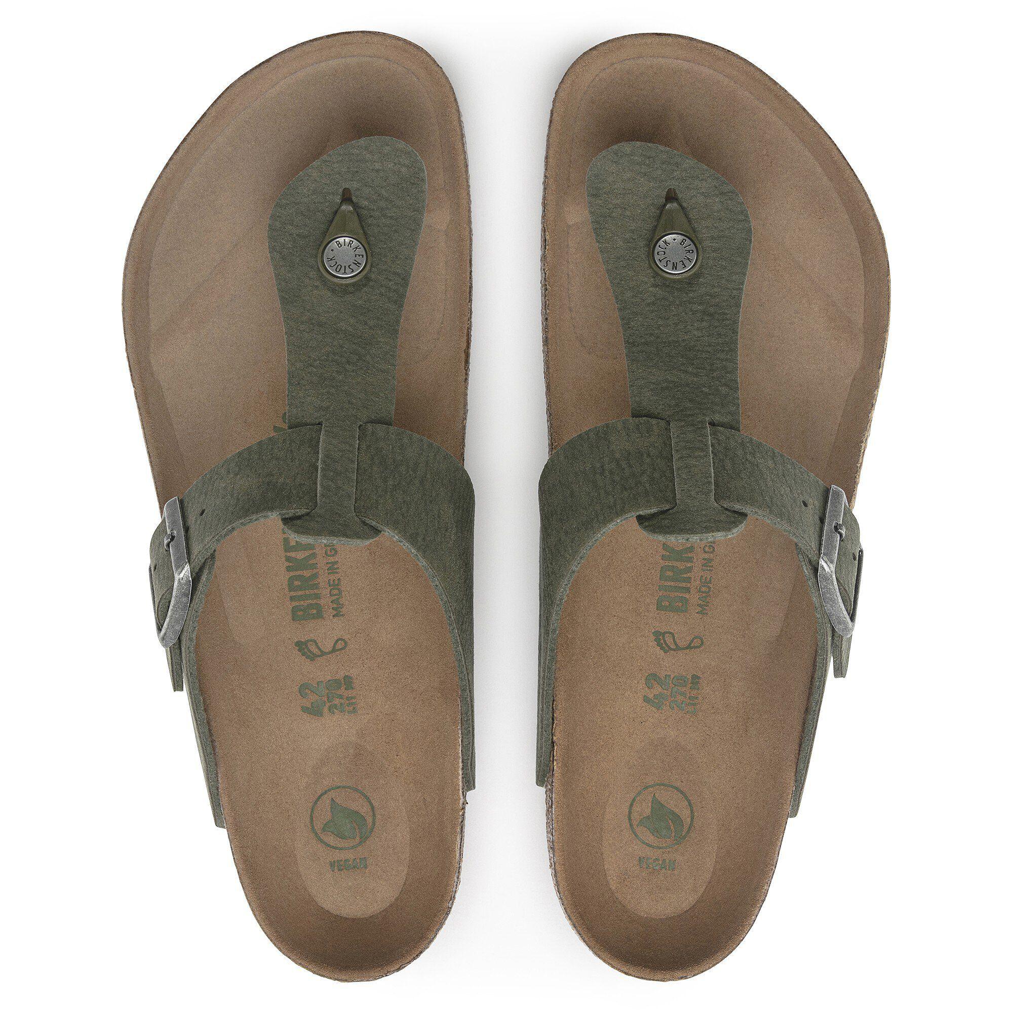 The BIRKENSTOCK Medina - a modern thong sandal. The bold straps and side buckle, combine for a fully adjustable fit on the instep. This classic model is now available in a vegan material, featuring a matte finish reminiscent of natural suede and a microfiber footbed liner.