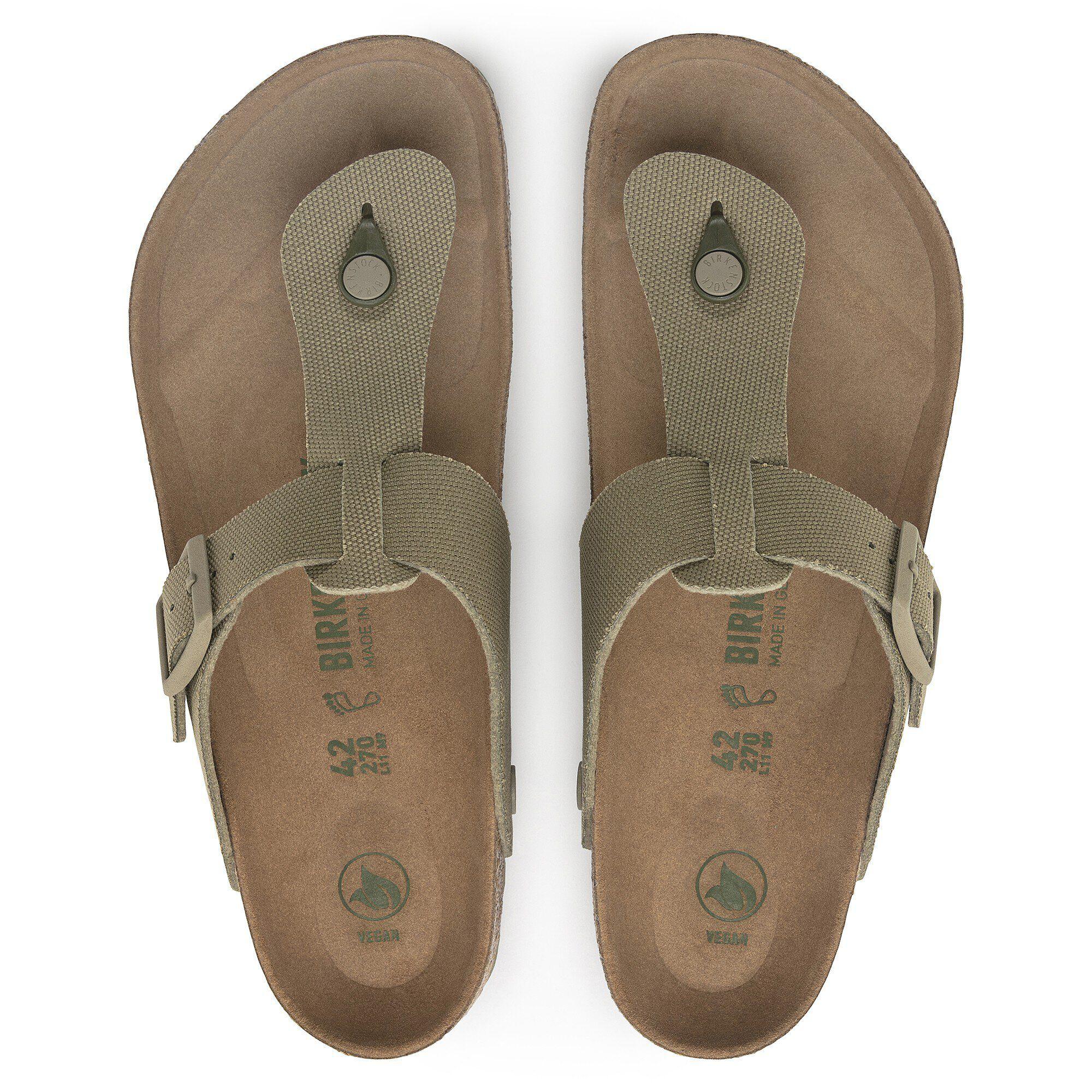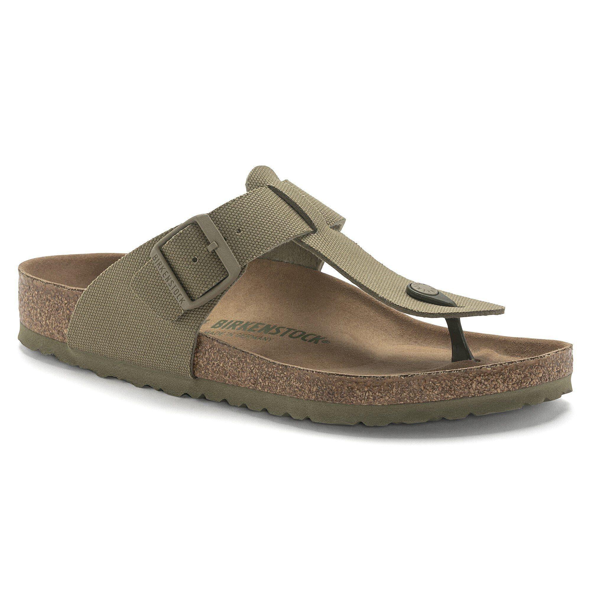 The BIRKENSTOCK Medina - a modern thong sandal. The bold straps and side buckle, combine for a fully adjustable fit on the instep. This classic model is now available in a vegan material, featuring a matte finish and a microfiber footbed liner. The upper is made of canvas textile.