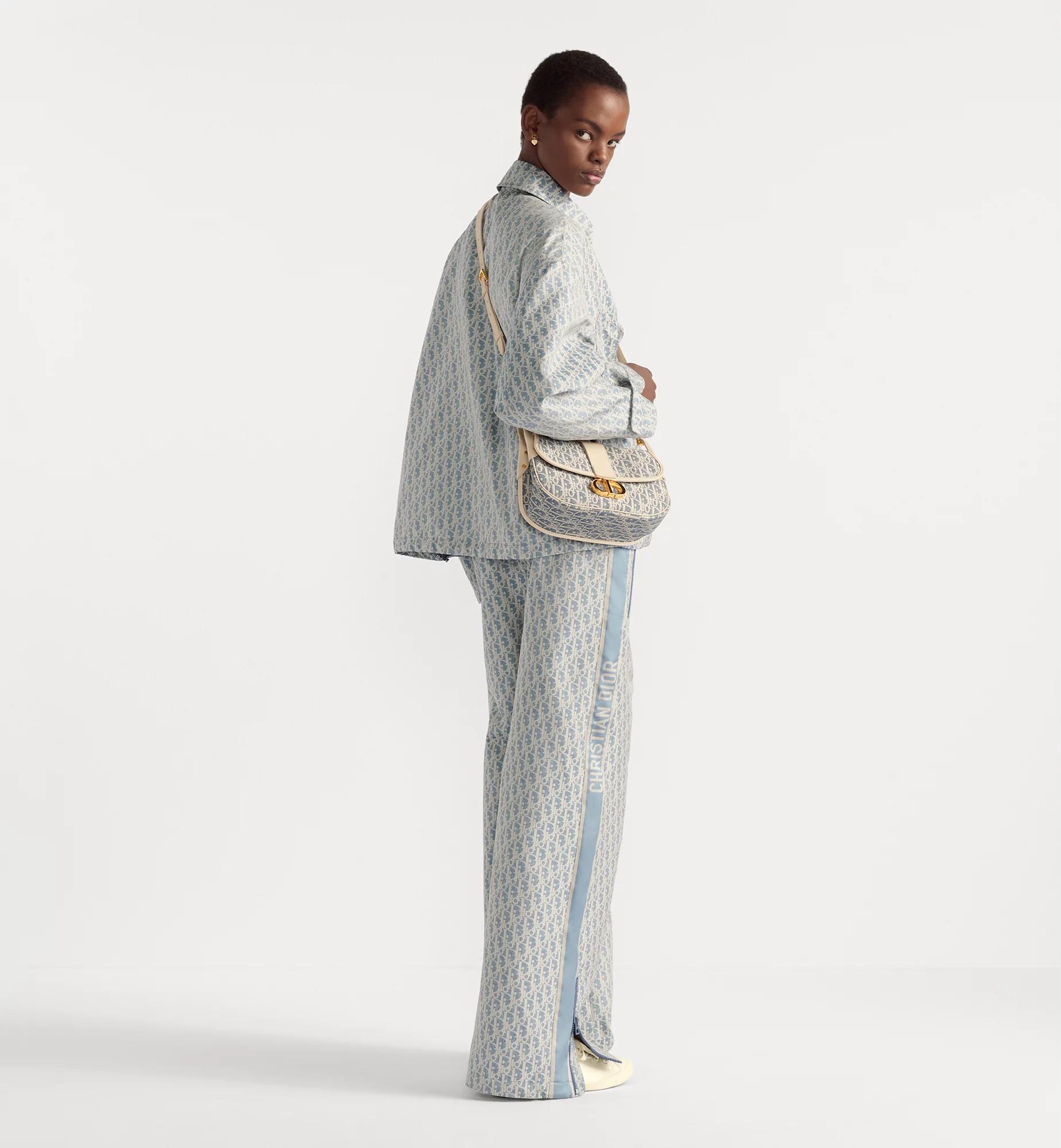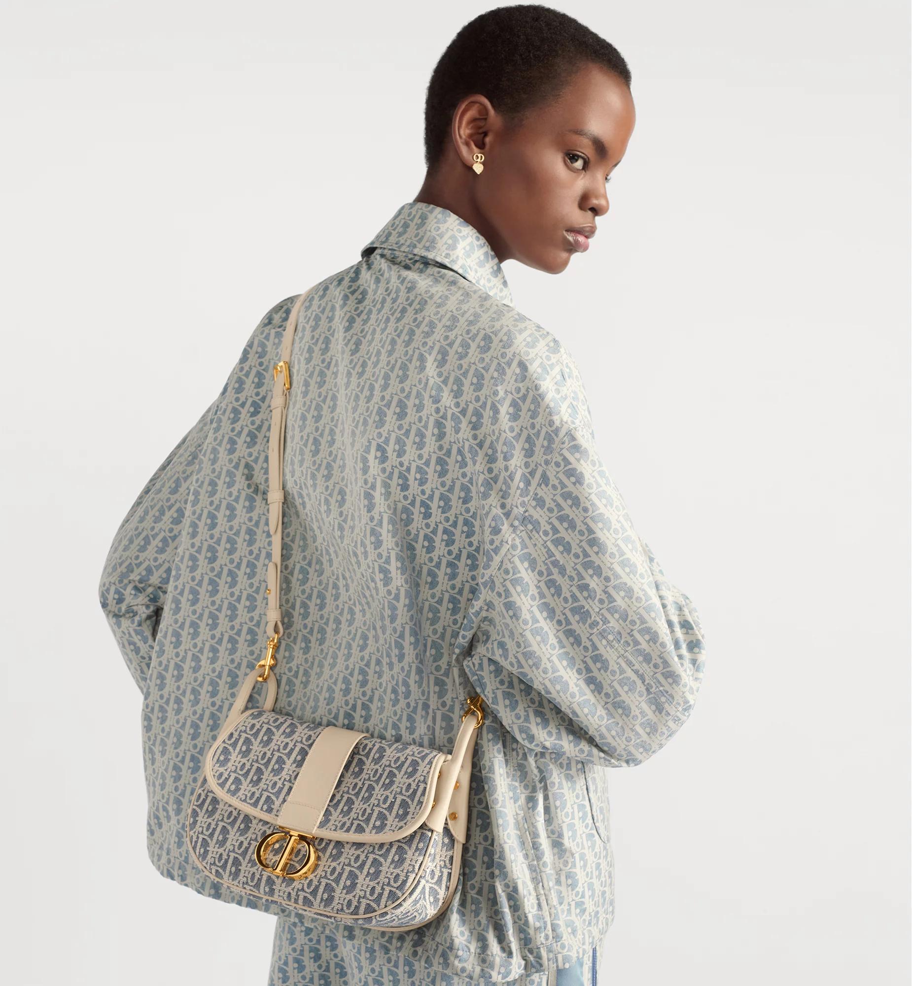 New for Fall 2025, the satchel bag elevates the 30 Montaigne line with a casual design enhanced by sophisticated detailing. The style showcases the refined pairing of light biscuit smooth calfskin and blue chambray, a lightweight cotton denim embroidered with ultra-durable raffia thread in the iconic Dior Oblique motif. An antique gold-finish metal Christian Dior Paris signature on the front embellishes the supple silhouette, while the spacious and practical interior has a slip pocket to hold all the essentials. The adjustable and removable calfskin strap allows the medium bag to be comfortably worn over the shoulder or crossbody with any of the season's casual or elegant looks. Main composition: cotton, technical fabric and calfskin. Cotton, linen and calfskin lining. Flap closure. CD clasp. Adjustable and removable leather shoulder strap. Interior slip pocket. Rear slip pocket. Dust bag included. Made in Italy