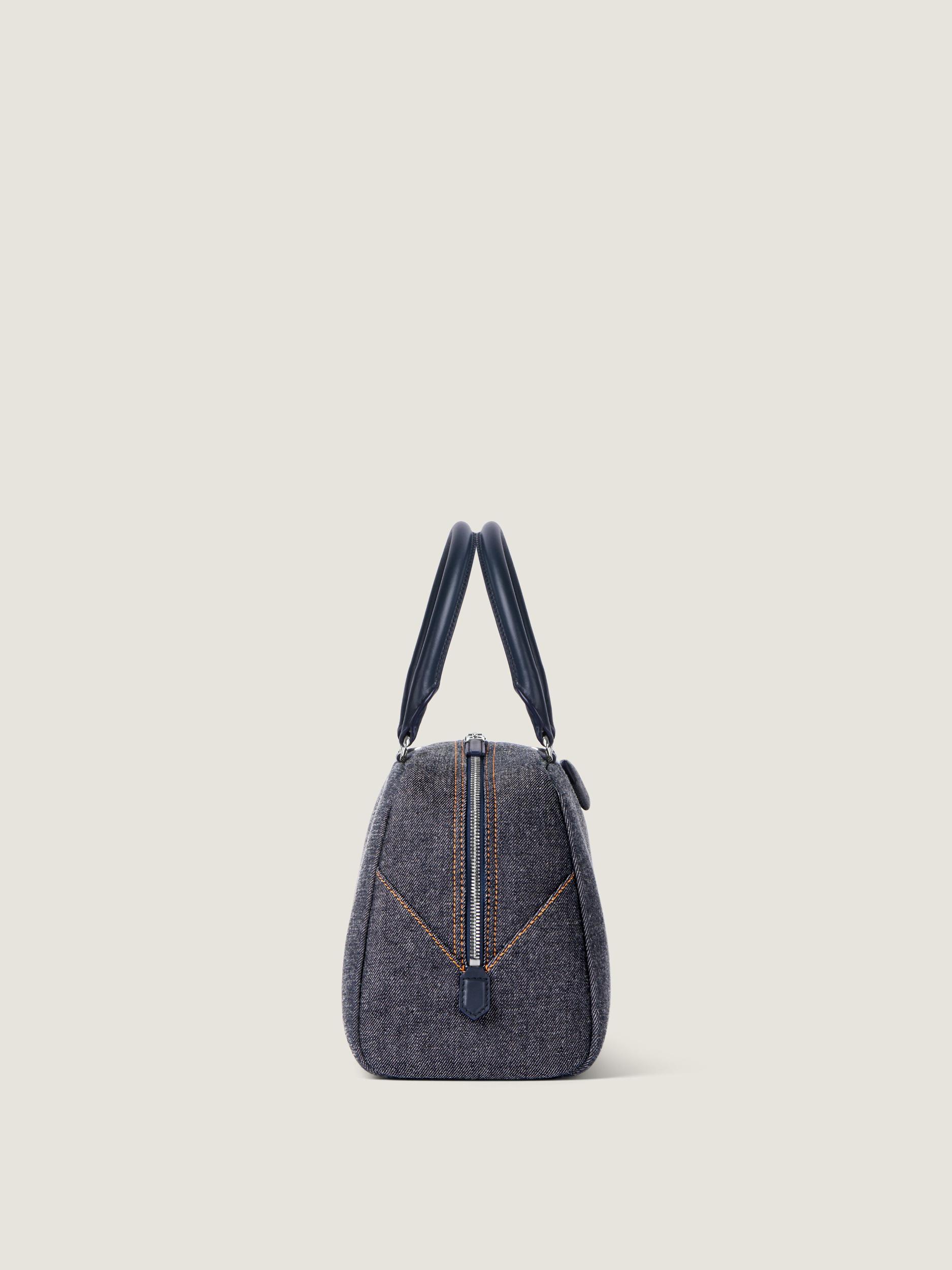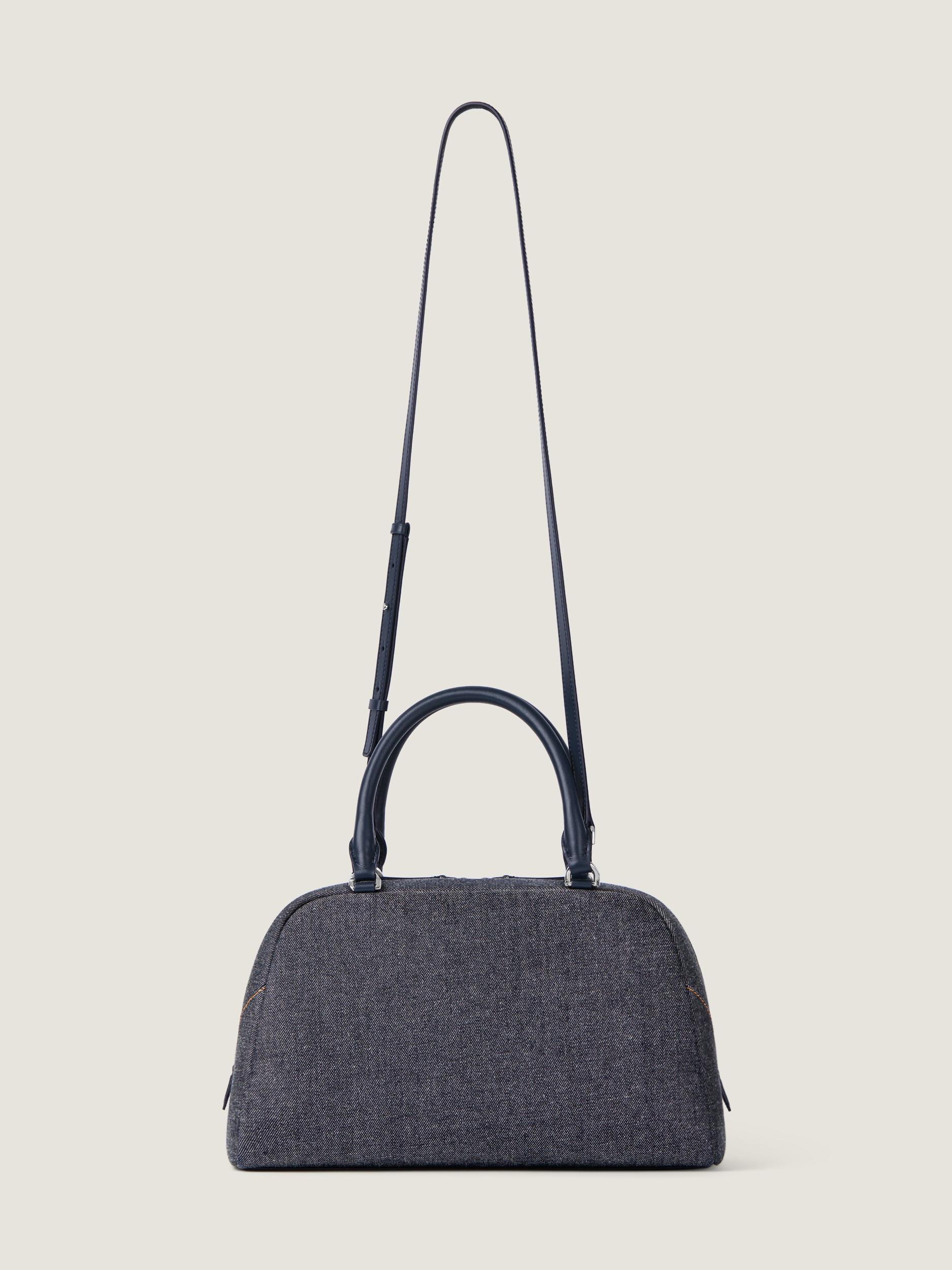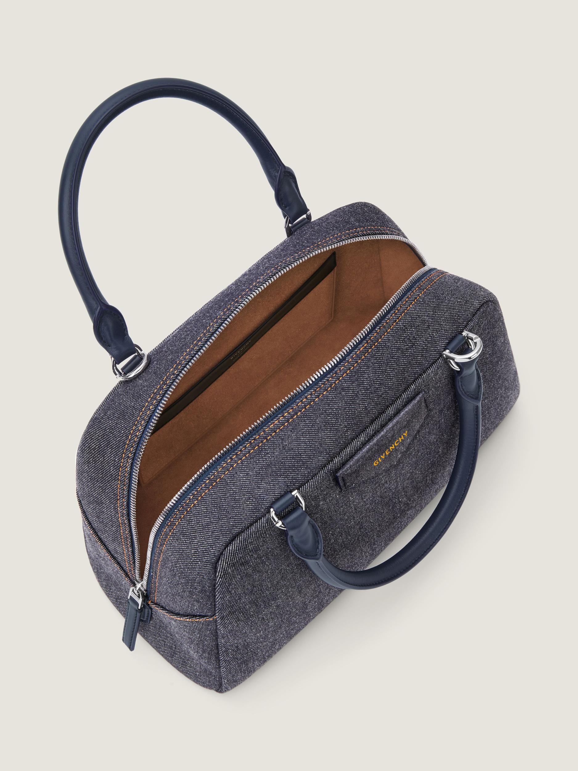 Medium bag in denim with contrasting stitchings. Antigona line. Long East-West shape with origami-style gusset construction. Zipped closure. Hand, shoulder or crossbody carrying. Articulated leather handles with four D-Rings for the shoulder strap. Adjustable and removable denim shoulder strap. Denim pentagonal patch with 3D GIVENCHY signature on the front. GIVENCHY Paris patch on the inside. Silvery-finish metal details. One main compartment with one flat pocket inside. Suede lining.