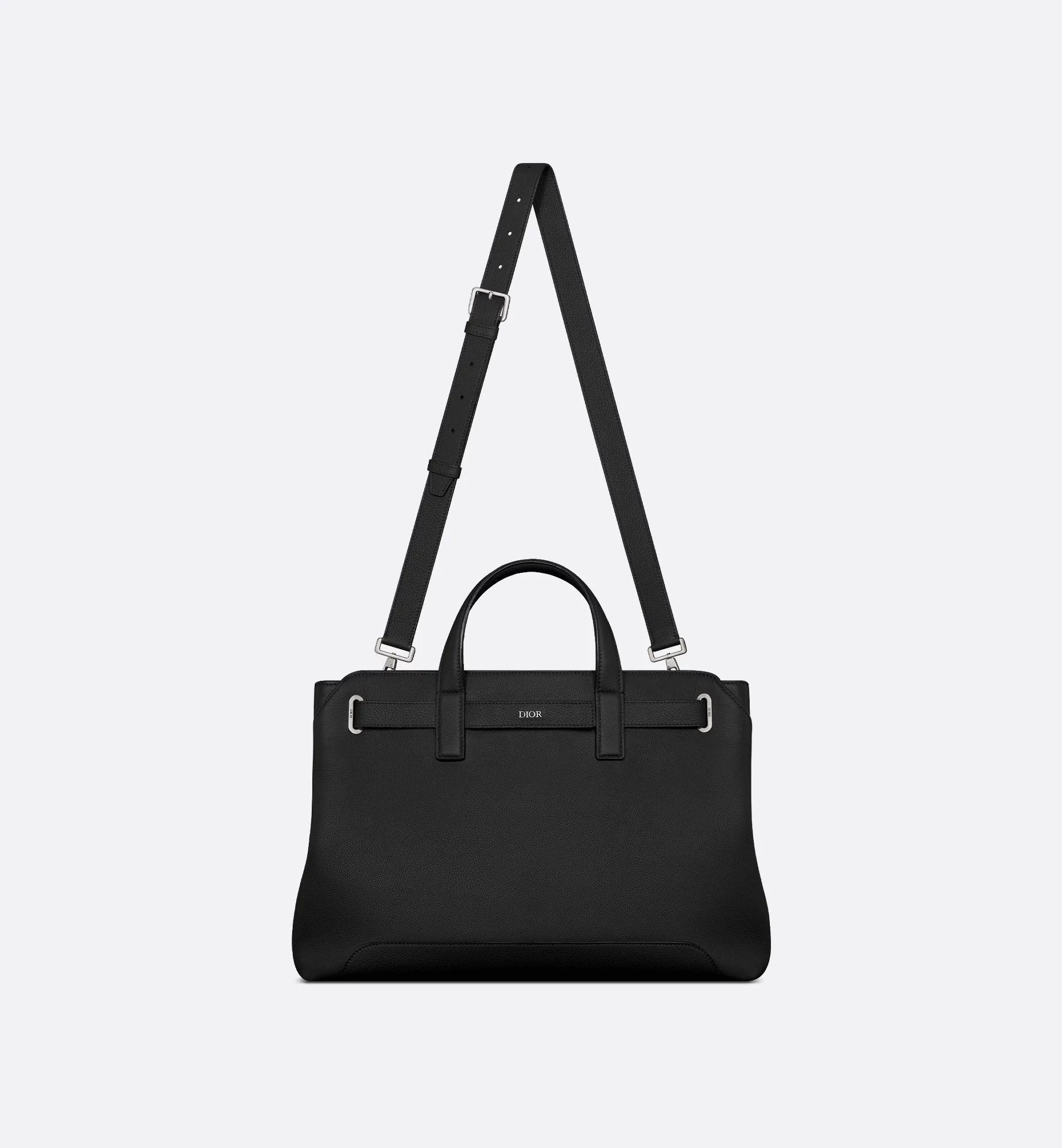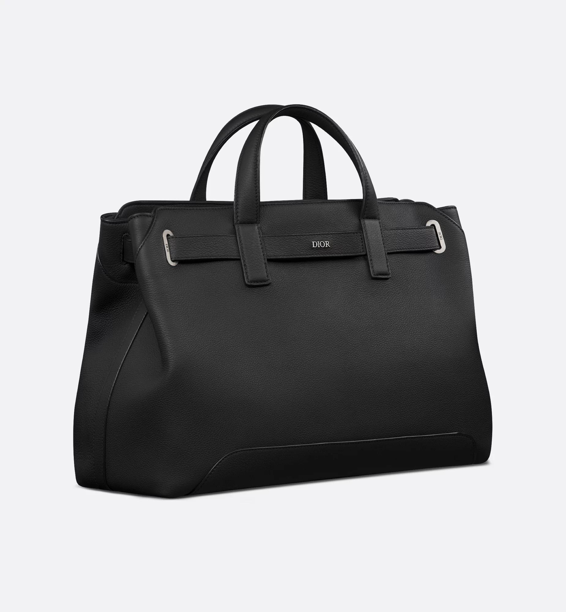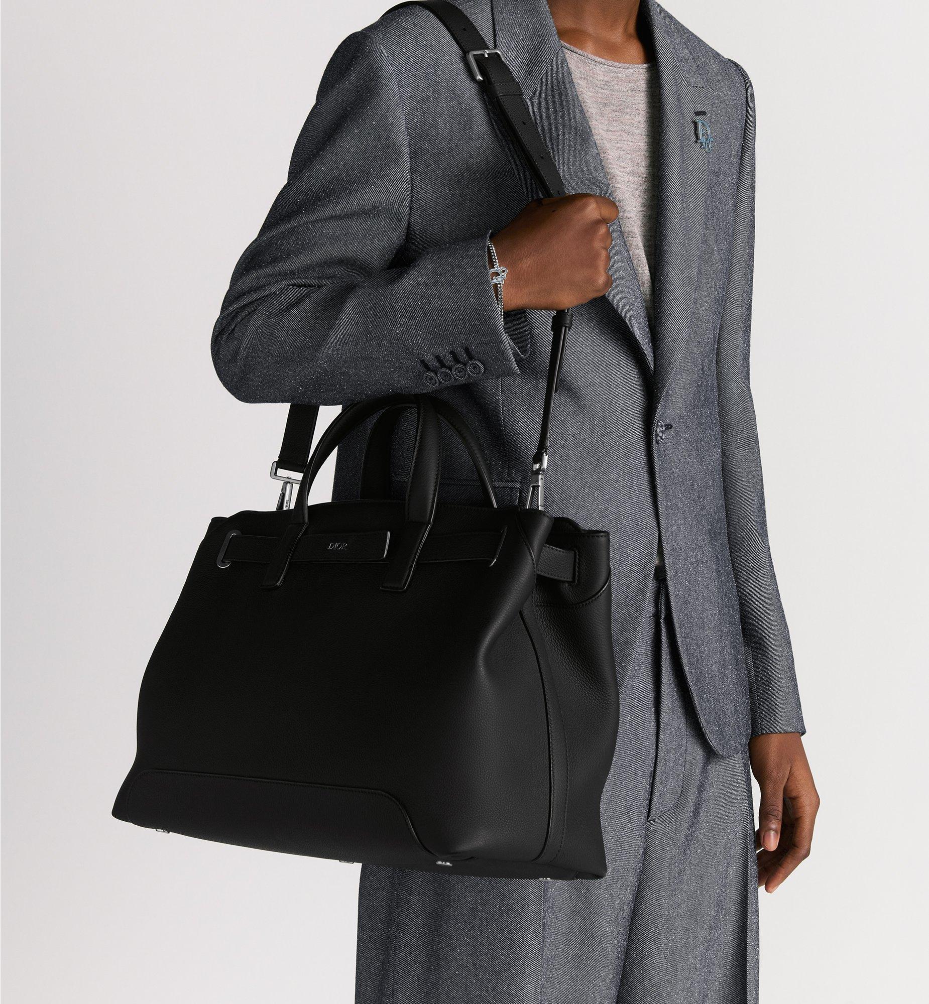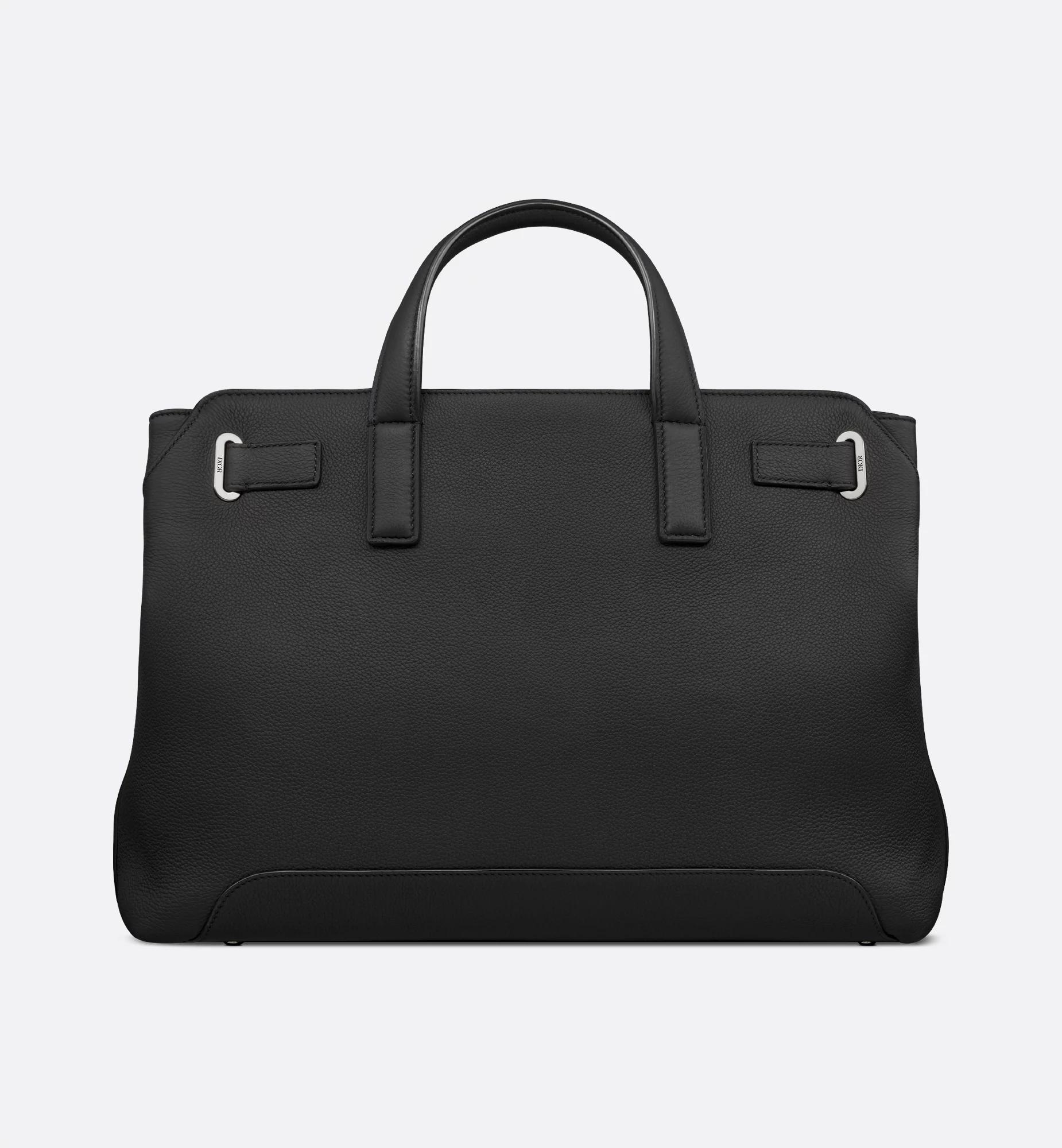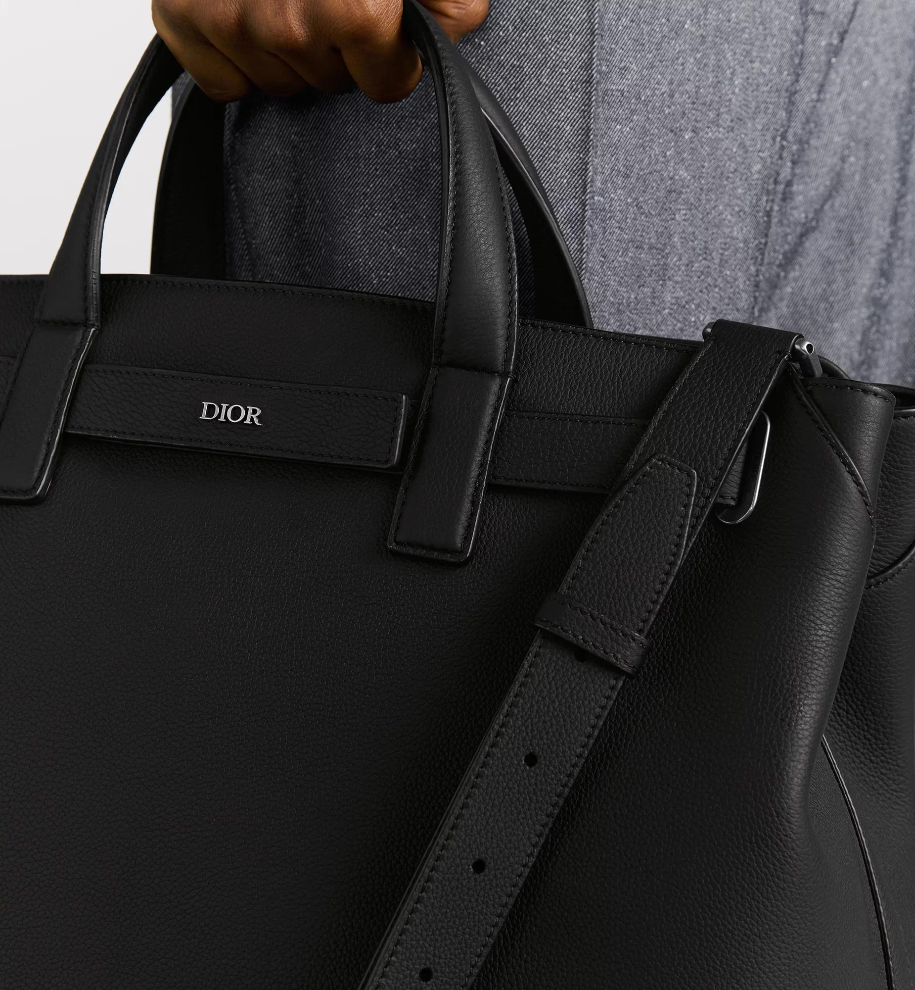 The Dior Normandie tote bag is a creation that combines the House's couture spirit with a practical design. Demonstrating the virtuosity of Dior's ateliers, the black Dior Icons calfskin style is enhanced by Dior Normandie signature eyelets, as well as an adjustable Dior leather strap that can be closed or left open for a laid-back style. Meticulous detailing, like the graphic construction on the sides, Dior-signature feet and cushioned top handles, accentuates its sophisticated appeal. The spacious interior, adorned in a herringbone lining, features two slip pockets and a zip pocket. The medium tote bag is equipped with an adjustable and removable leather strap, allowing it to be carried by hand or worn comfortably over the shoulder. Main composition: calfskin. Cotton and calfskin lining. Open main compartment with leather strap. Interior double slip pocket. Interior zip pocket. Adjustable and removable leather shoulder strap. Cushioned leather top handles. Five metallic feet with Dior signature. Antique silver-finish brass Dior signature on the front. Embossed Dior signature on the interior. Dust bag included. Made in Italy