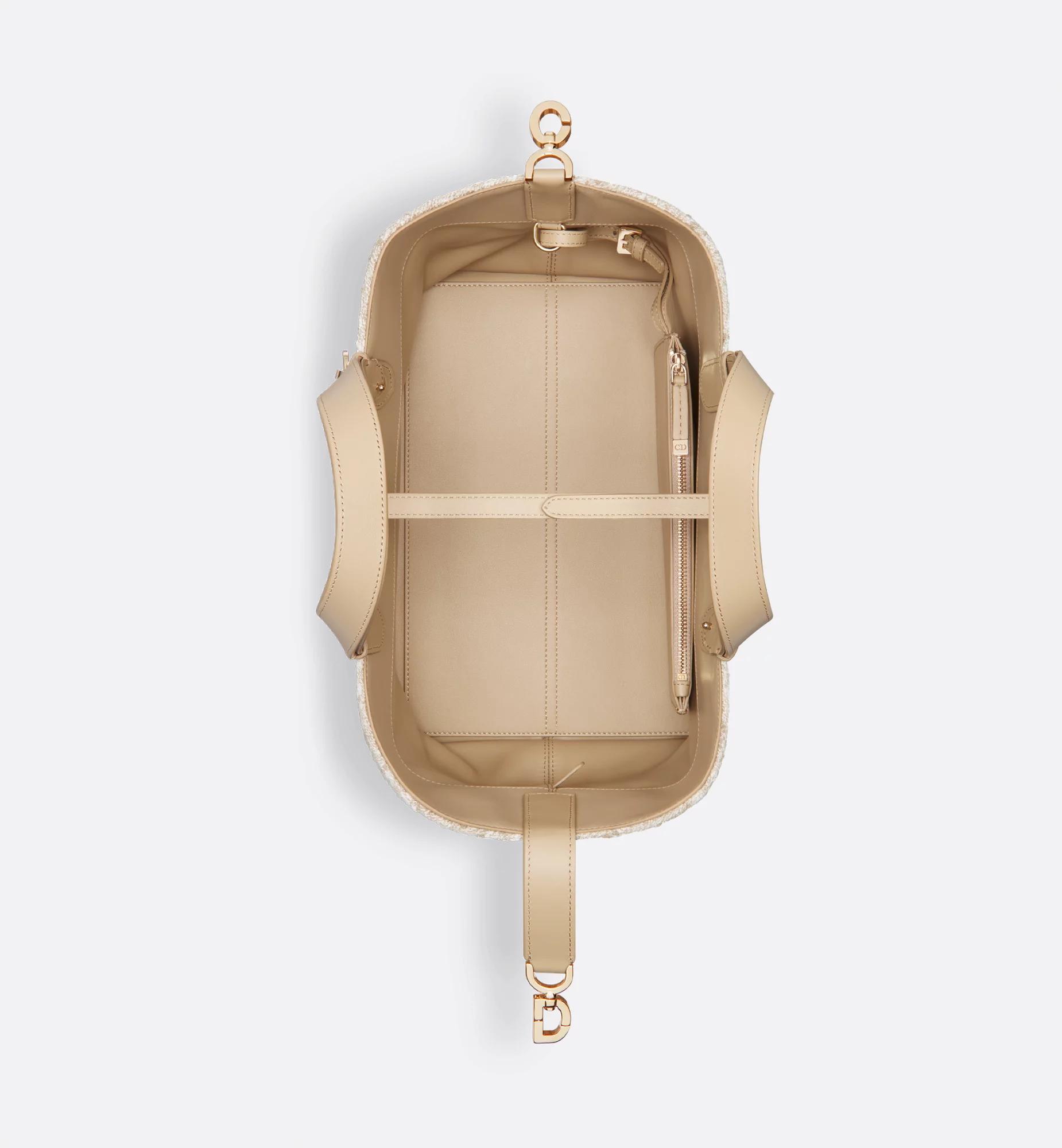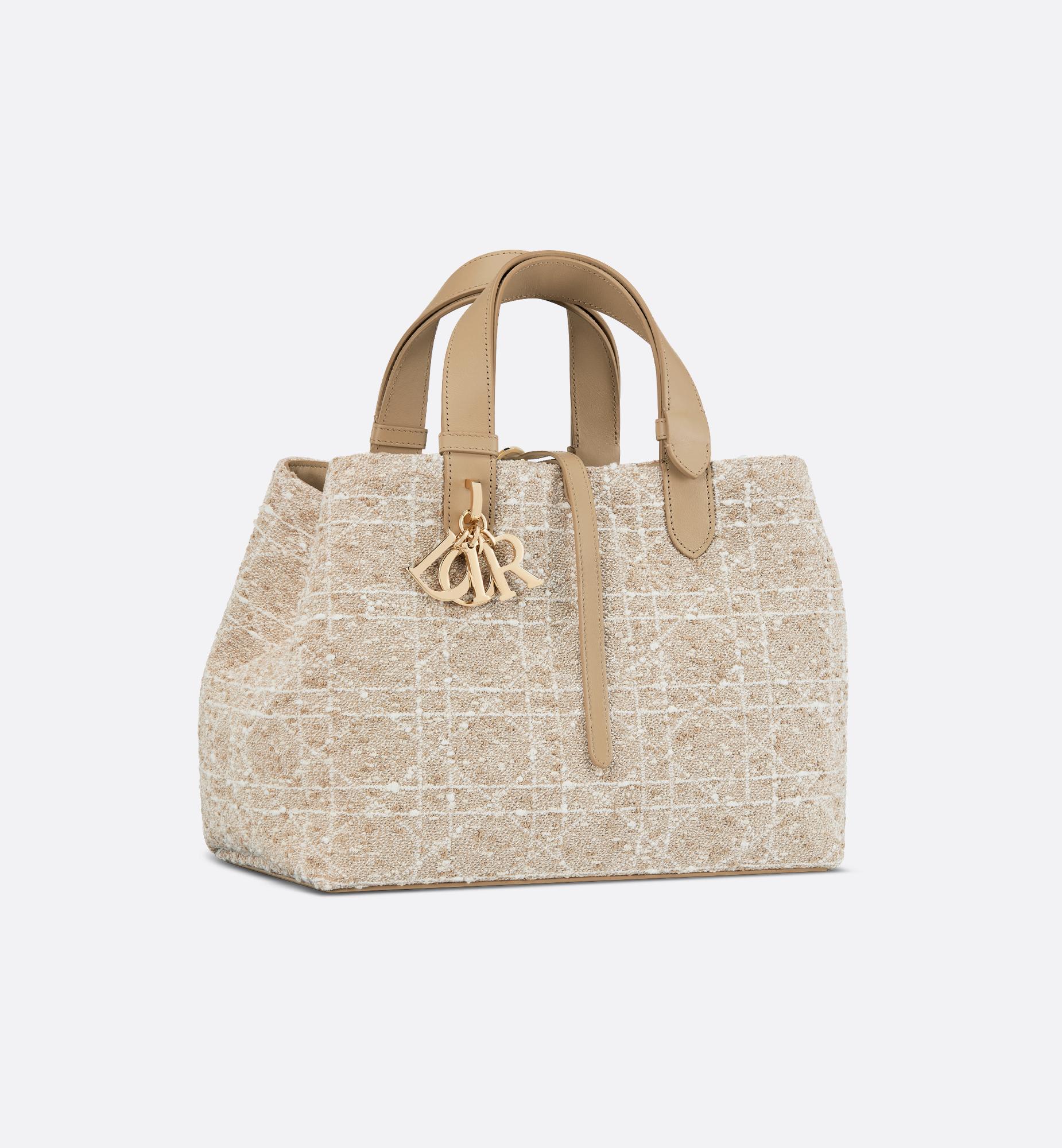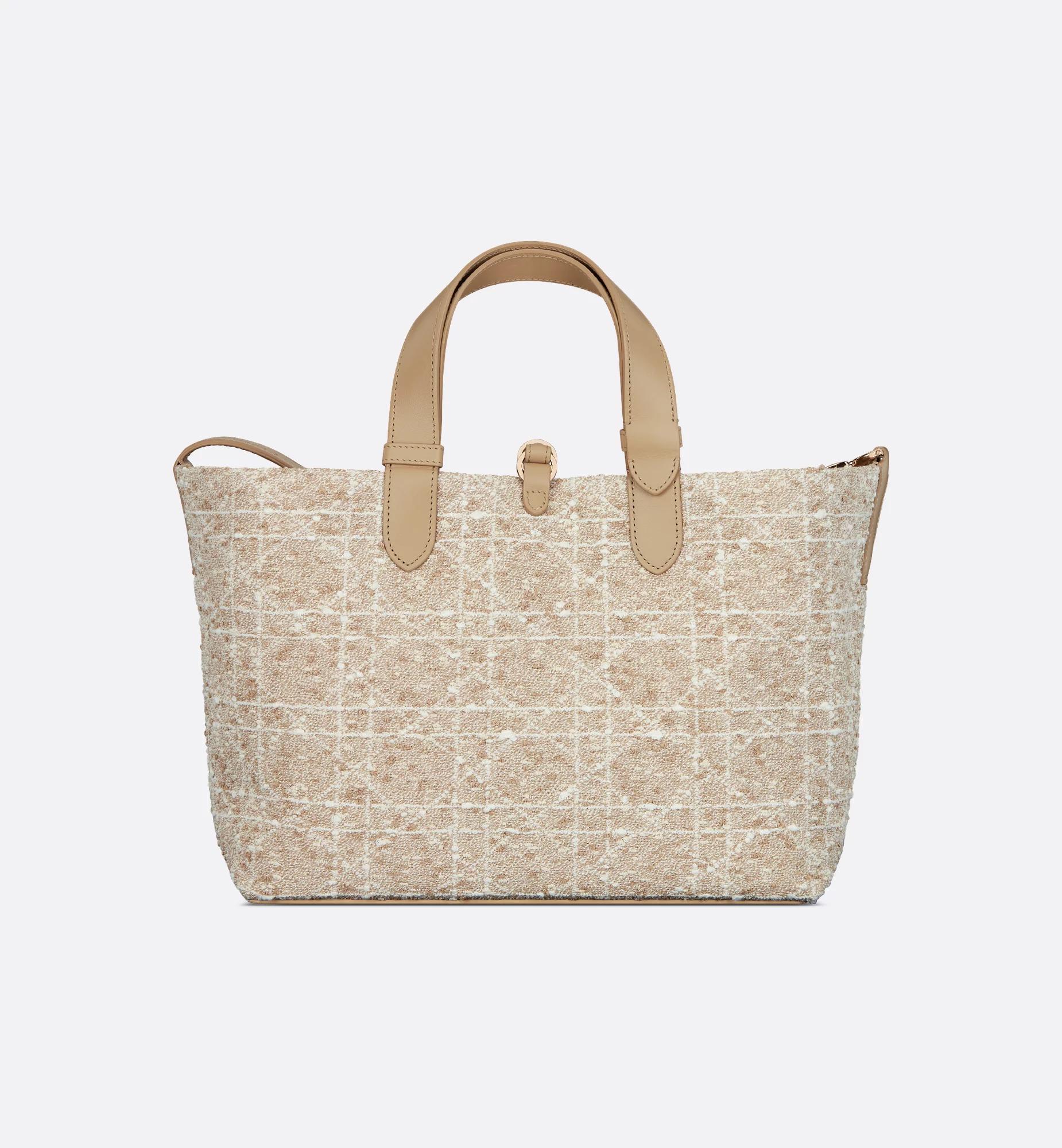 The Dior Toujours bag is distinguished by a casual and practical design. Crafted in light biscuit tweed with a white Cannage motif, the style showcases a spacious interior compartment with a matching pouch to organize the essentials. Its thin leather strap closure keeps items secure while the D of the CD Lock clasp twists to adjust the sides and enhance the bag's silhouette. The leather top handles can be adjusted using the small notches so the medium bag can be carried by hand or worn over the shoulder. Main composition: cotton, calfskin and technical fabric. Calfskin lining. Double closure: a thin lace-through strap and a Christian Dior Paris strap with a CD Lock clasp. Pale gold-finish metal D.I.O.R. charms. Removable interior pouch. Adjustable leather top handles. Dust bag included. Made in Italy