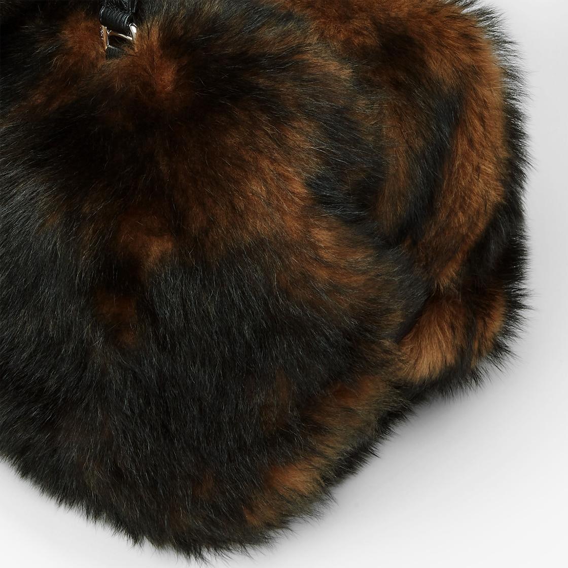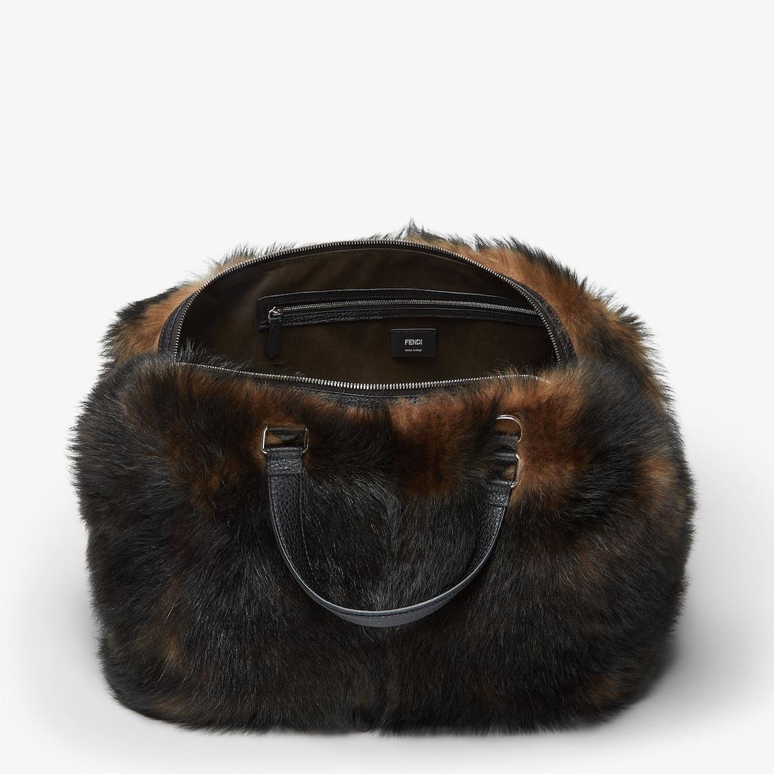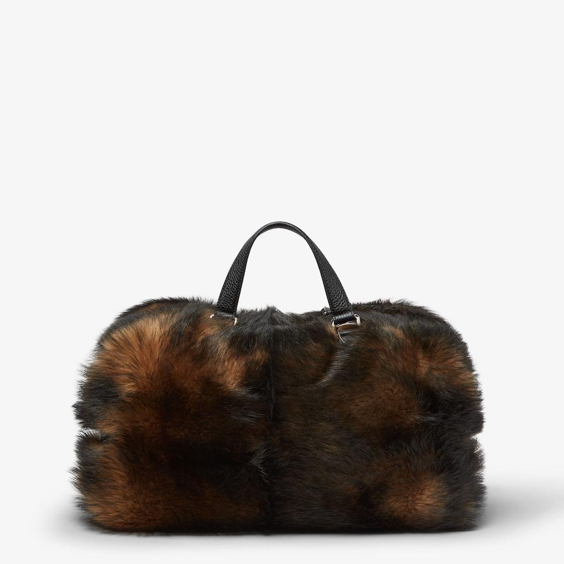 Medium Fendi Siesta travel bag with a pliable design and snap buttons that transform the duffel shape into a flat, soft cushion-inspired design that is easy to take anywhere. Made of fox-effect print shearling in shades of brown and black. Embellished with black leather details. Double-slider zipper closure, lined interior with zipper pocket and palladium-finish metalware. Can be carried by hand or on the shoulder thanks to its handles and the adjustable, detachable leather shoulder strap. Made in Italy