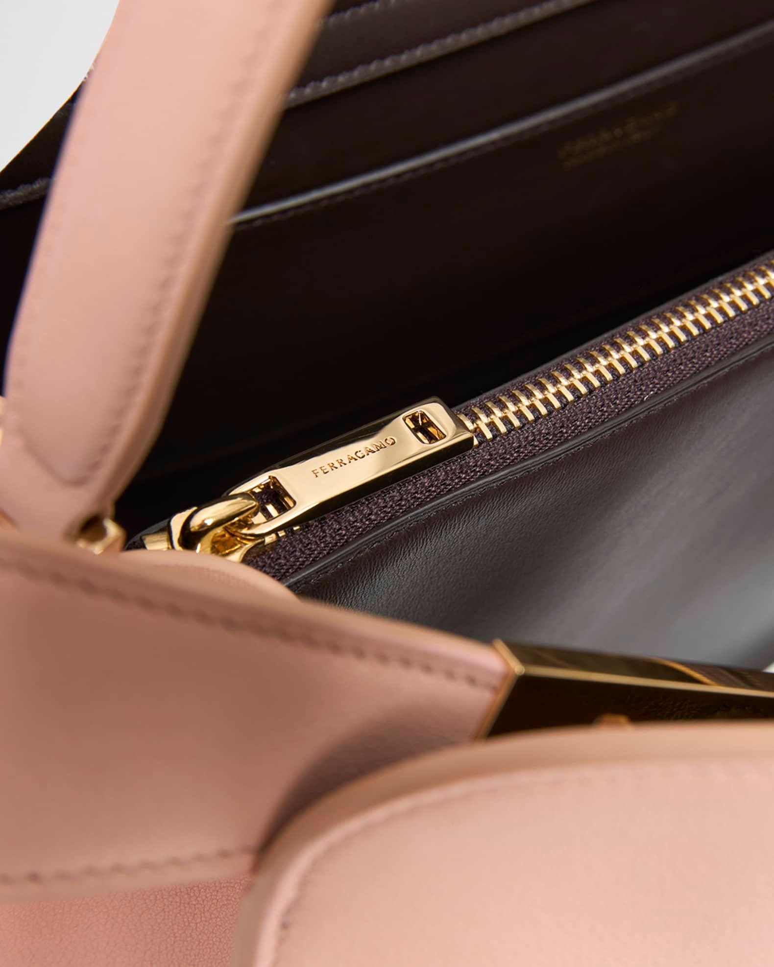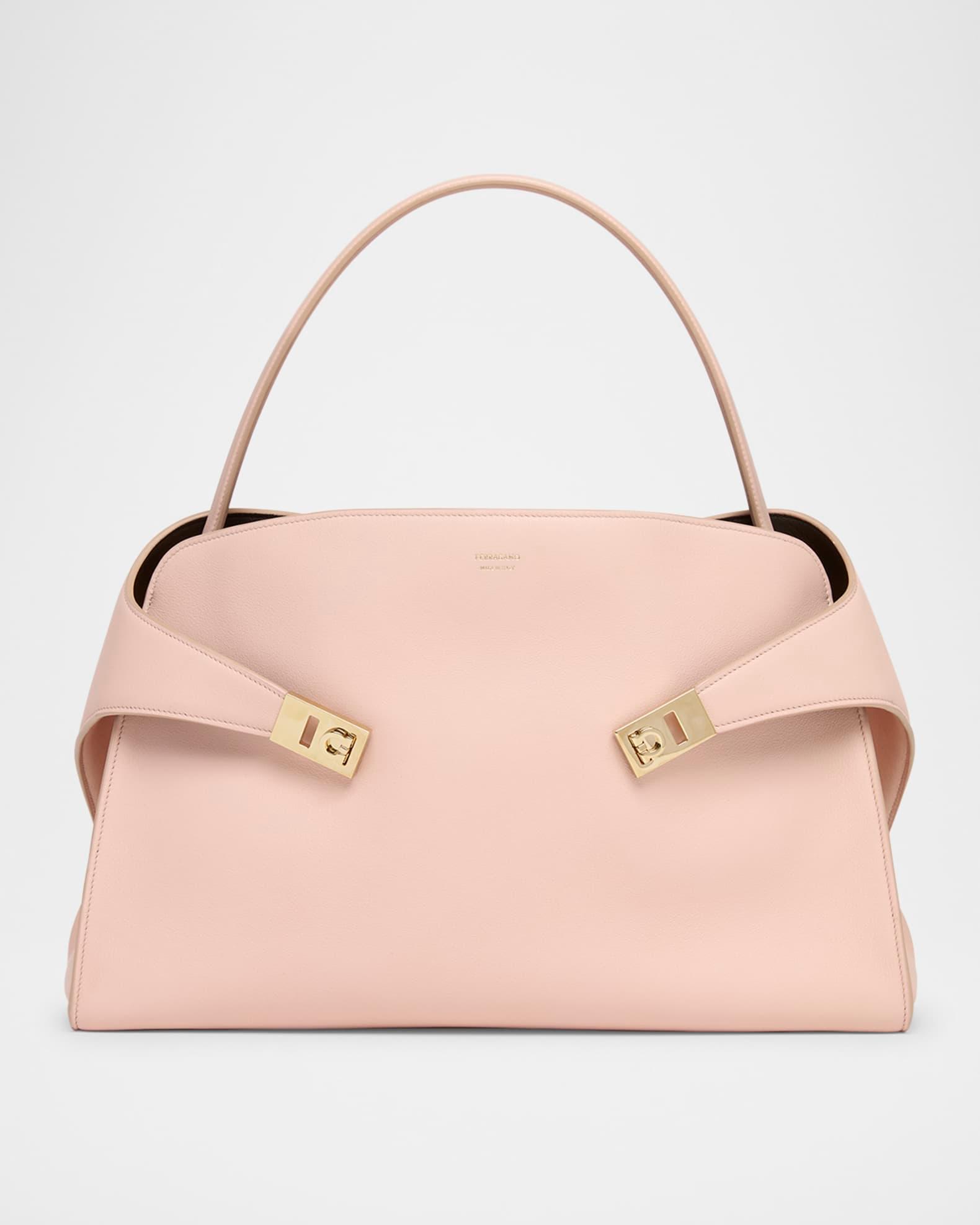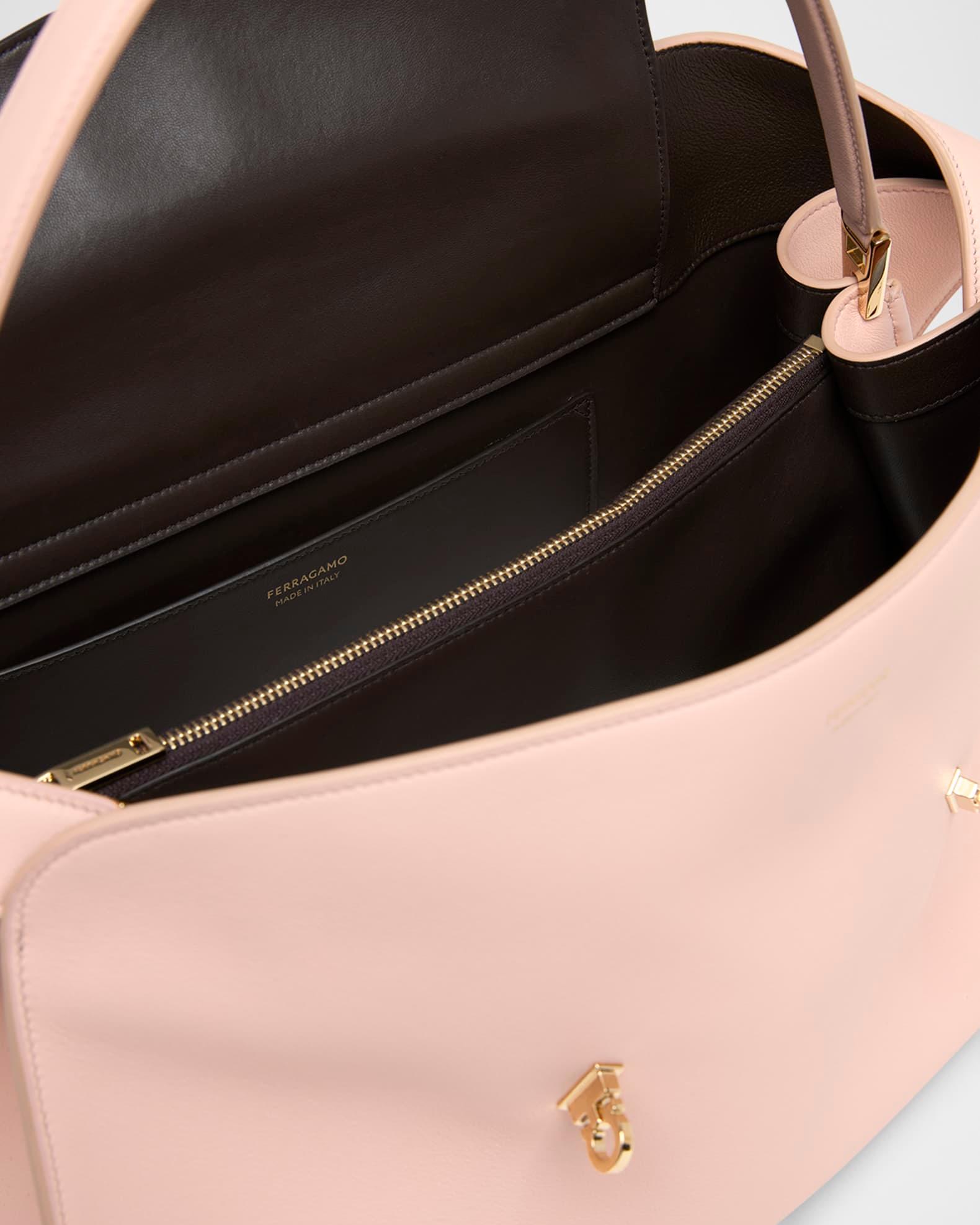 The Hug bag is reimagined in a deconstructed style, giving life to the new Hug soft shoulder bag. Characterized by its unmistakable wrap-around design, this variant features a single handle that adds greater softness to the front quadrant, illuminated by the Gancini buckles in a golden finish. Closed with an internal flap equipped with magnets and a practical t-bar, this medium-sized version features a contrasting interior for a refined color block effect. The central compartment with a zip ensures perfect functionality. Ferragamo "Hug" shoulder bag in smooth calf leather Shoulder strap Open top with side Gancini clasp closures Center zip compartment divides interior; one slip pocket Contrast lining Feet protect bottom of bag Approx. 12"H x 15.7"W x 5.9"D Made in Italy