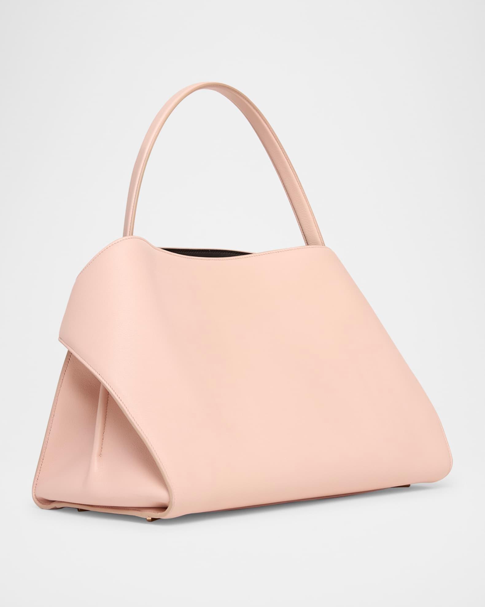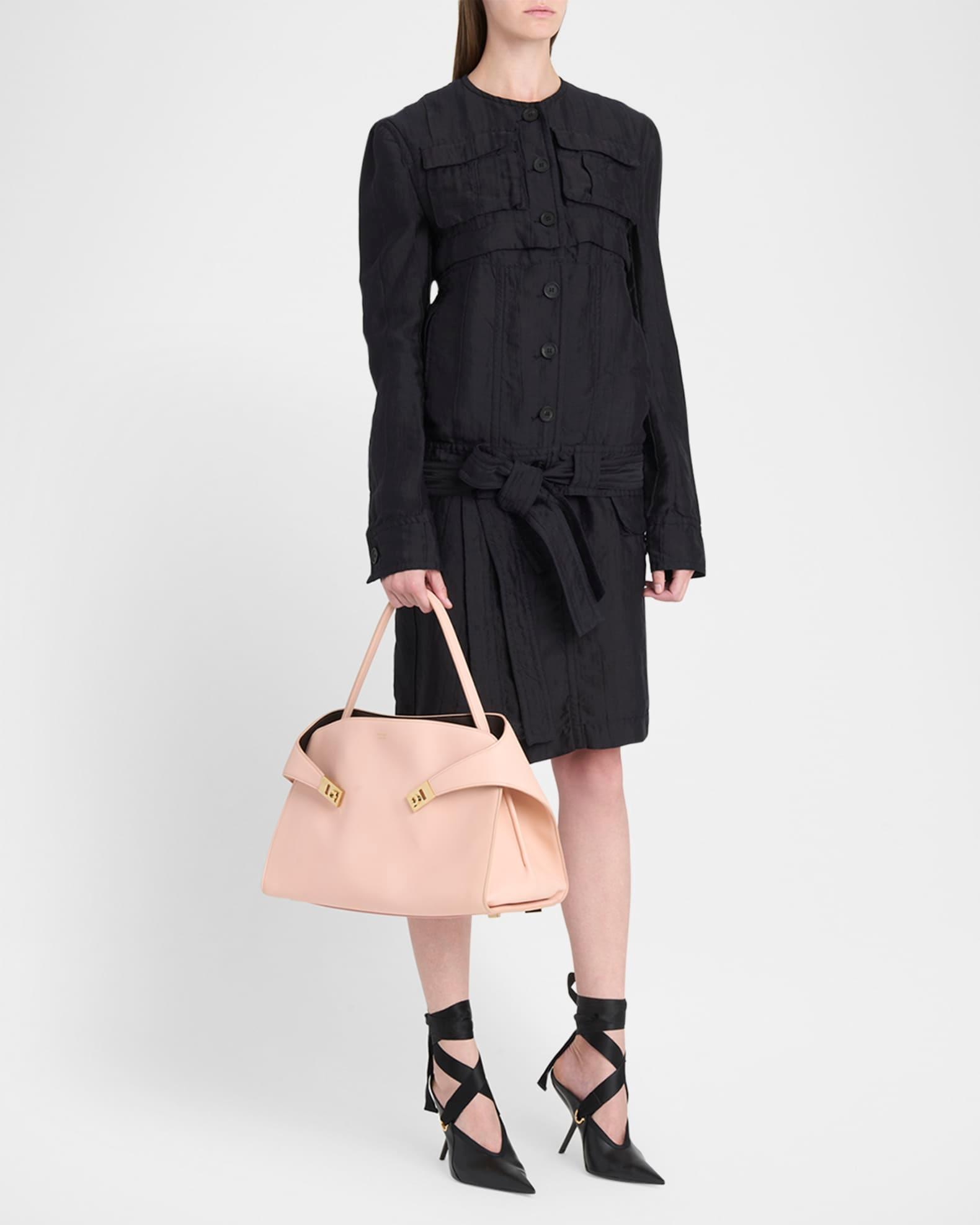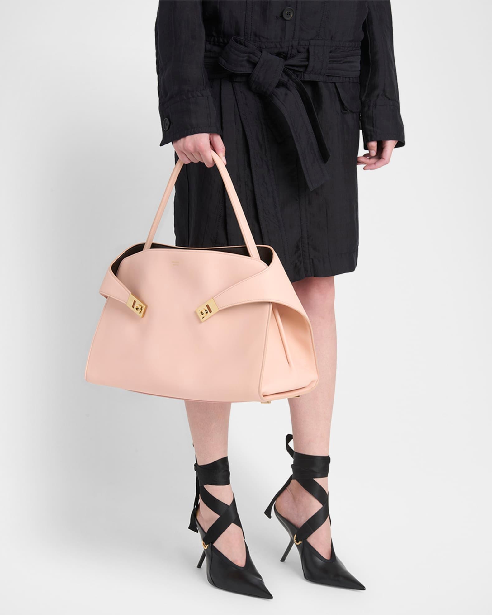 The Hug bag is reimagined in a deconstructed style, giving life to the new Hug soft shoulder bag. Characterized by its unmistakable wrap-around design, this variant features a single handle that adds greater softness to the front quadrant, illuminated by the Gancini buckles in a golden finish. Closed with an internal flap equipped with magnets and a practical t-bar, this medium-sized version features a contrasting interior for a refined color block effect. The central compartment with a zip ensures perfect functionality. Ferragamo "Hug" shoulder bag in smooth calf leather Shoulder strap Open top with side Gancini clasp closures Center zip compartment divides interior; one slip pocket Contrast lining Feet protect bottom of bag Approx. 12"H x 15.7"W x 5.9"D Made in Italy
