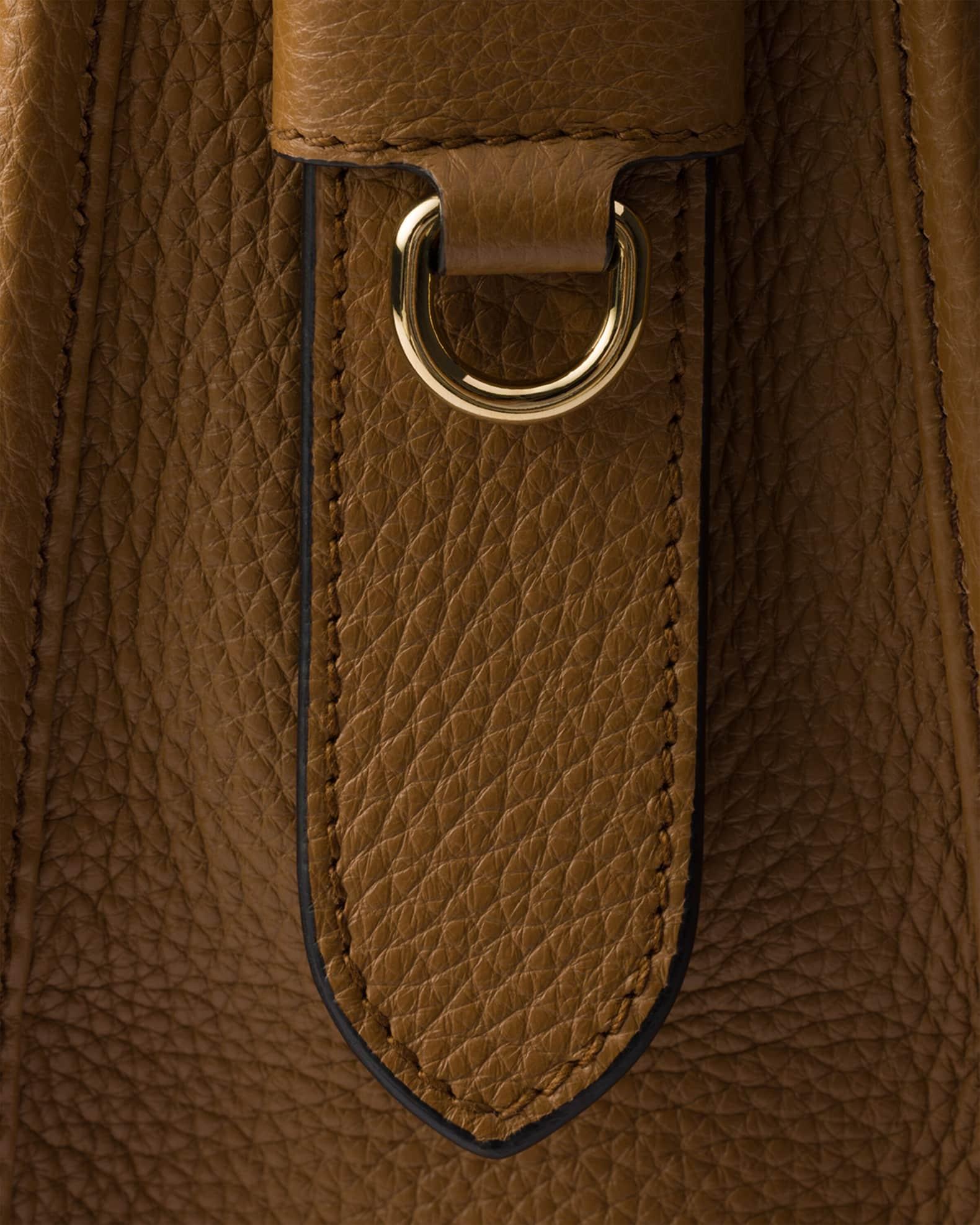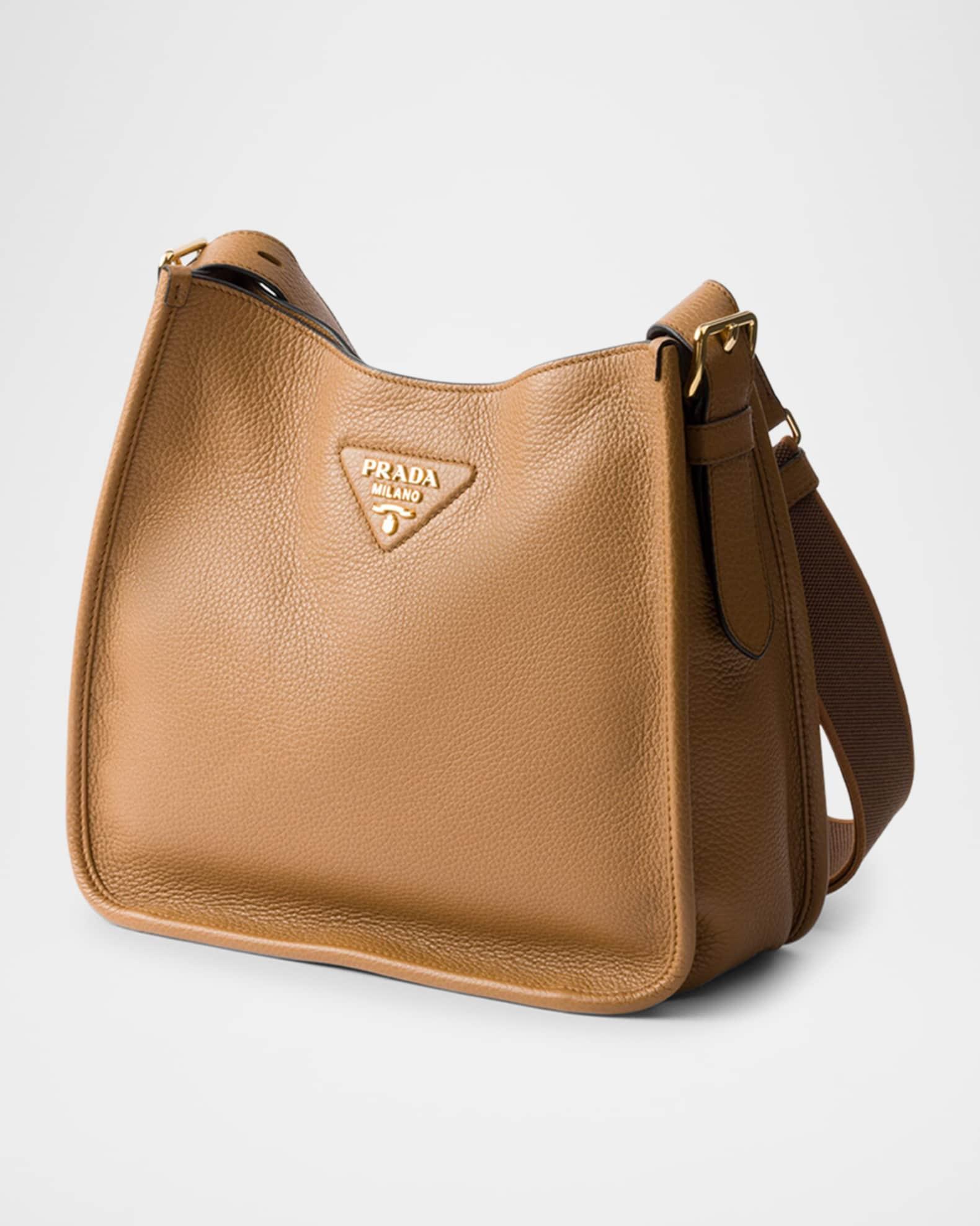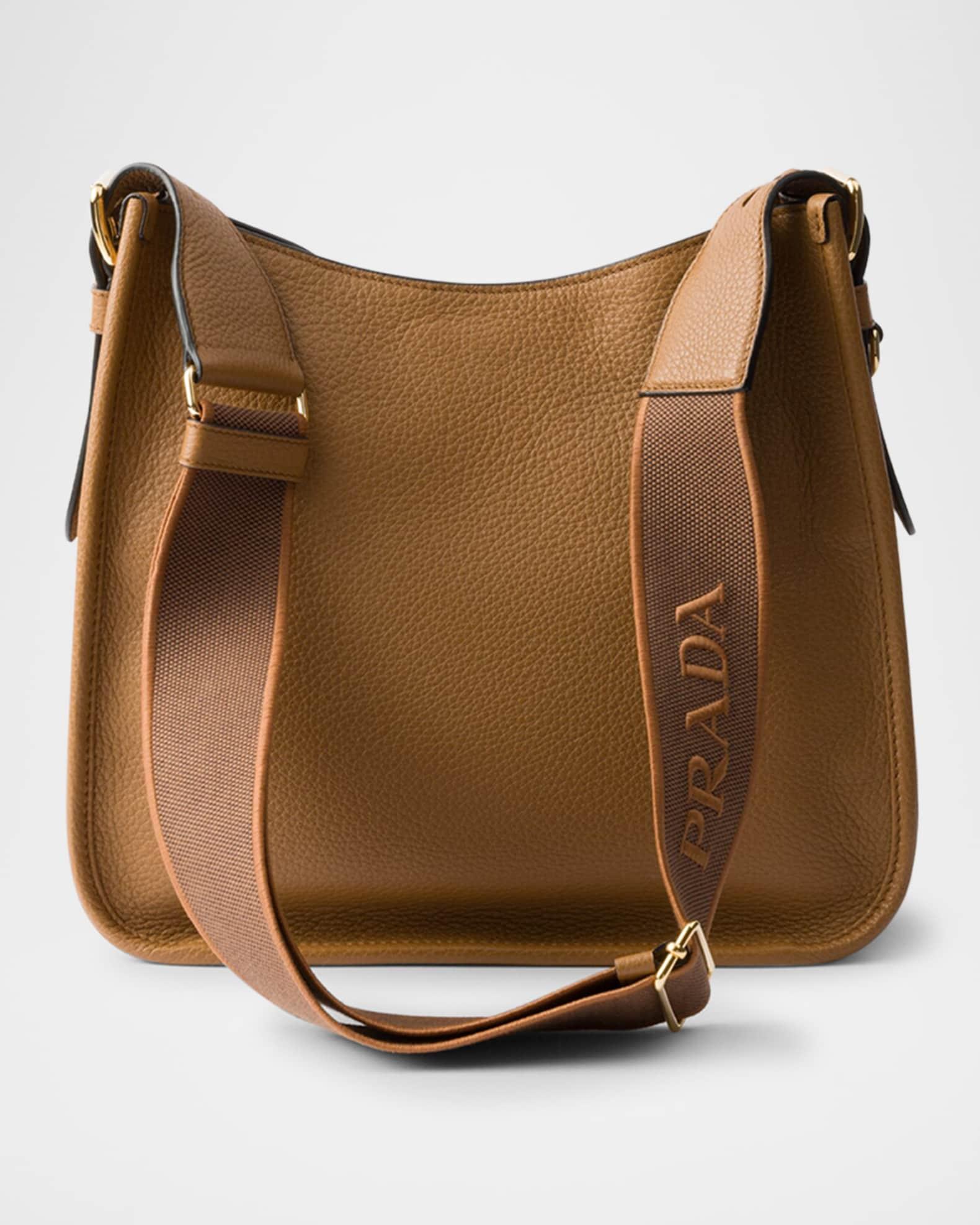 Prada shoulder bag boasts a sleek and functional design in grained leather Iconic triangle logo with metal logo lettering Adjustable logo-print woven tape shoulder strap; 27.56"L Magnetic flap closure Interior, one slip pocket, one zip pocket Logo-print nylon lining Metal hardware Approx. 10.24"H x 11.02"W x 4.33"D Imported